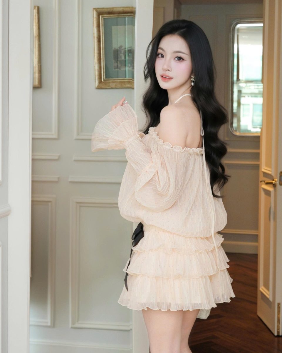 ✔️ Thiết kế: Áo lệch vai tay dài ôm dáng với chi tiết xoắn vai quyến rũ, phối cùng chân váy chữ A xếp tầng bèo nhún trẻ trung.