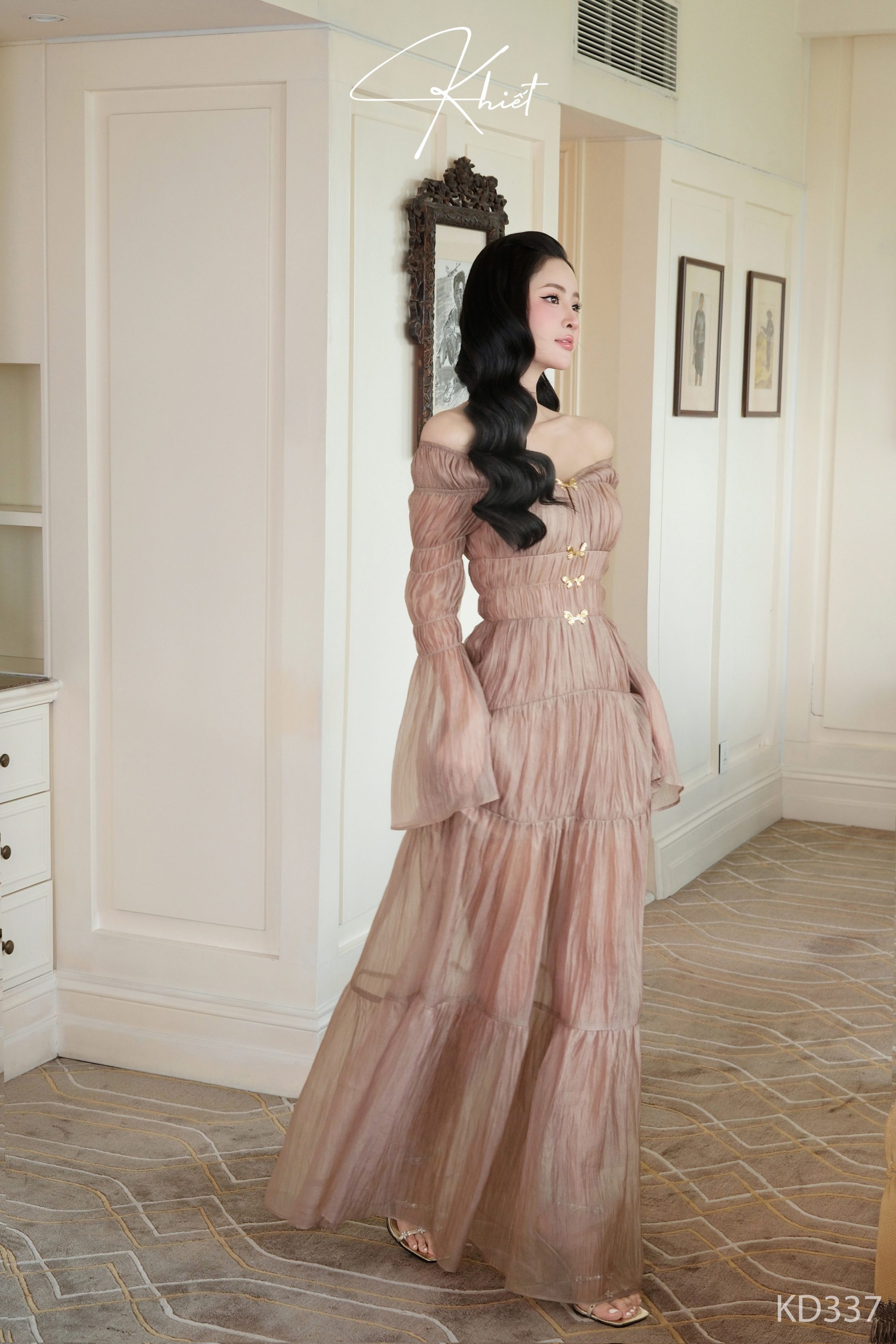 Đánh giá KD337 – Đầm maxi tơ óng chia tầng sang trọng, điểm nhấn charm hồ điệp ánh vàng