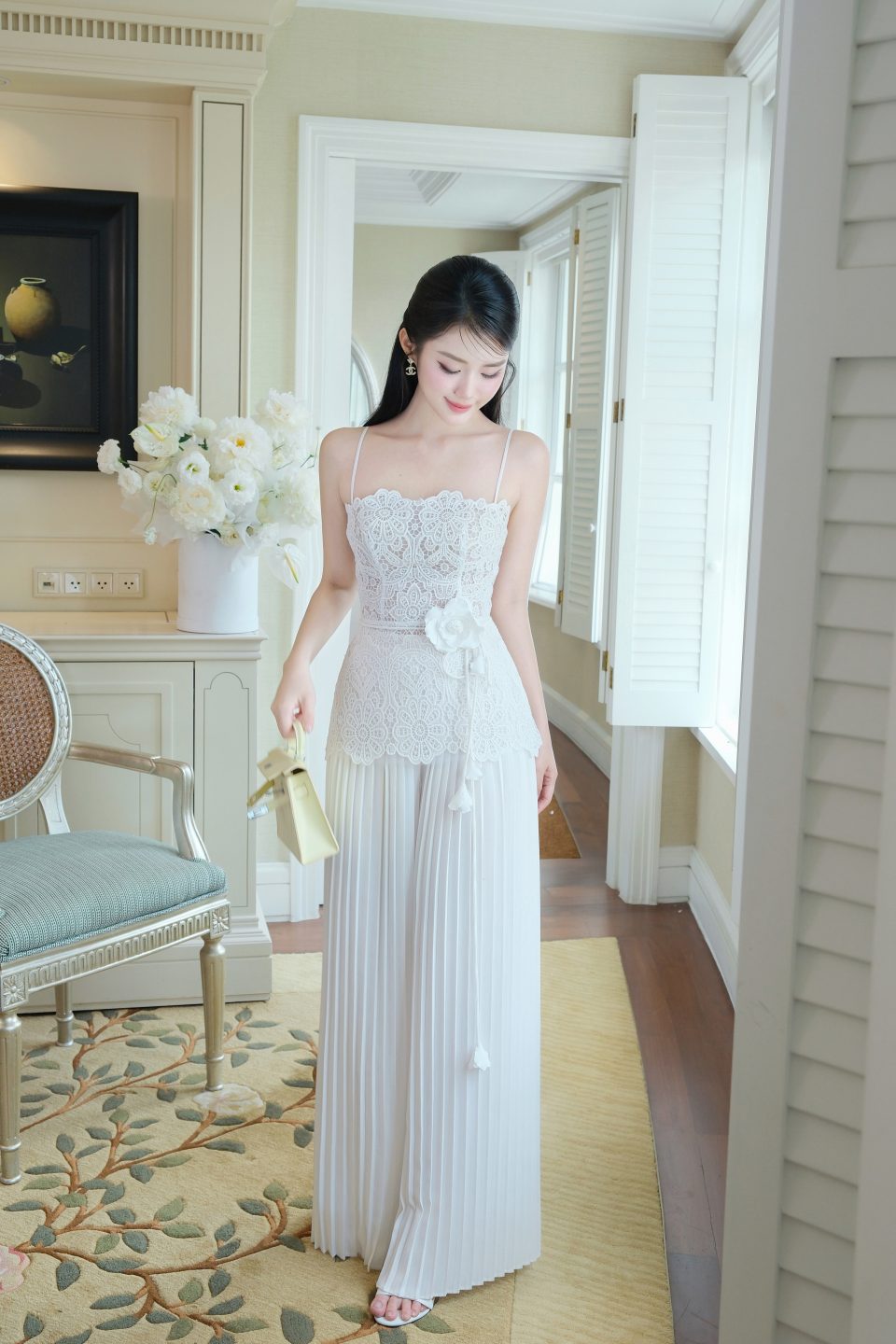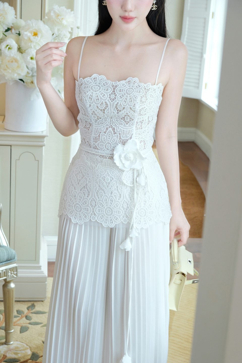 ✔️ Thiết kế: Áo 2 dây peplum phối hoa đá – chân váy dài dập ly