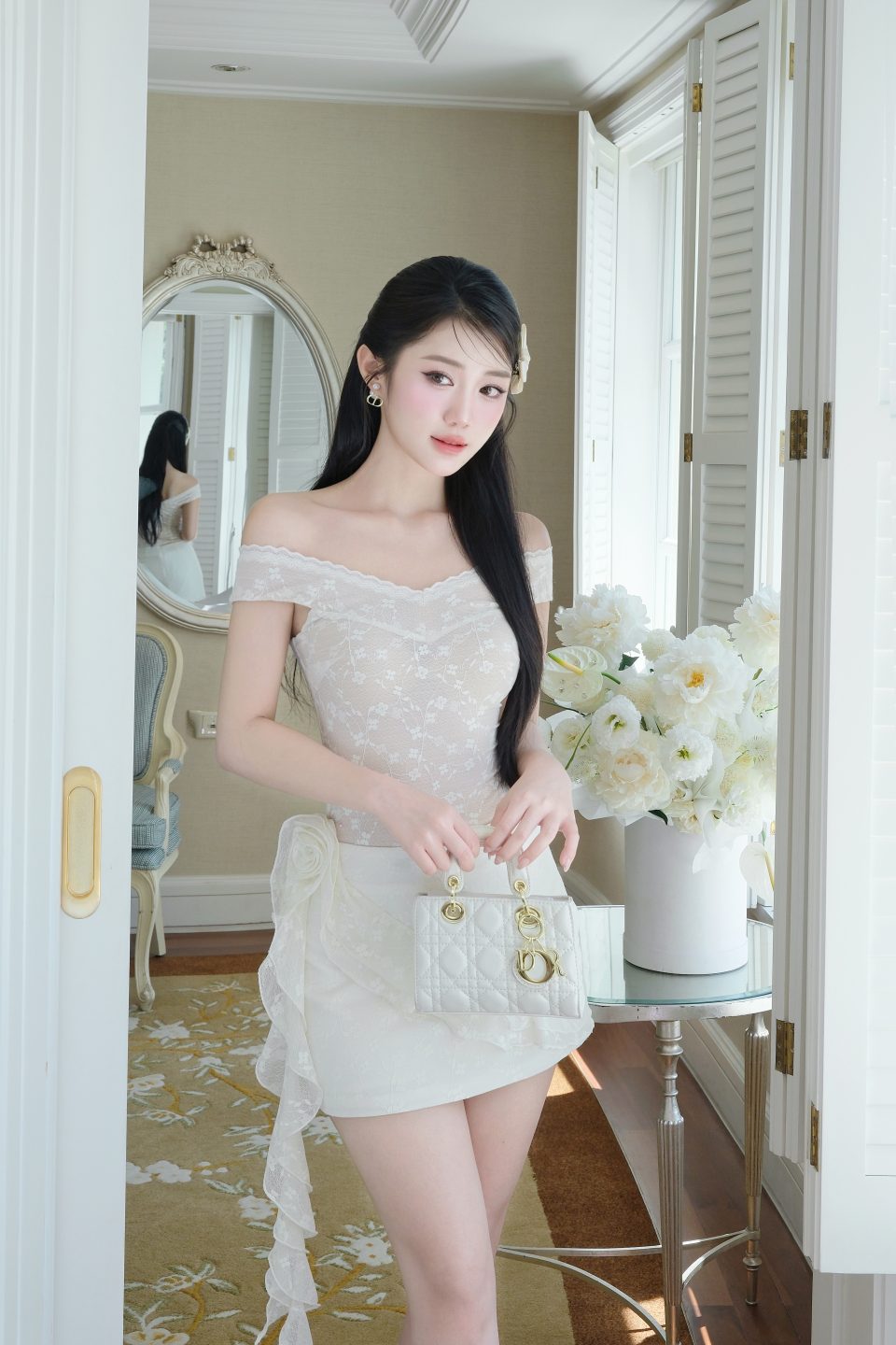 ✔️ Chất liệu: Áo tằm dập ly phối ren, chân váy tafta ánh nhẹ