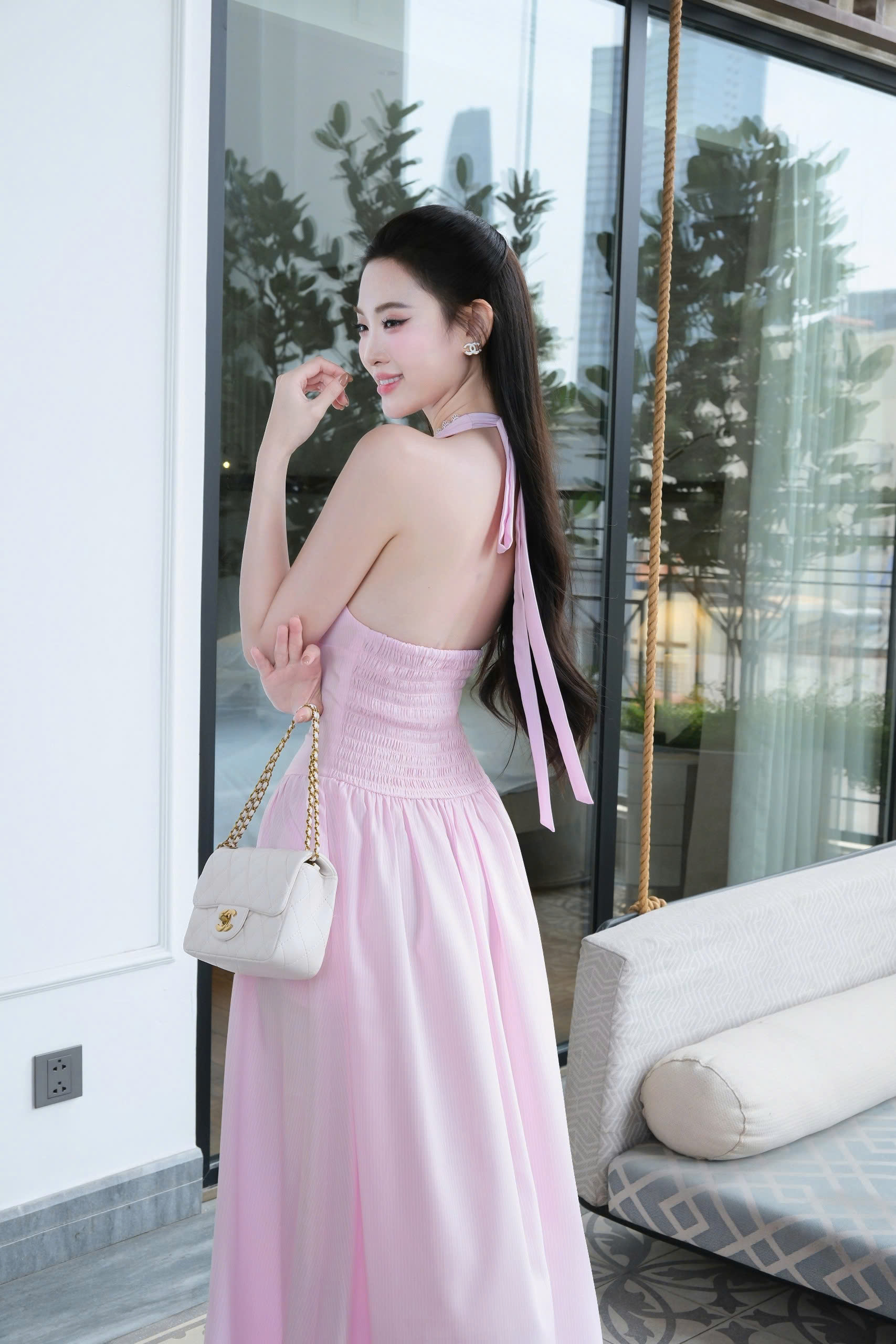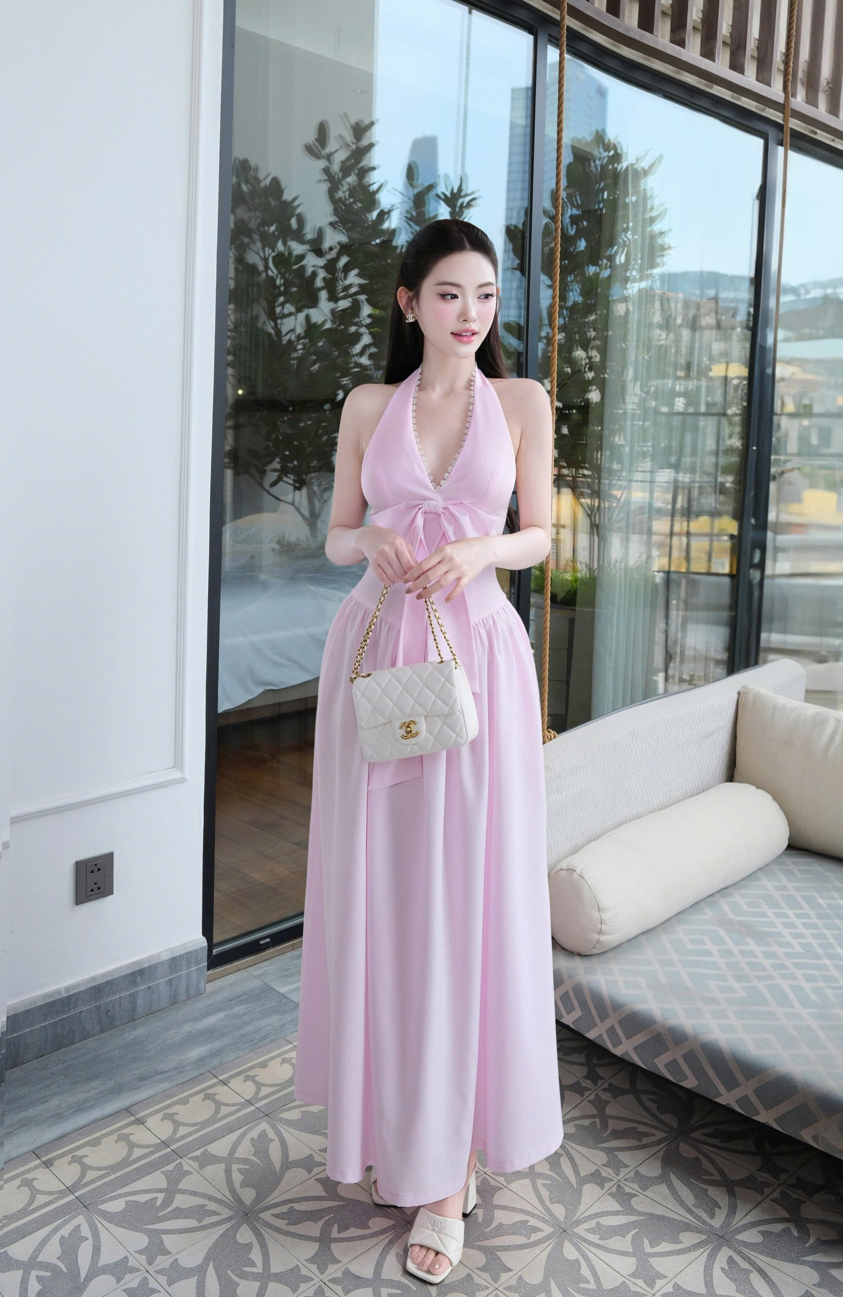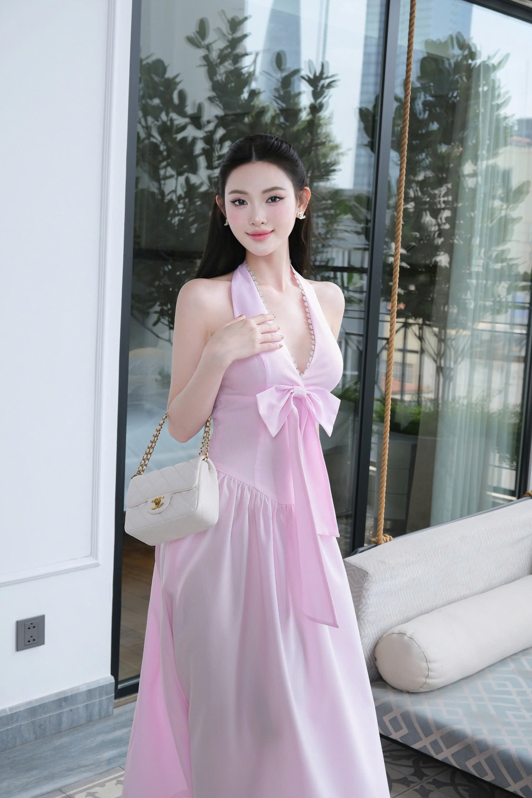 KD166A là phiên bản hồng ngọt ngào của mẫu đầm cổ yếm KD166, mang phong cách nữ tính, nhẹ nhàng và vô cùng cuốn hút. Thiết kế maxi dáng dài với phần chân váy xòe bồng giúp mỗi bước đi đều thướt tha, mềm mại. Phần cổ yếm cột dây sau gáy khoe trọn bờ vai thanh thoát, phối cùng chiếc nơ bản to giữa thân váy tạo điểm nhấn nổi bật.