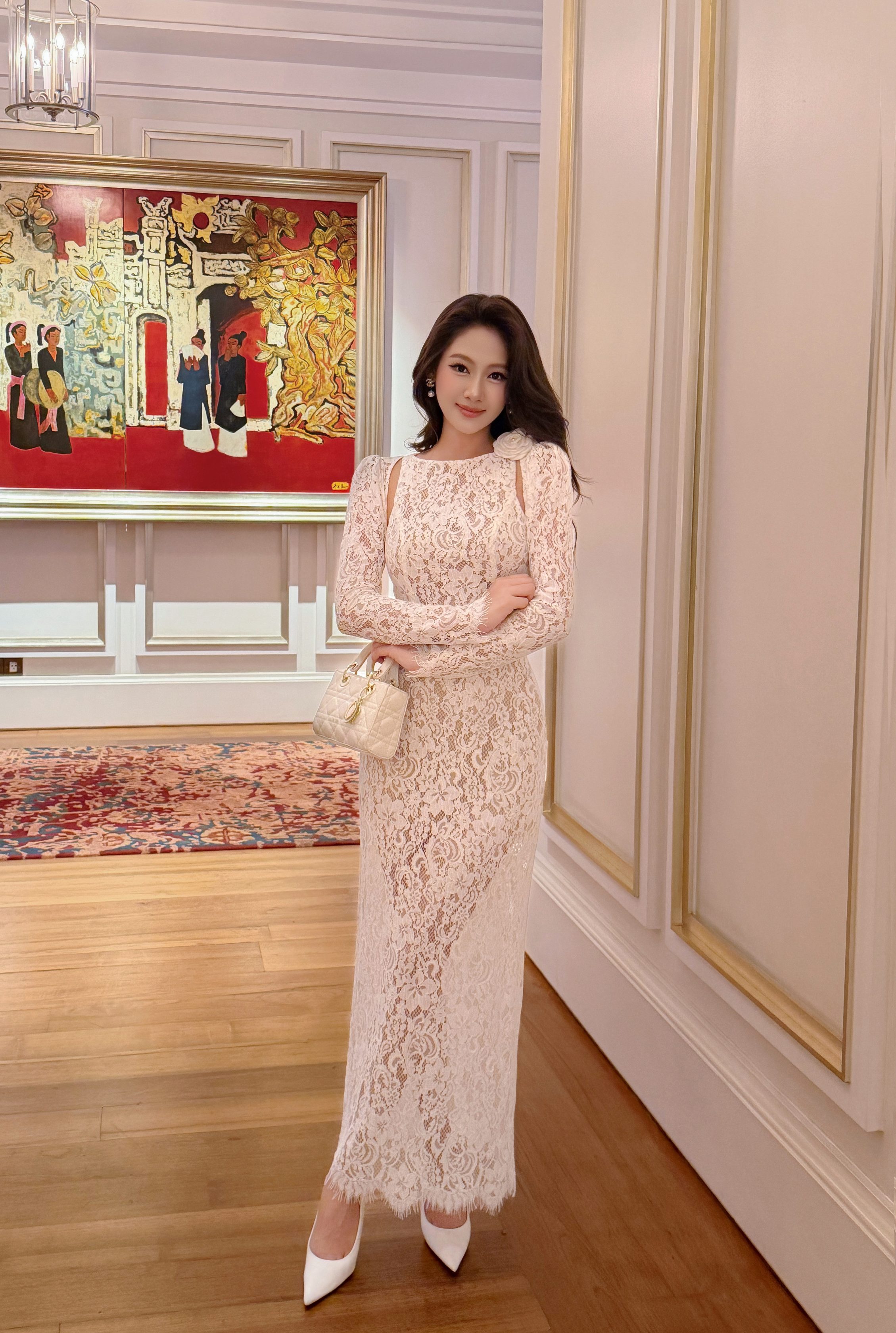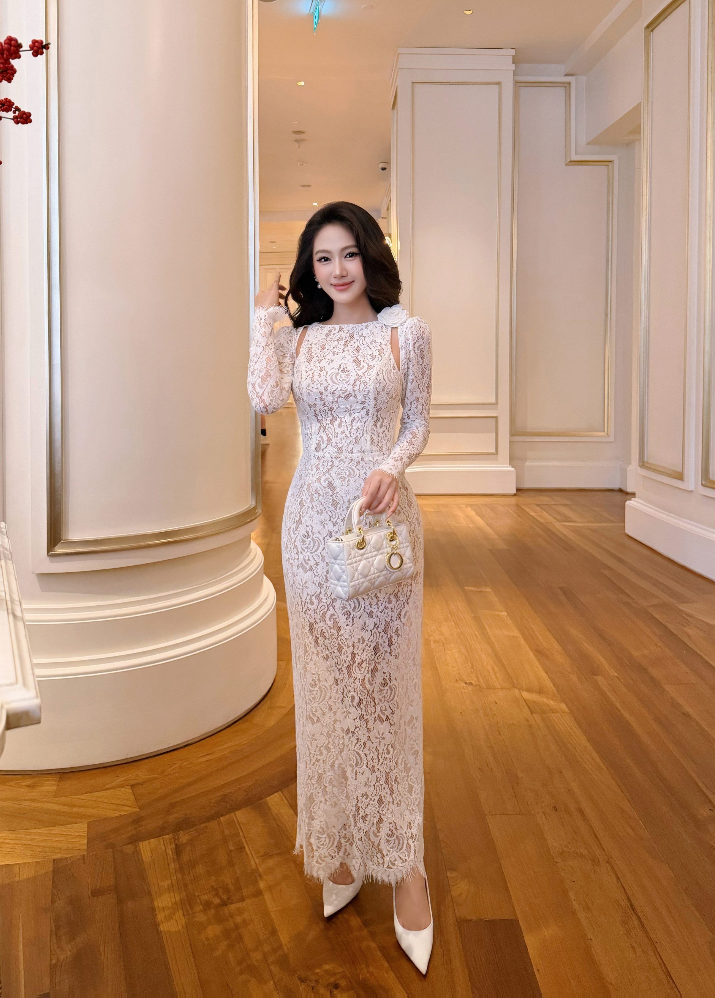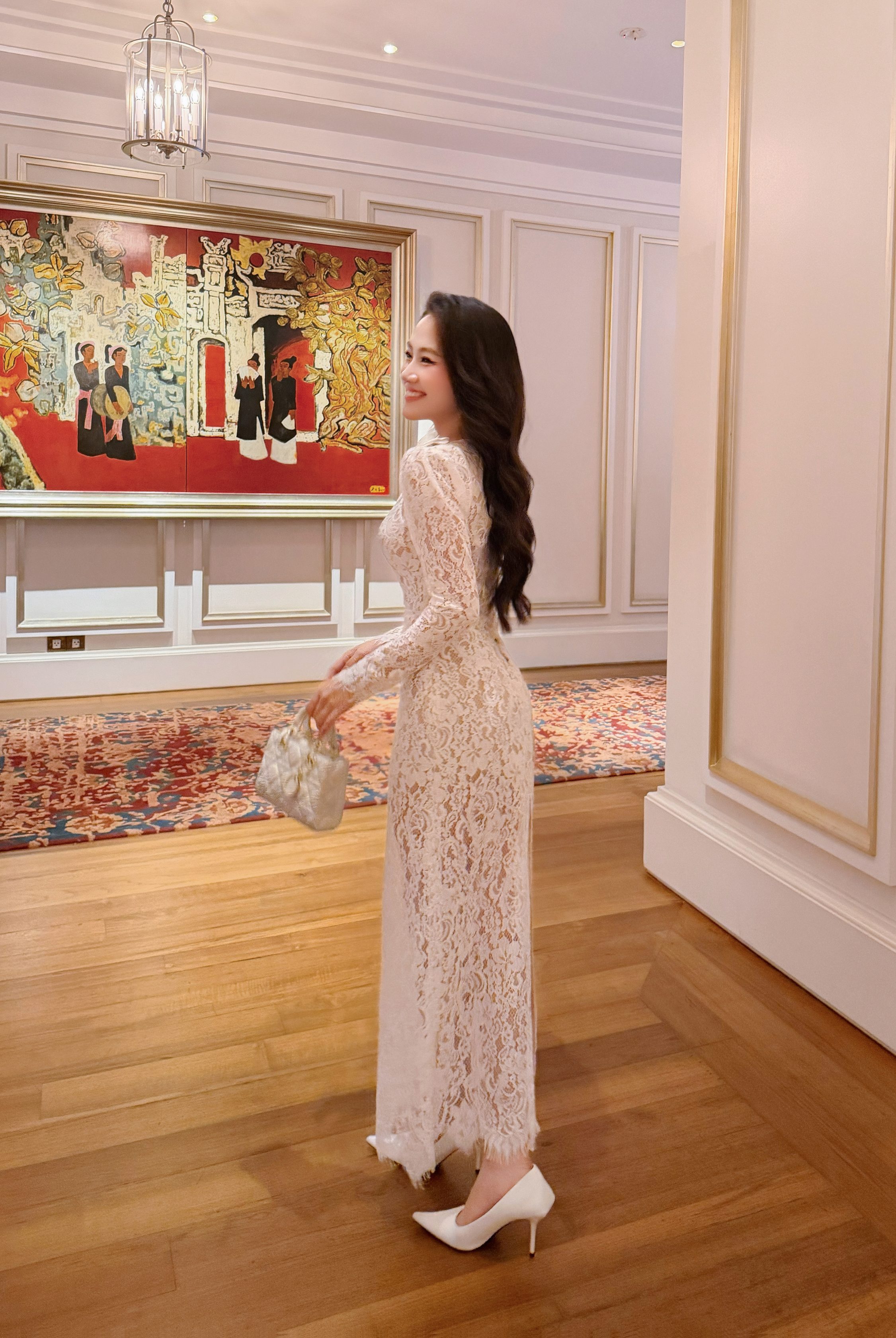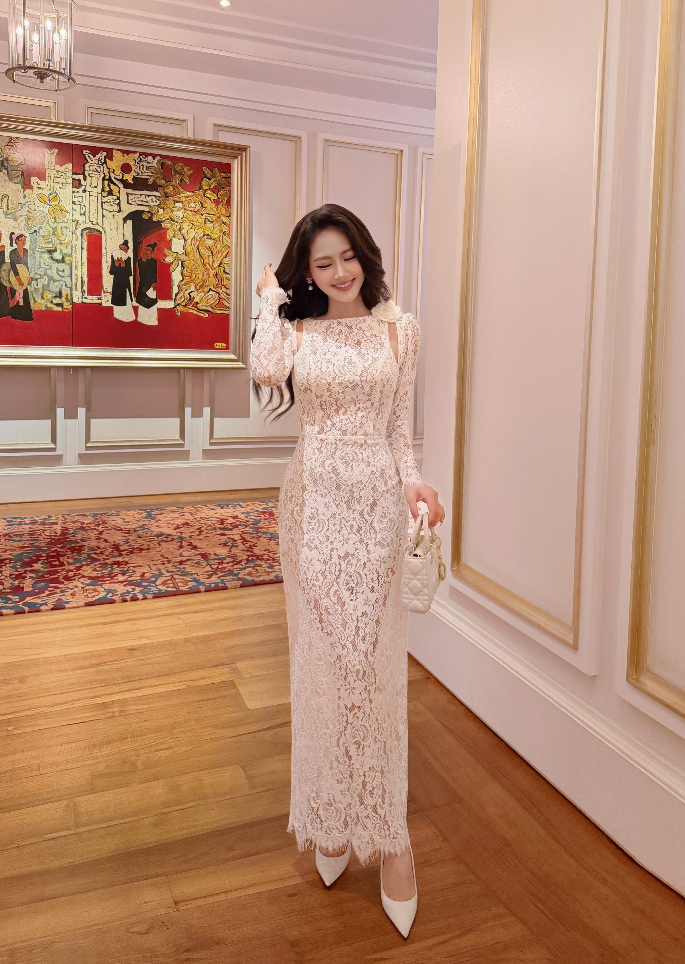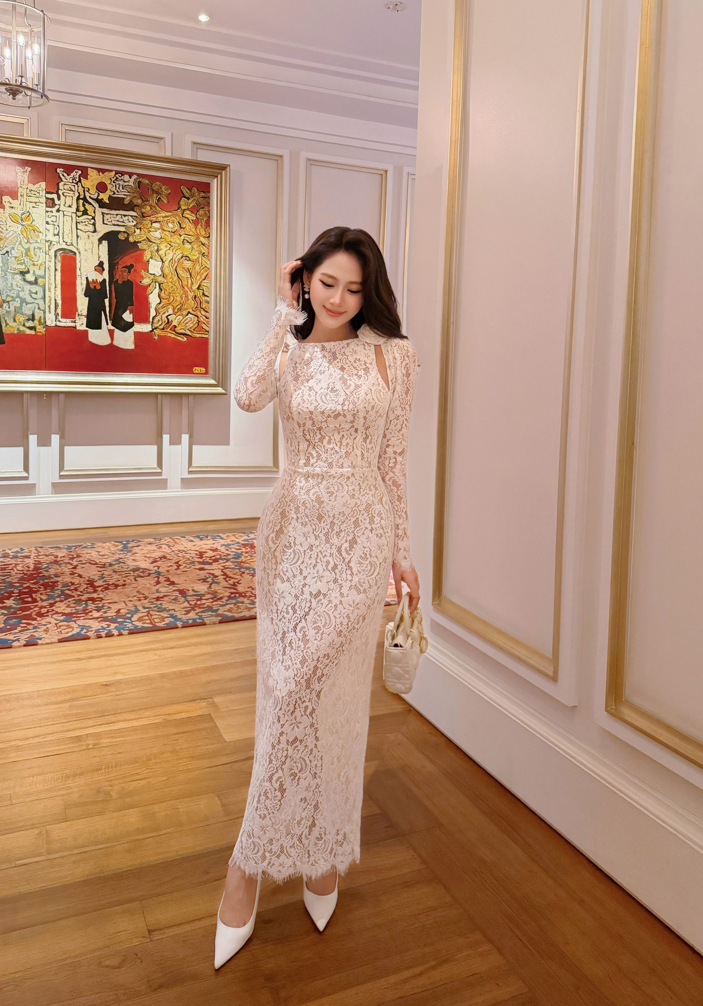 Phần tay dài ôm nhẹ cánh tay mang lại cảm giác quý phái và cổ điển. Viền ren scallop tự nhiên ở chân váy giúp từng chuyển động trở nên uyển chuyển và nhẹ nhàng, tăng thêm nét mềm mại cho tổng thể thiết kế.