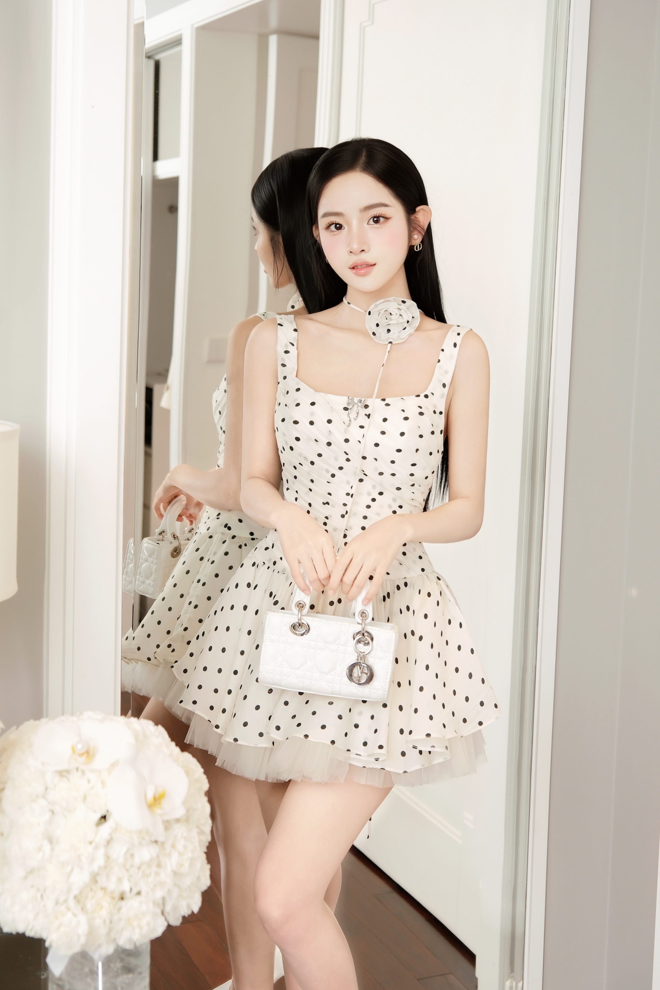 Váy có lớp lót lụa mềm bên trong, khóa kéo sau lưng, đảm bảo kín đáo và dễ mặc. Hoạ tiết chấm bi đen trên nền trắng thanh lịch – dễ phối với nhiều phụ kiện.