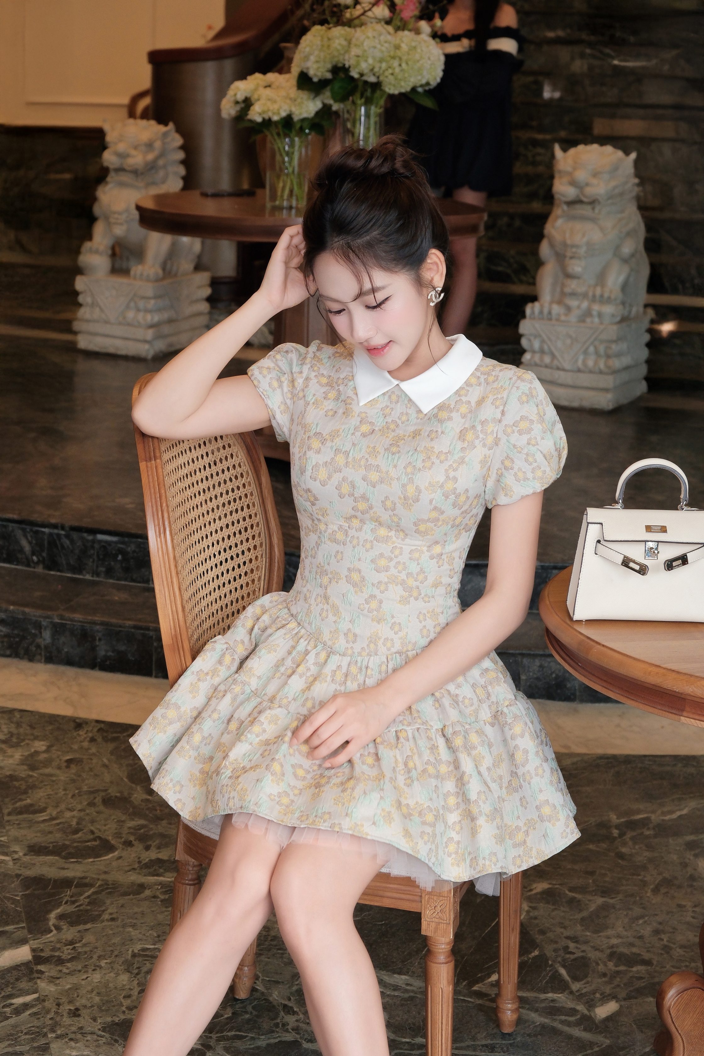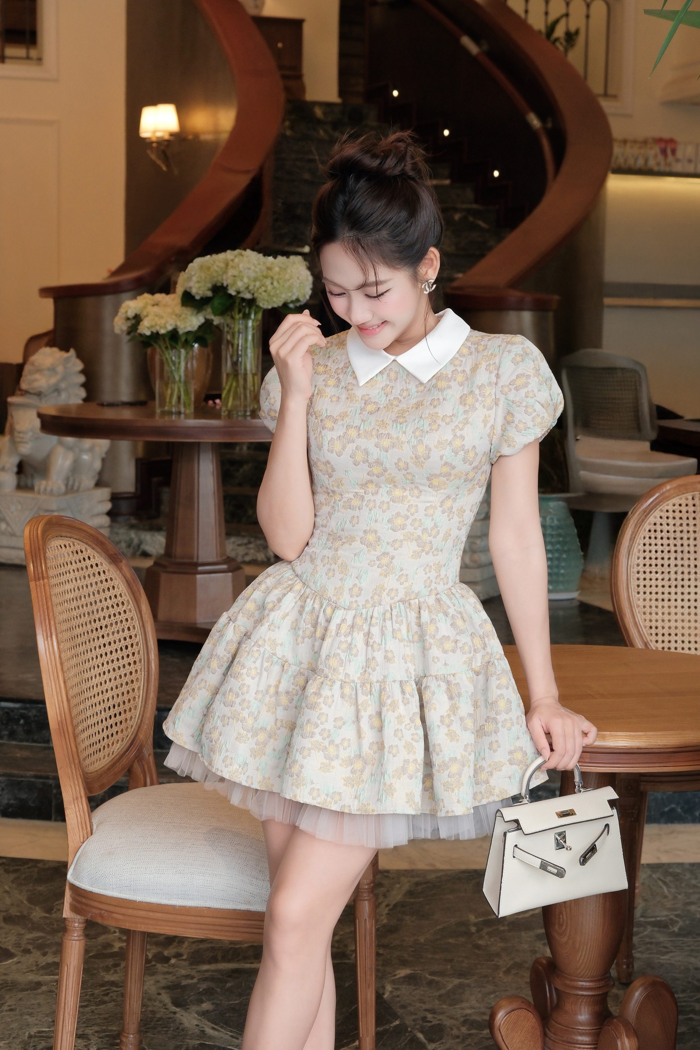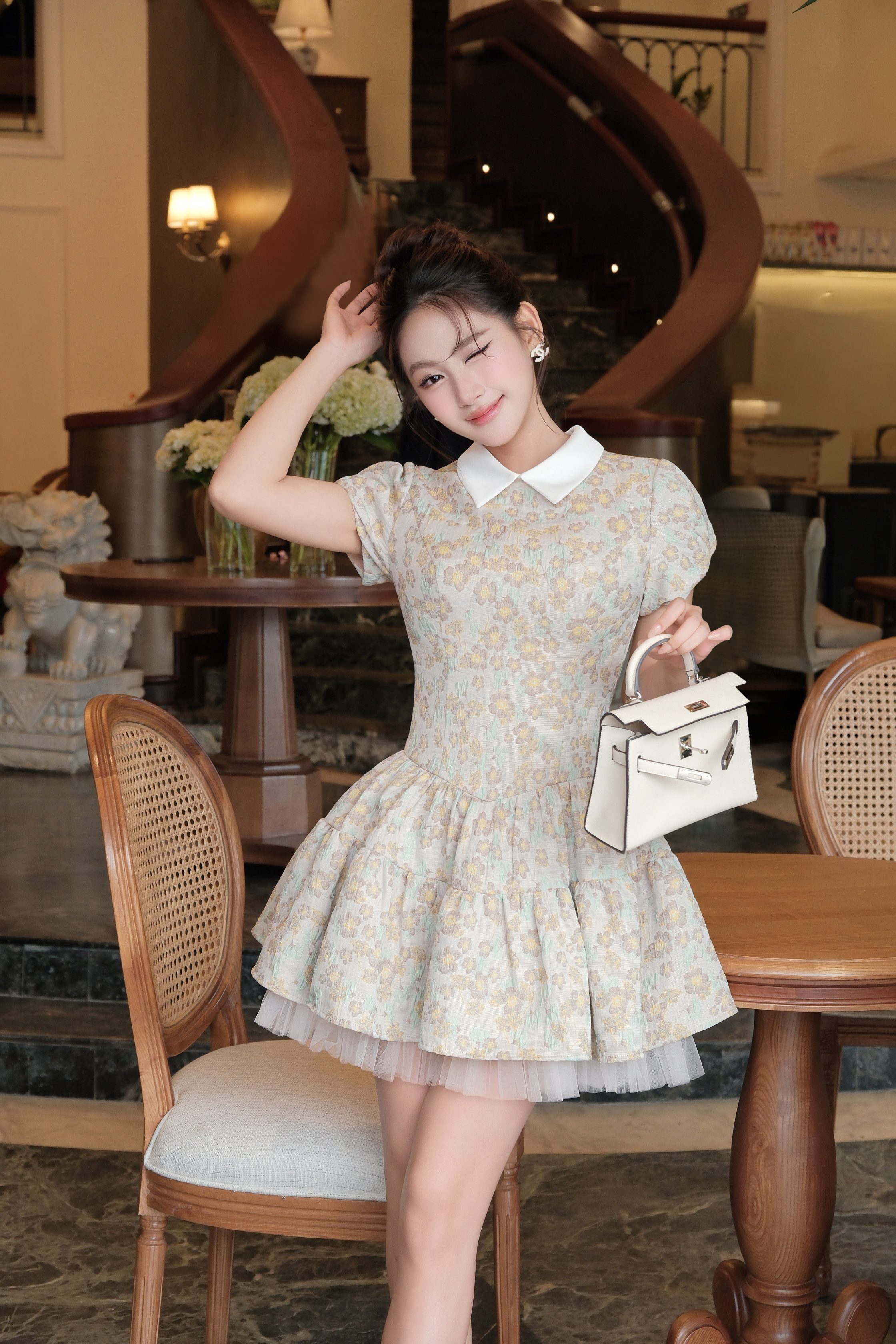 Đầm ngắn KD560 mang phong cách vintage nhẹ nhàng với chất liệu gấm hoa cao cấp, tạo nên tổng thể thanh lịch và nữ tính. Tone màu dịu mắt kết hợp họa tiết hoa nhí giúp outfit trở nên tinh tế và dễ ứng dụng.