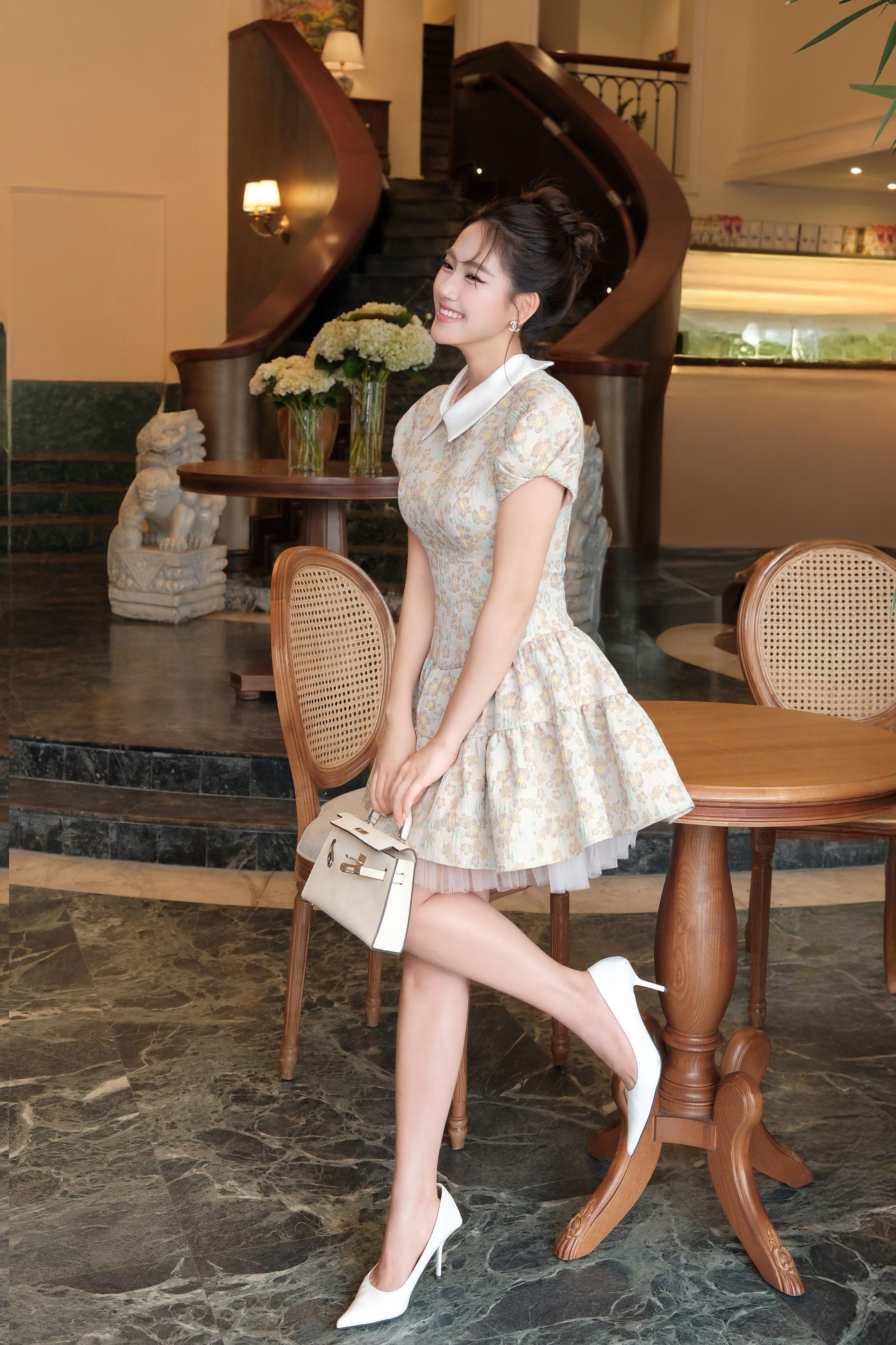 Phom váy xòe bồng nhẹ kết hợp chiết eo cao giúp tạo tỷ lệ cơ thể cân đối, làm nổi bật vòng eo và giúp vóc dáng trông thon gọn hơn. Thiết kế này mang lại cảm giác bay bổng và mềm mại trong từng chuyển động.