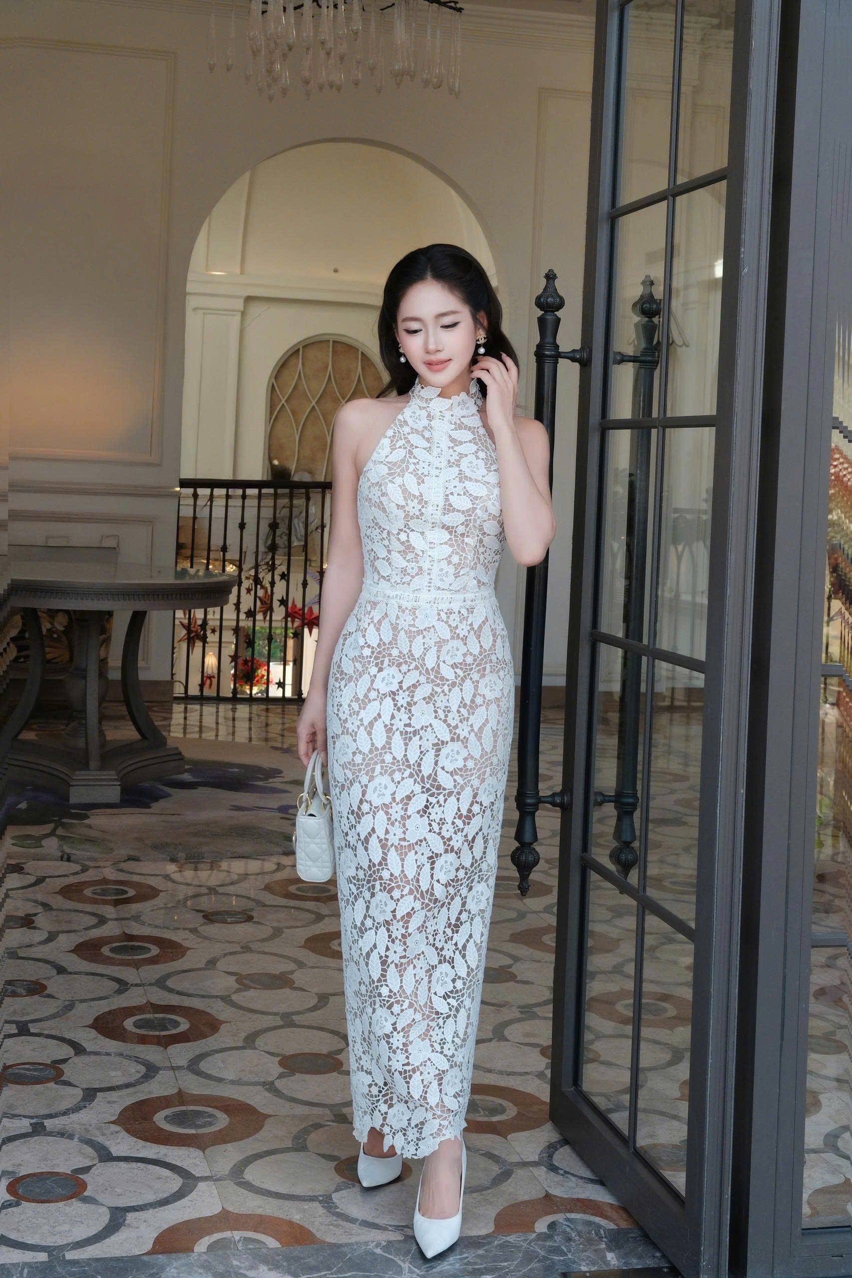 Thiết kế cổ yếm cao mang đến vẻ thanh lịch và kín đáo, phía sau được hoàn thiện bằng nút ngọc tinh tế. Điểm nhấn nổi bật của đầm ren dài cape vai sang trọng là dải cape mềm mại buông nhẹ qua vai, tạo hiệu ứng bay nhẹ nữ tính và thời trang.