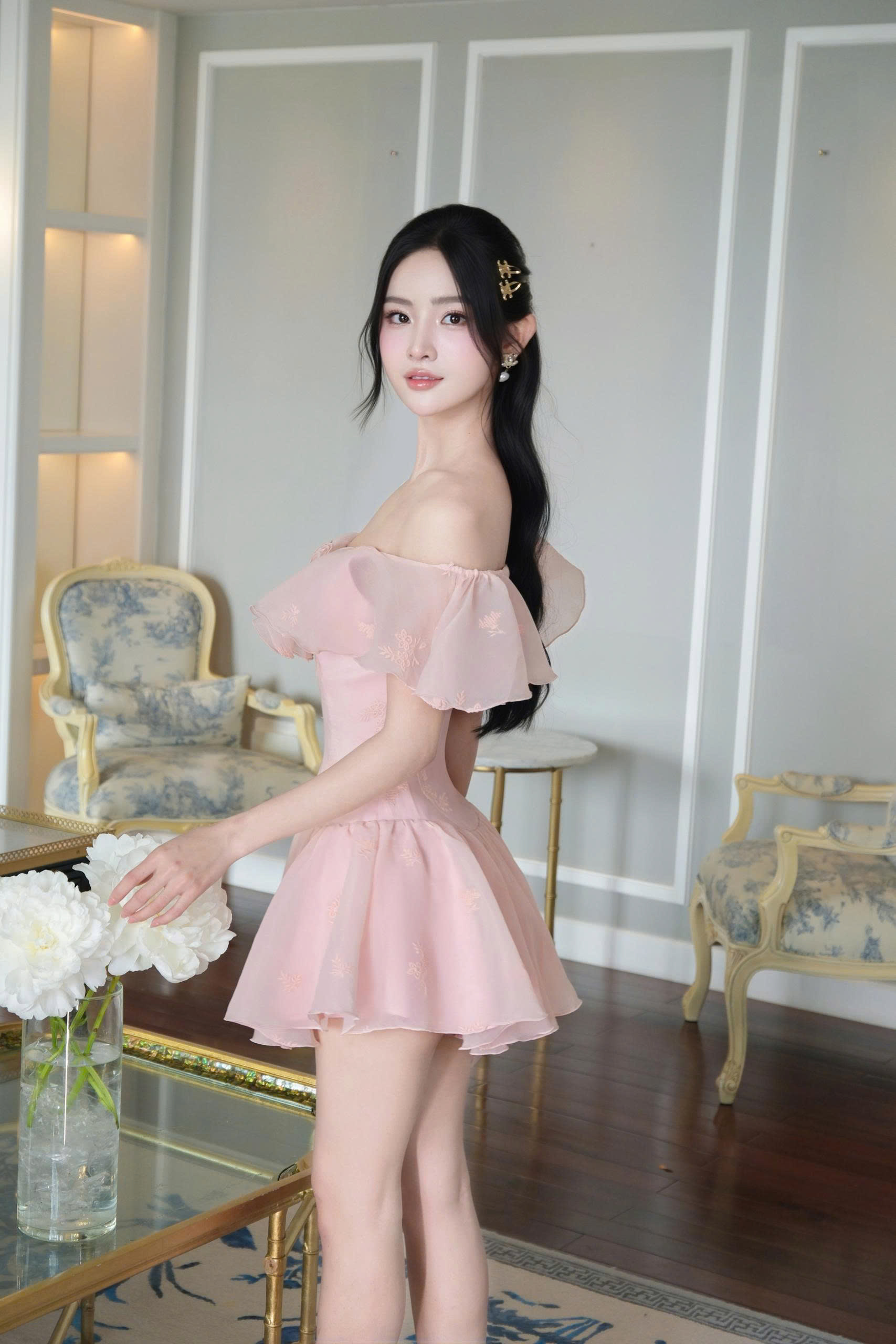 Phần vai trễ phủ lớp voan mỏng nhẹ, giúp khoe khéo bờ vai thon, tăng vẻ quyến rũ mà vẫn giữ nét thanh lịch. Chi tiết hoa voan đính trước ngực tạo điểm nhấn nổi bật, nhẹ nhàng nhưng không kém phần thu hút.