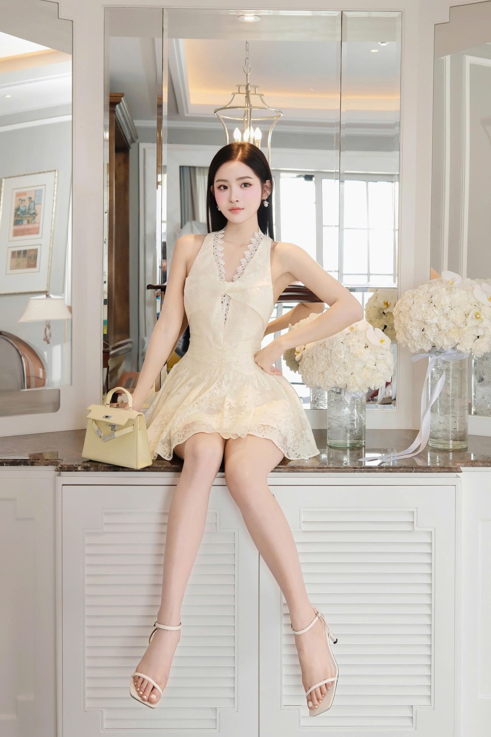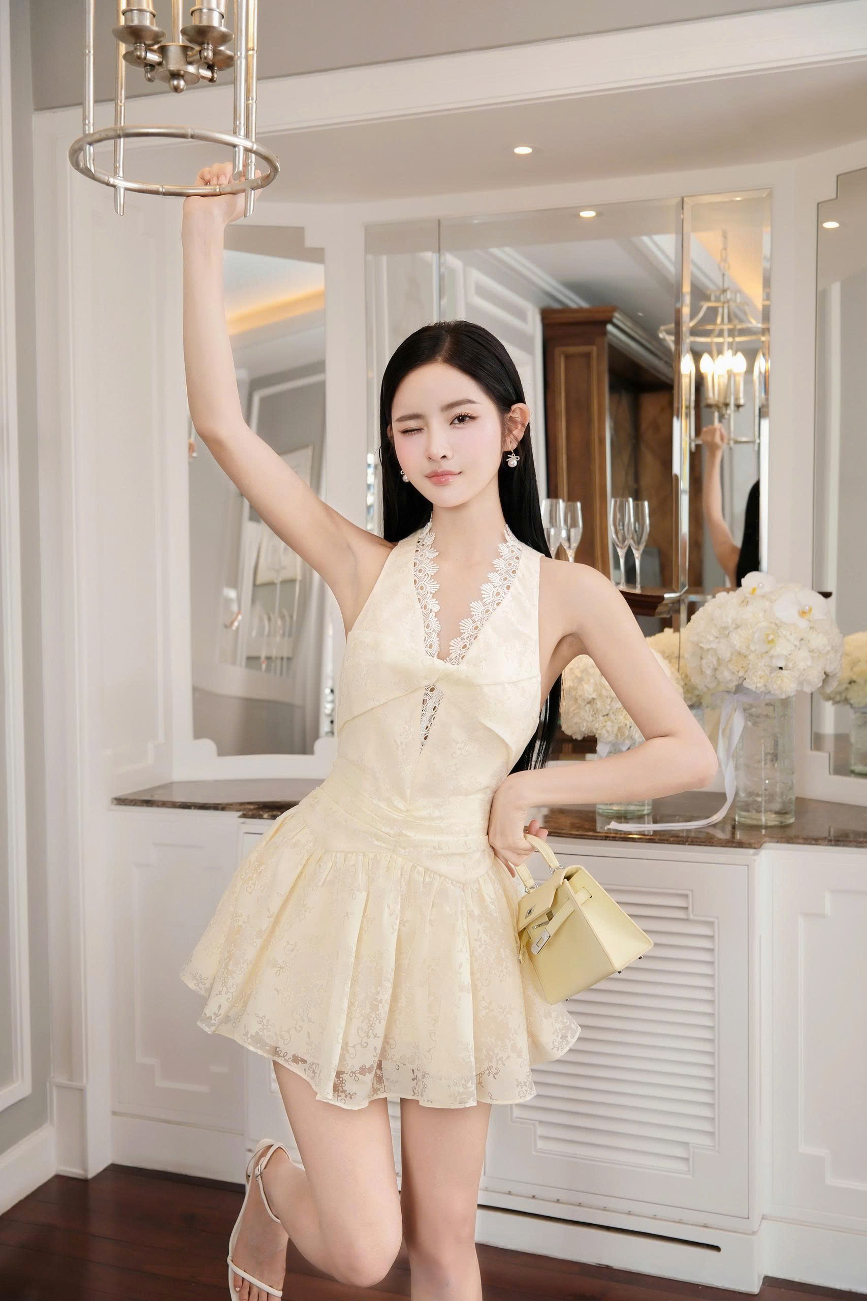 Phần thân trên ôm gọn dáng, cổ yếm phối ren nổi viền quanh, tạo sự tinh tế và nhẹ nhàng. Ngực có chi tiết cut-out nhỏ, đính thêm nơ vải mềm để tăng sự nữ tính mà vẫn đảm bảo độ kín đáo vừa phải.