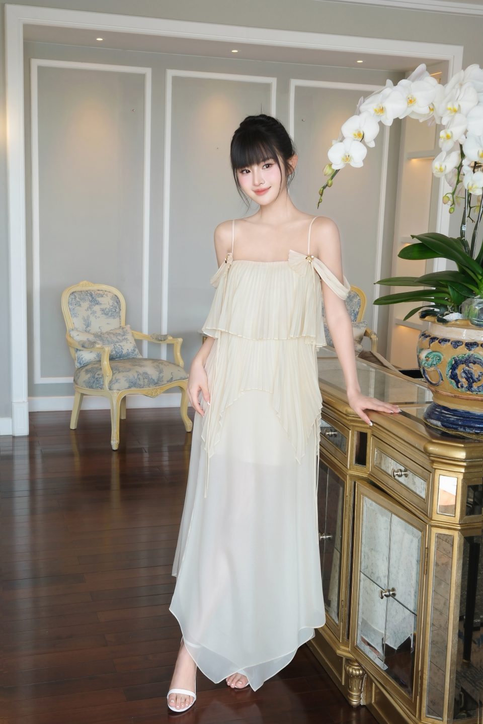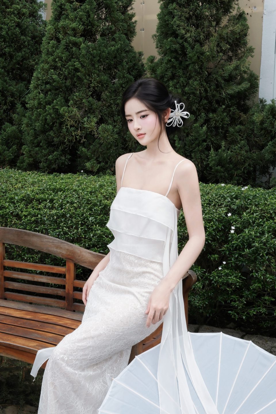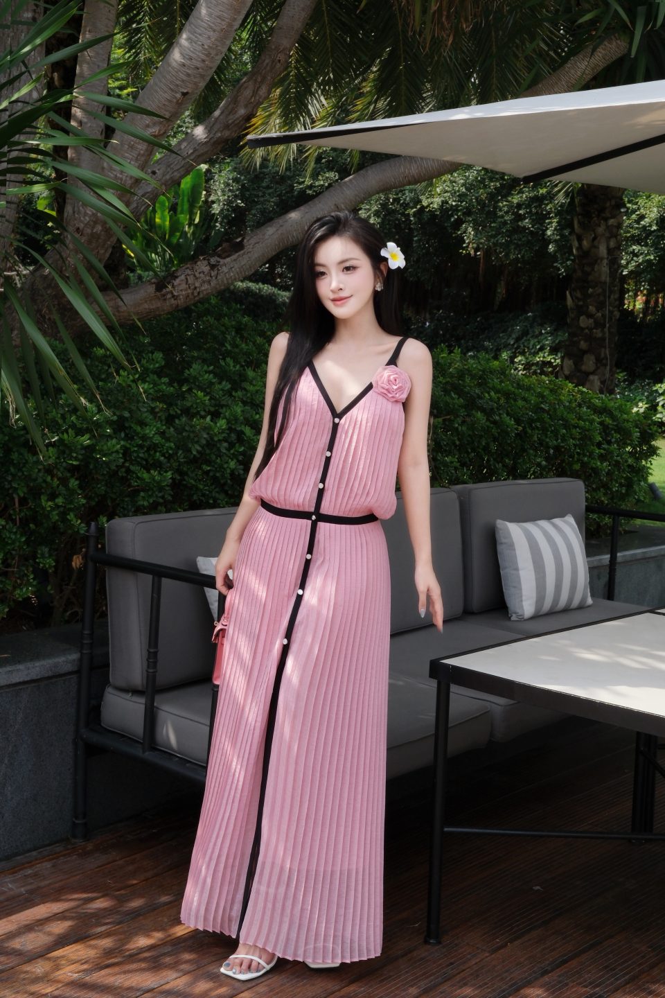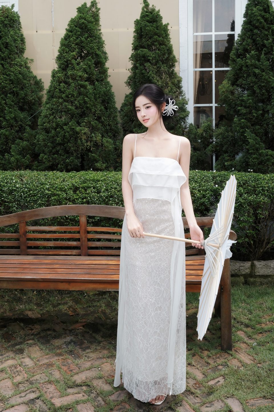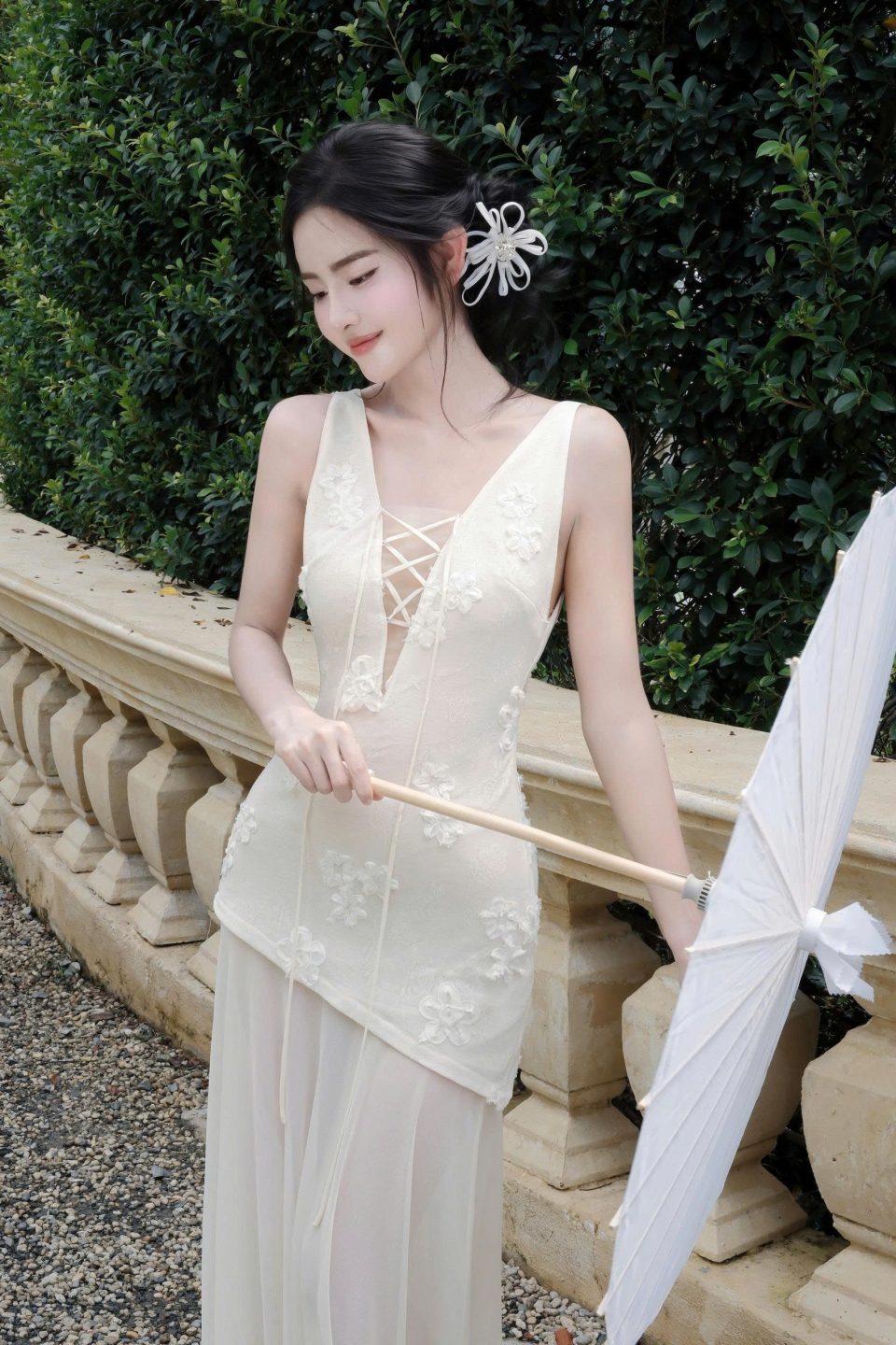 ✔️ Thiết kế: Váy hai dây ôm nhẹ dáng dài, đính hoa 3D – yếm rời buộc cổ