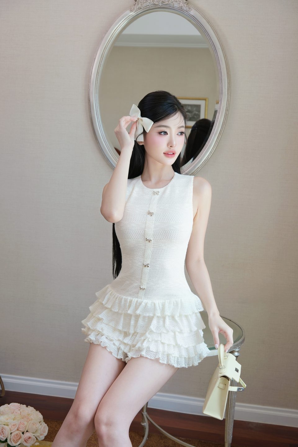 ✔️ Thiết kế: Áo suông cổ V đính hoa – Tay rút nơ – Váy ngắn xòe lót quần