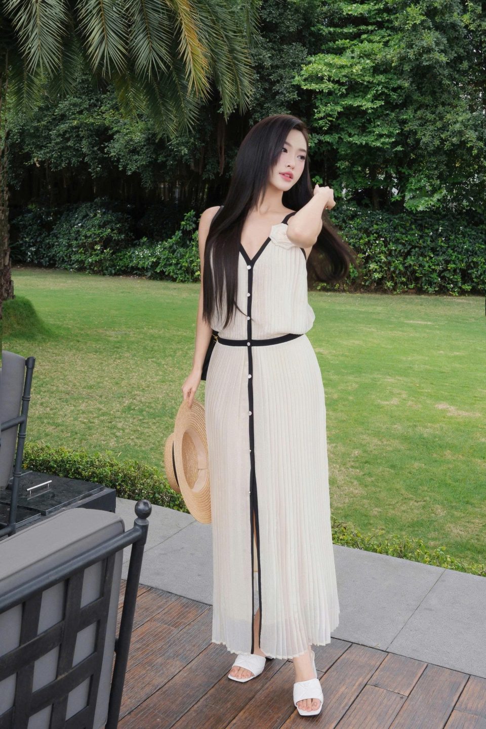 ✔️Dáng đầm dài maxi, phần eo bo thun ôm tôn dáng, tùng váy xòe nhẹ bay bổng mix cùng viền đen chạy dọc thân trước cùng hàng nút bọc ngọc tạo điểm nhấn tinh tế