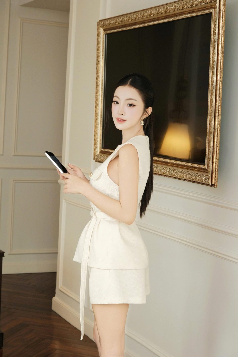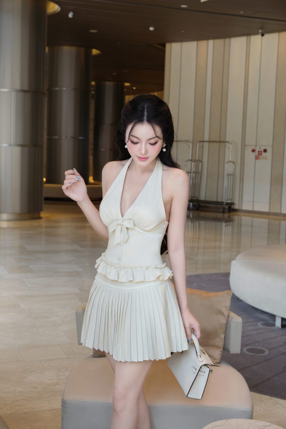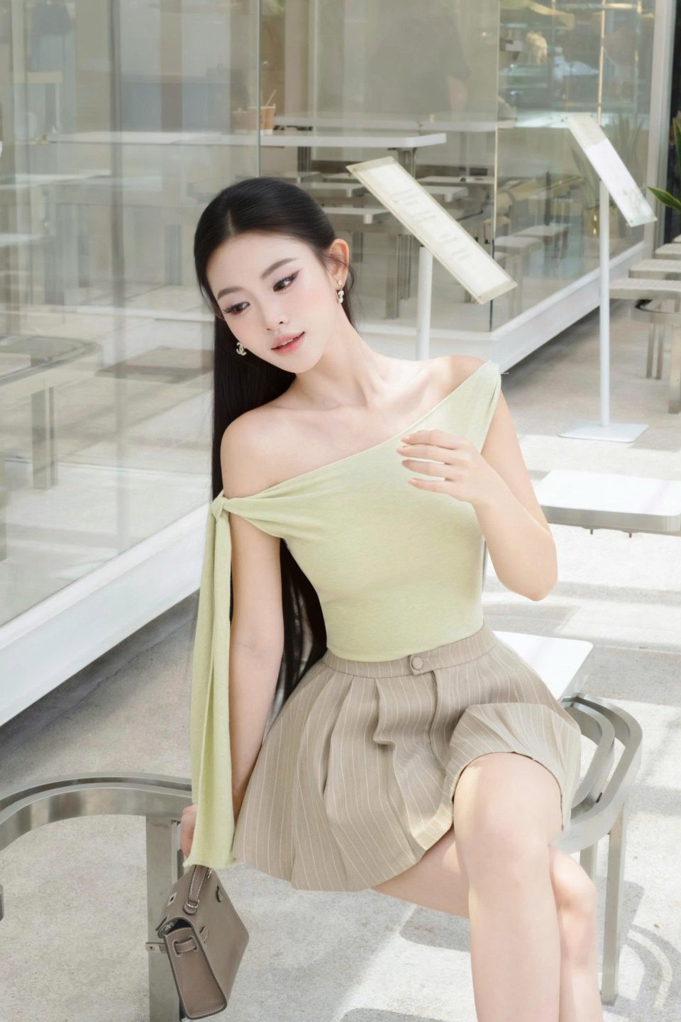 ✔️ Thiết kế: Áo lệch vai buông nhẹ + váy ngắn xếp ly có lót quần