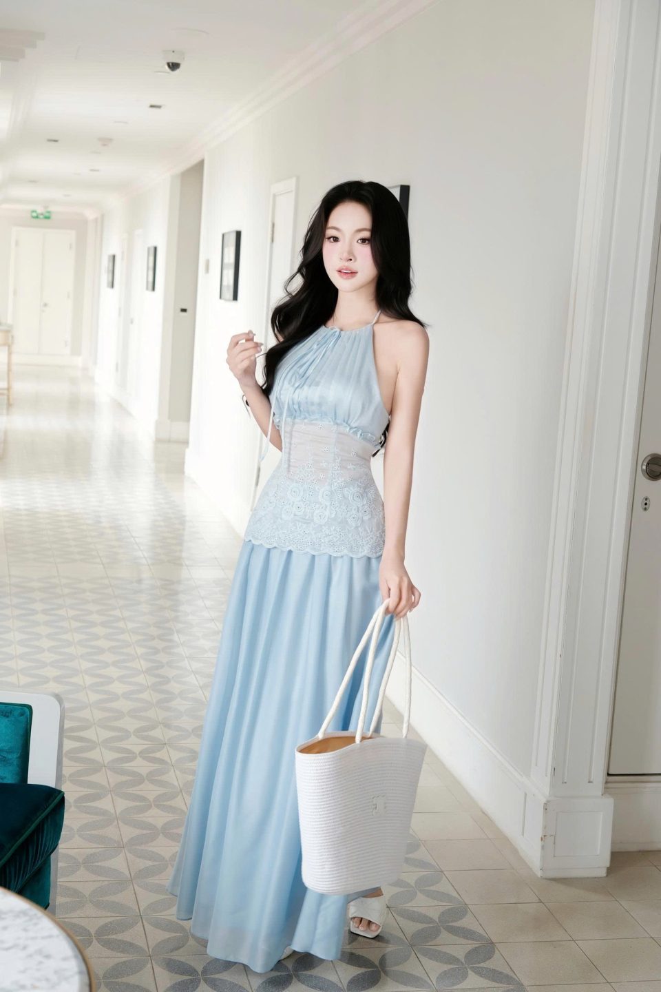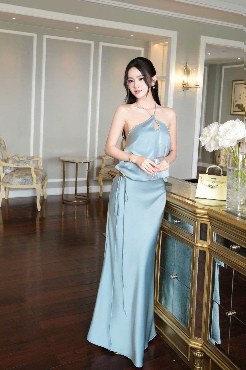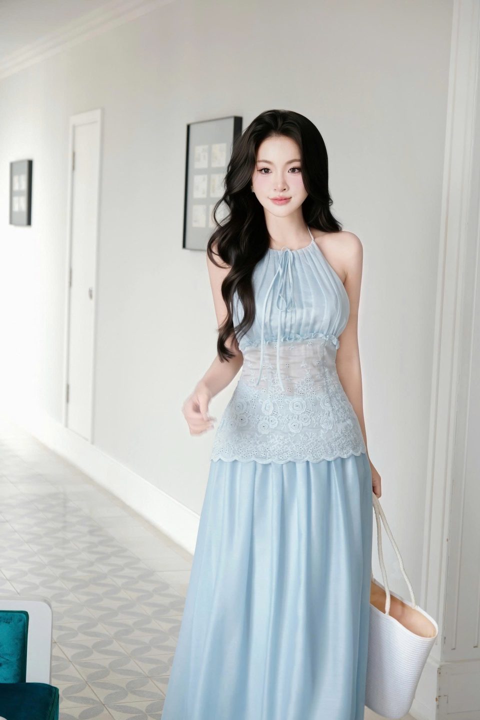✔️ Thiết kế: Váy hai dây ôm nhẹ dáng dài, đính hoa 3D – yếm rời buộc cổ