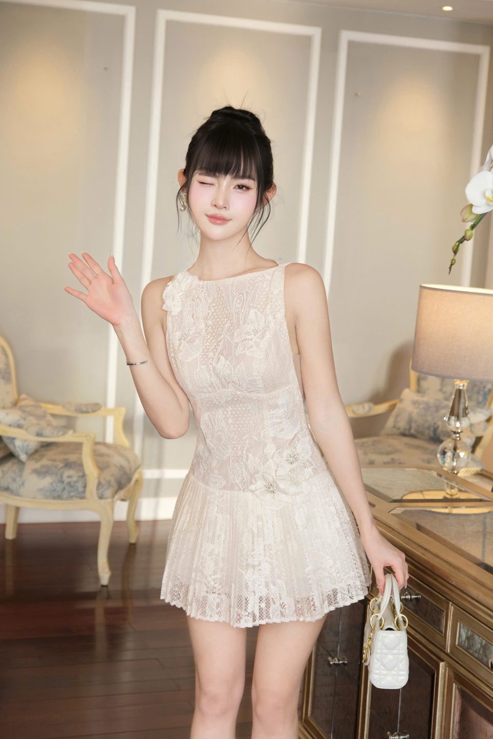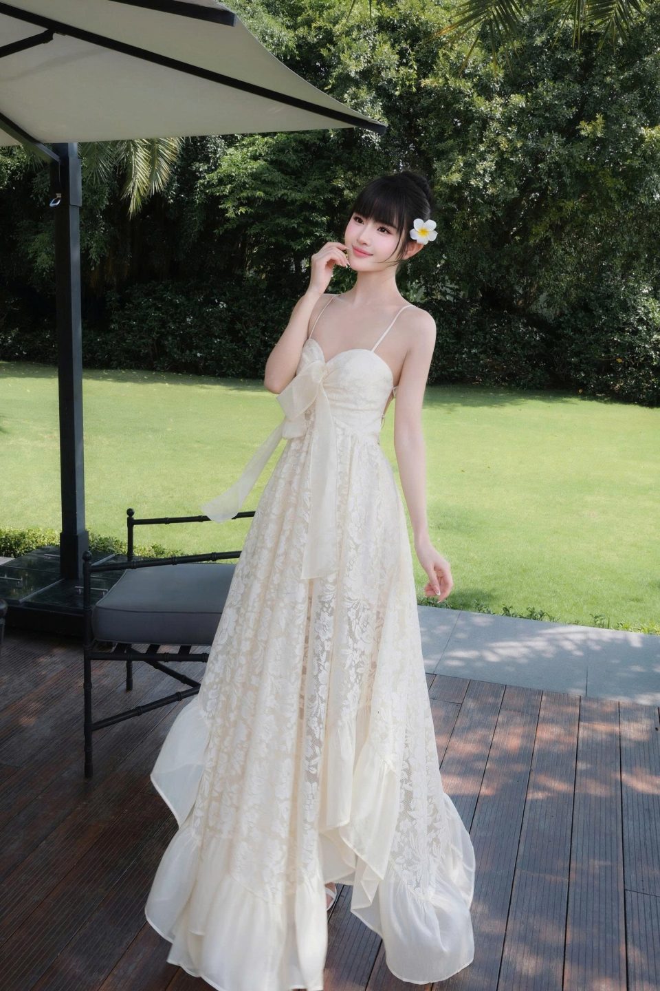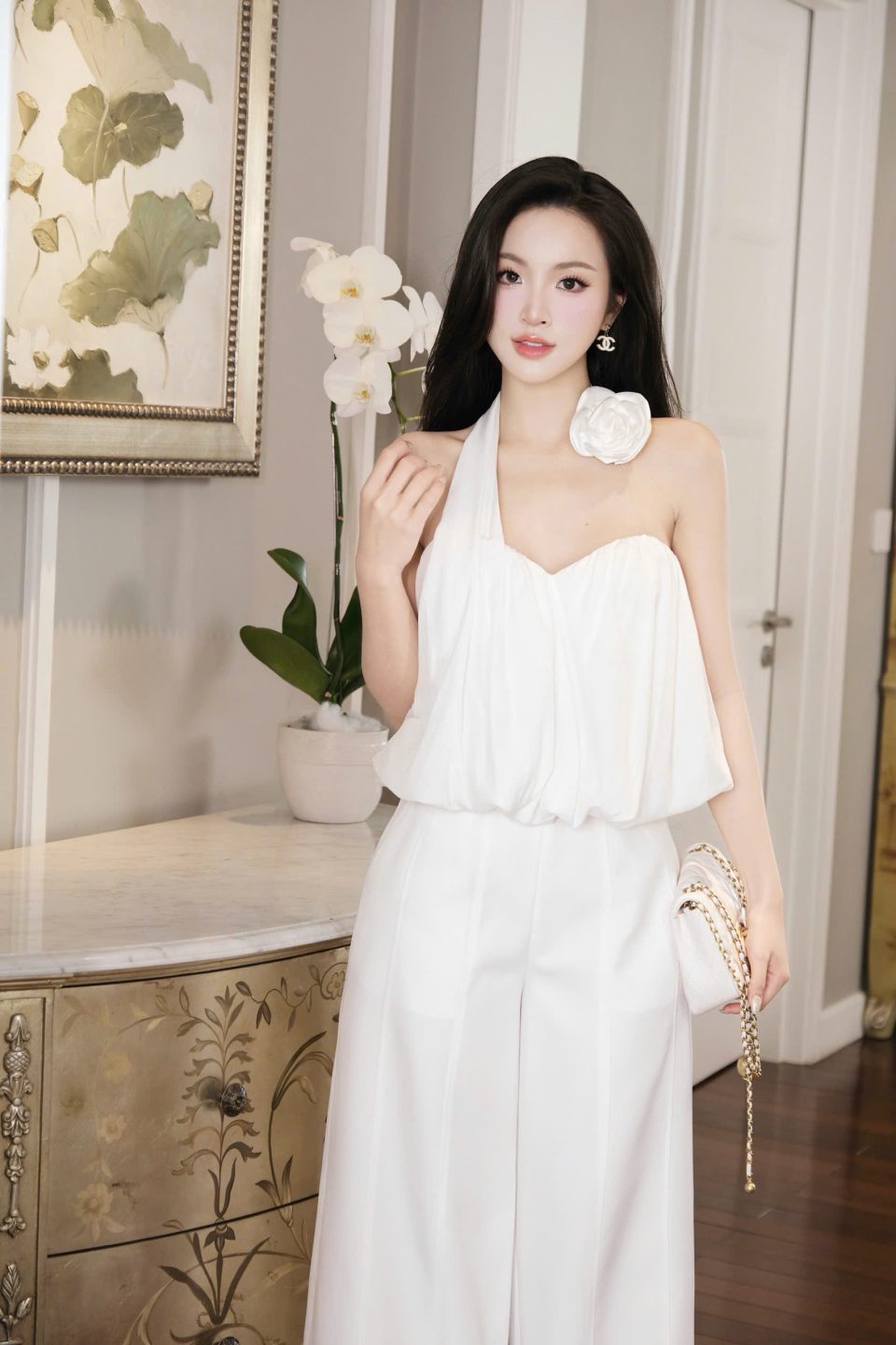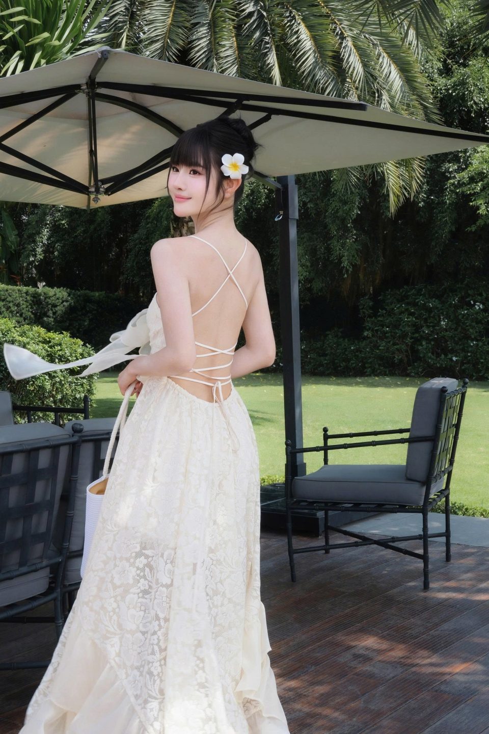 ✔️ Thiết kế: Váy hai dây ôm nhẹ dáng dài, đính hoa 3D – yếm rời buộc cổ