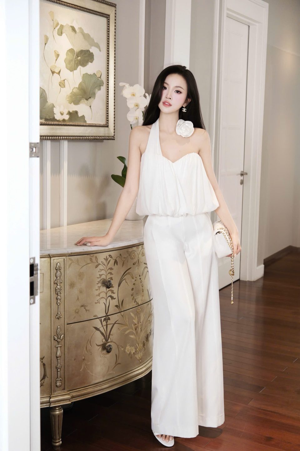 ✔️ Thiết kế: Áo lệch vai nhún phồng đính hoa – Quần ống suông, có túi