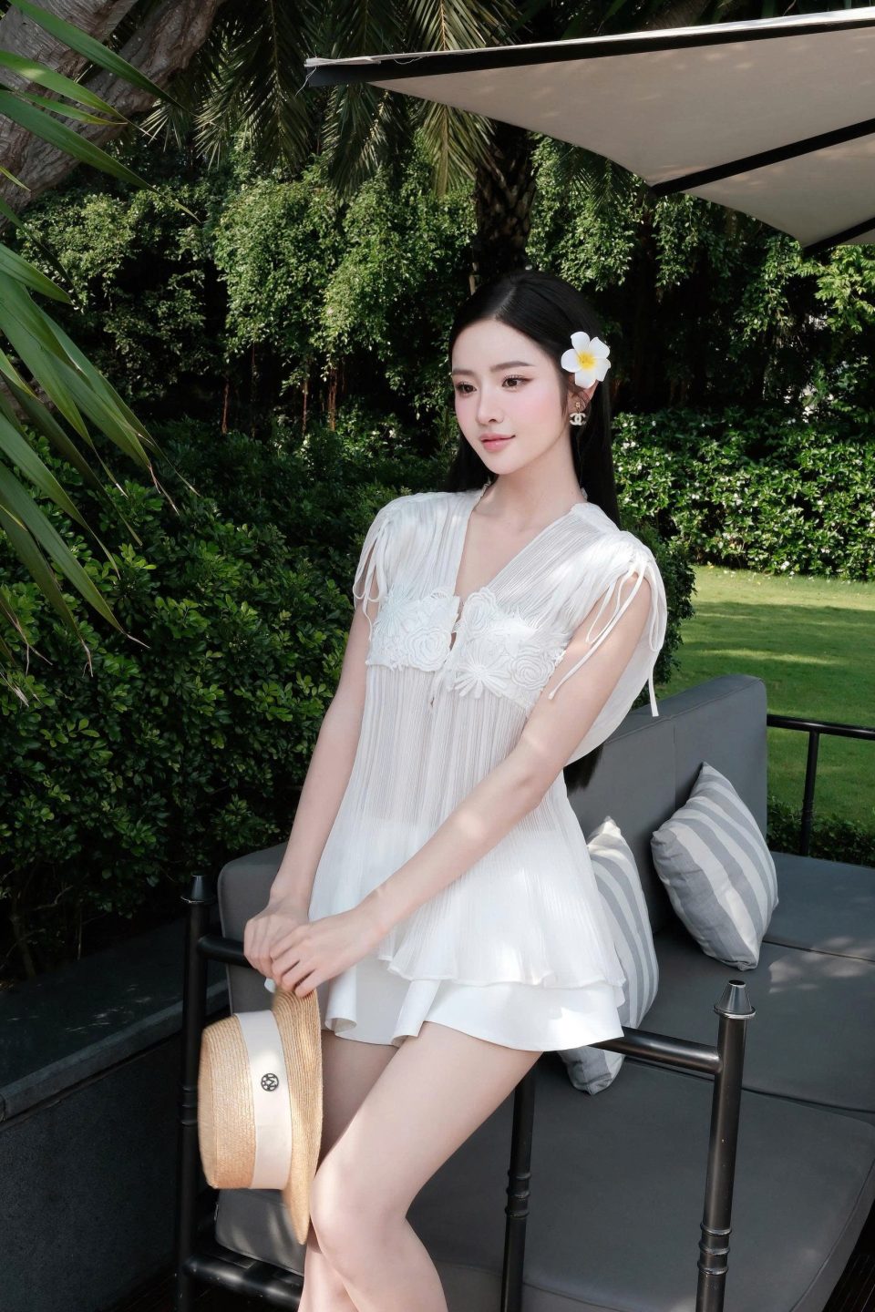 ✔️ Thiết kế: Áo suông cổ V đính hoa – Tay rút nơ – Váy ngắn xòe lót quần