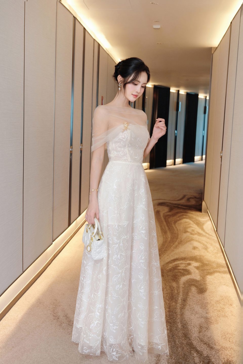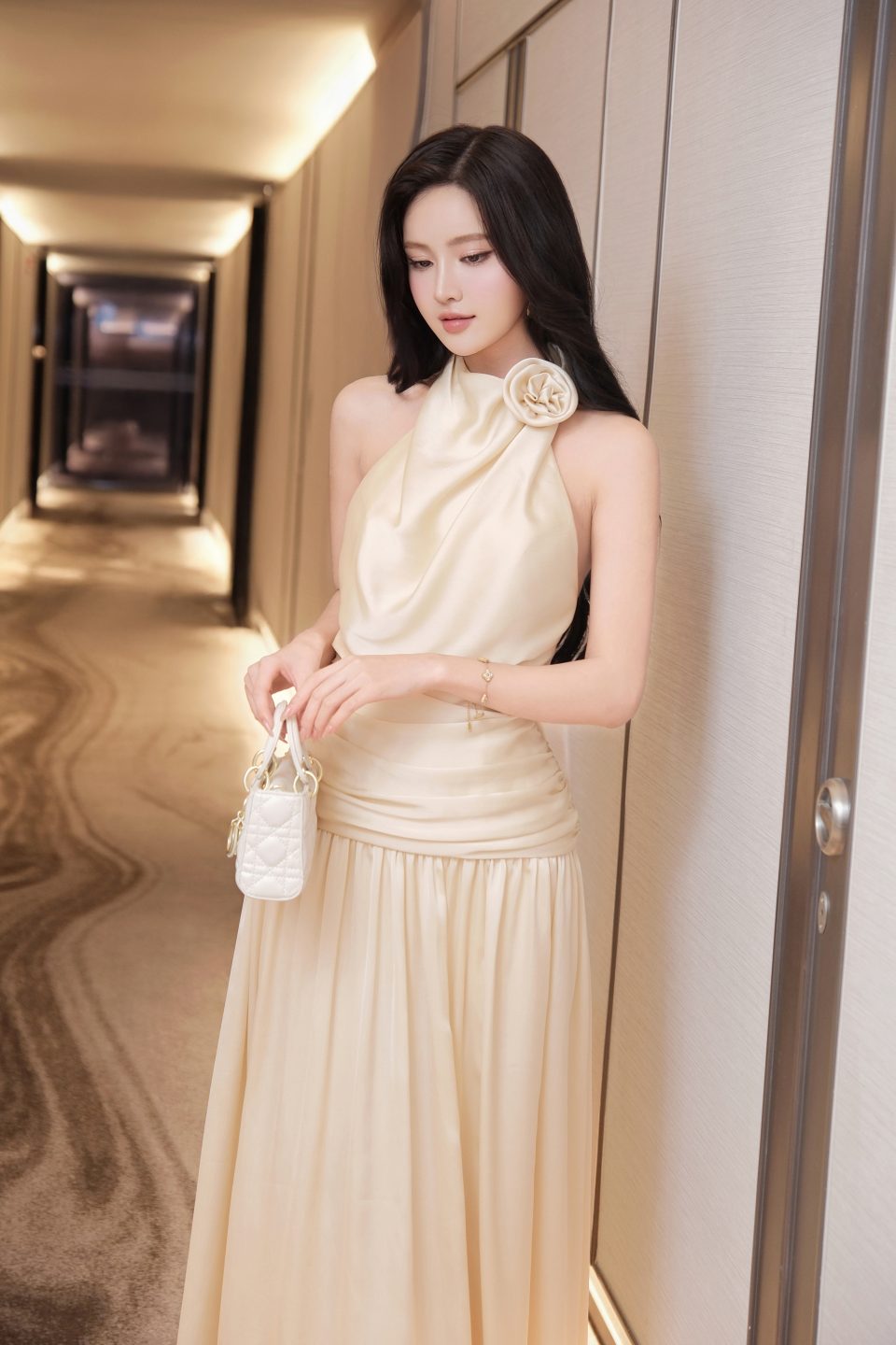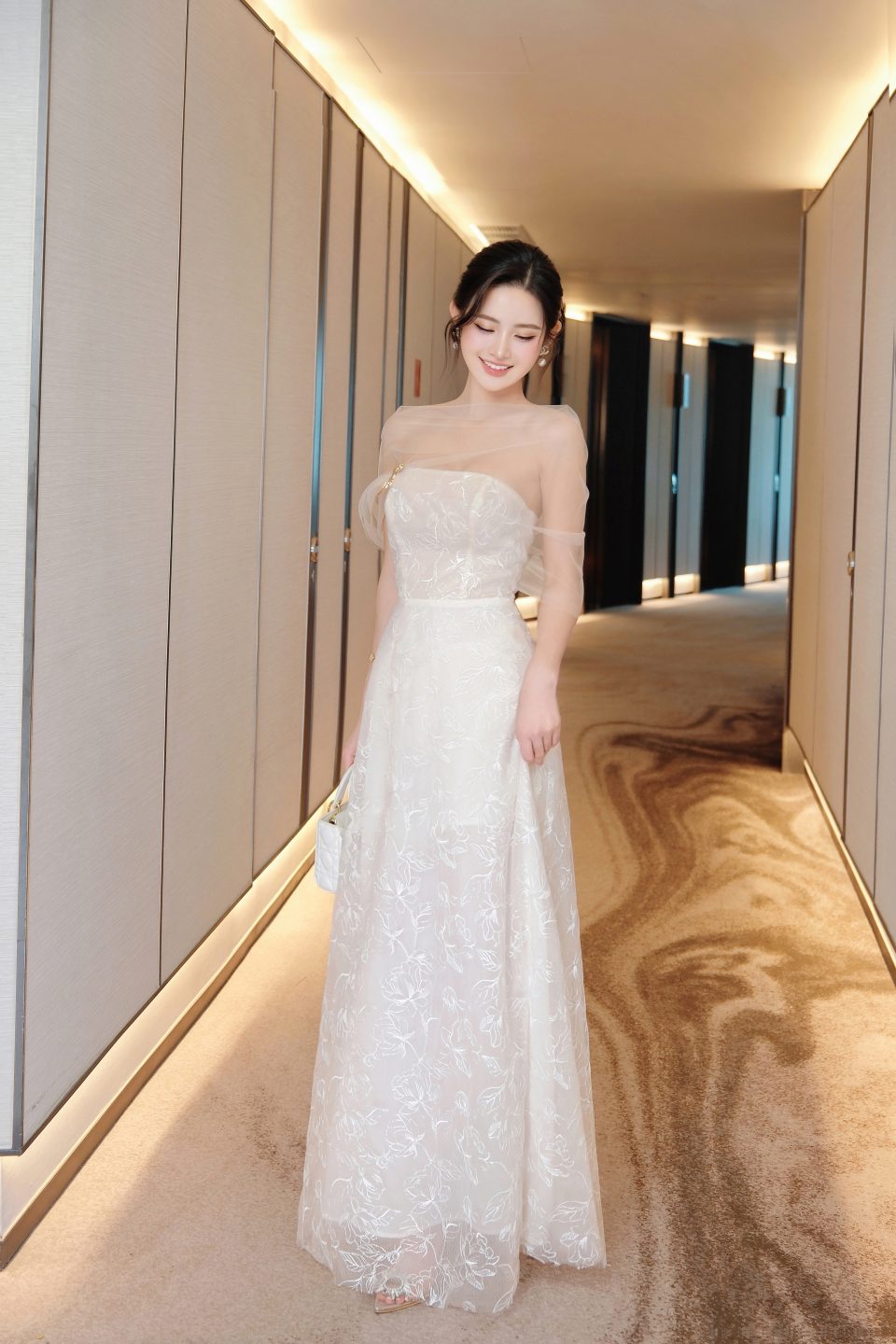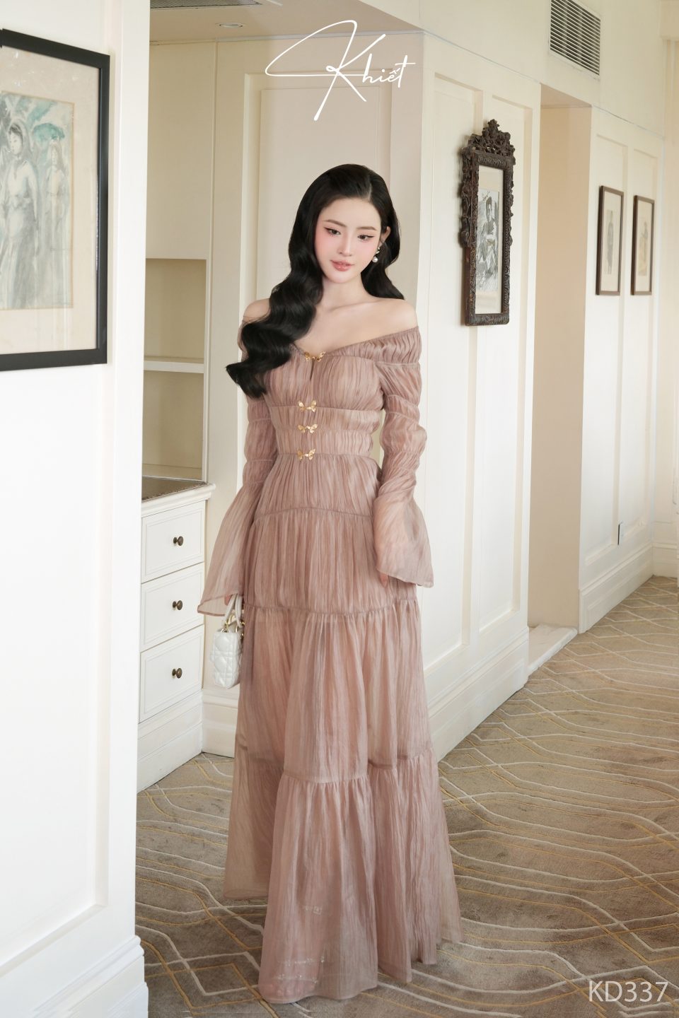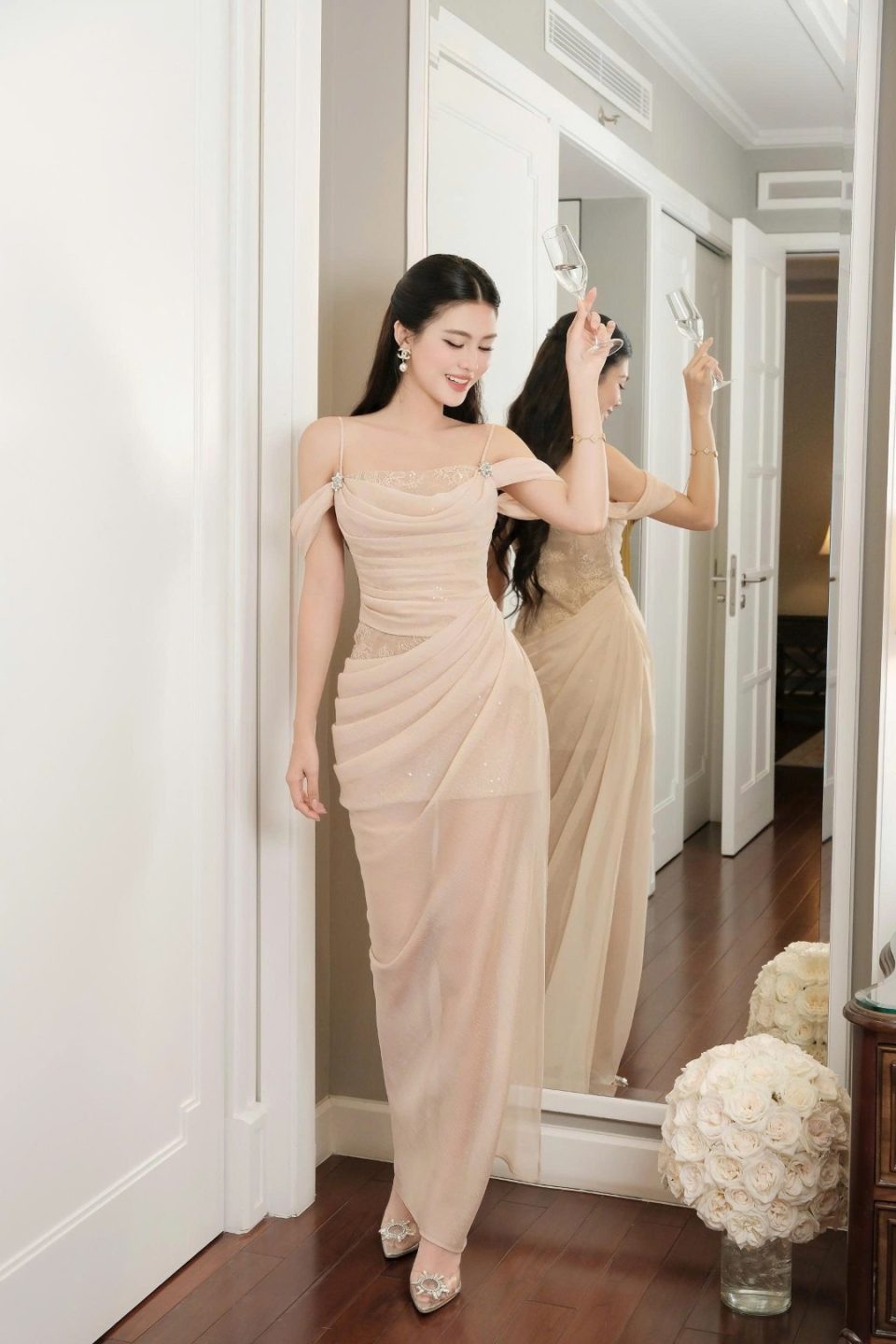 ✔️ Dáng maxi dài xoè nhẹ, phủ lưới vai đính charm hoa ánh kim