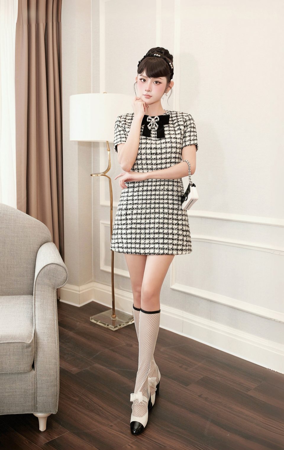 ✔️ Thiết kế – Đầm ngắn cổ yếm ôm gọn; phom ôm nhẹ tôn dáng; nơ đen rời nhấn eo; lót lụa, khóa kéo sau; dài 80cm.