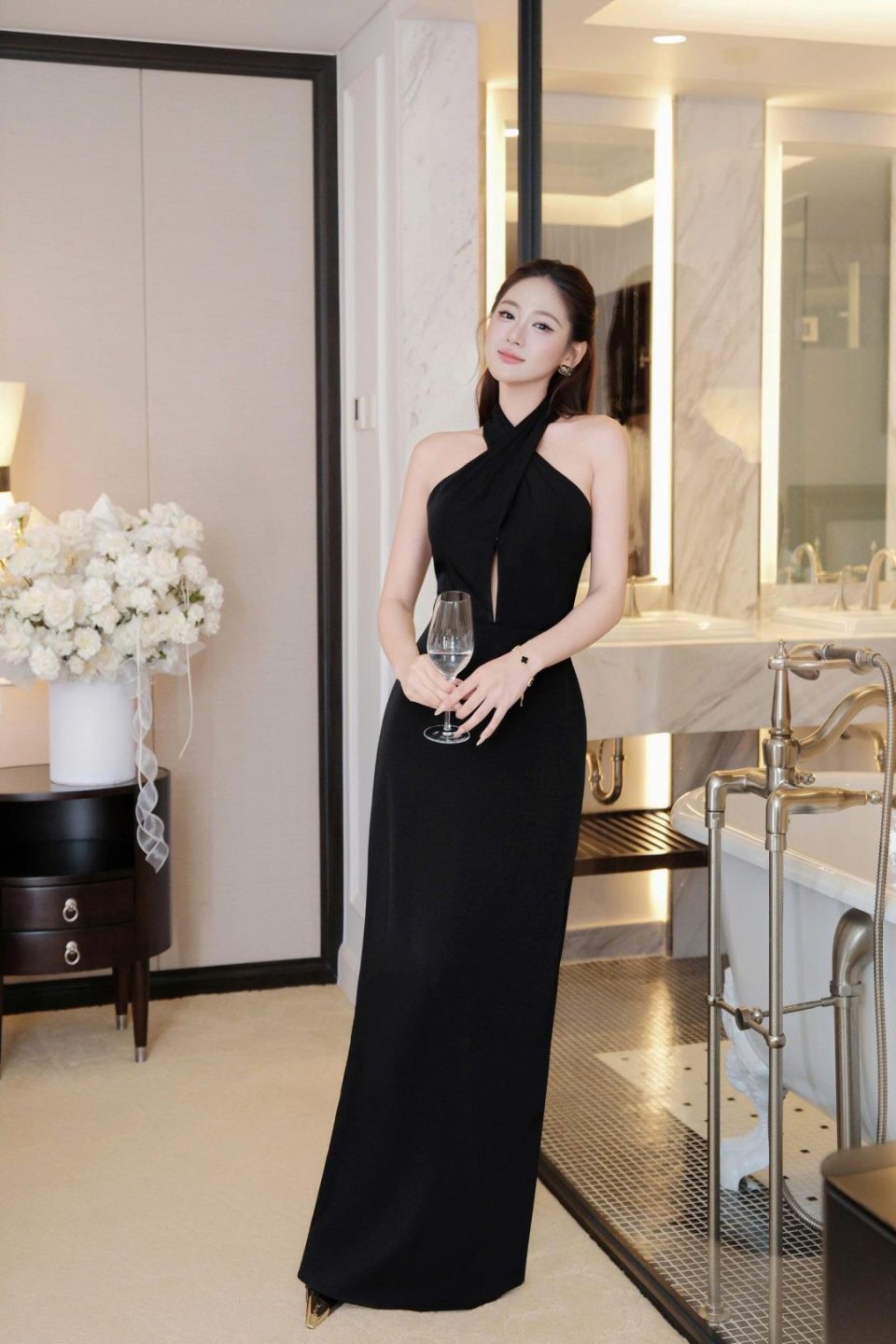 ✔️ Thiết kế – Váy maxi body-fit rủ mềm; cổ yếm halter twist bắt chéo; cut-out giọt nước tinh tế; nút bấm cố định form & nút ngọc sau; dài 145cm sang trọng.