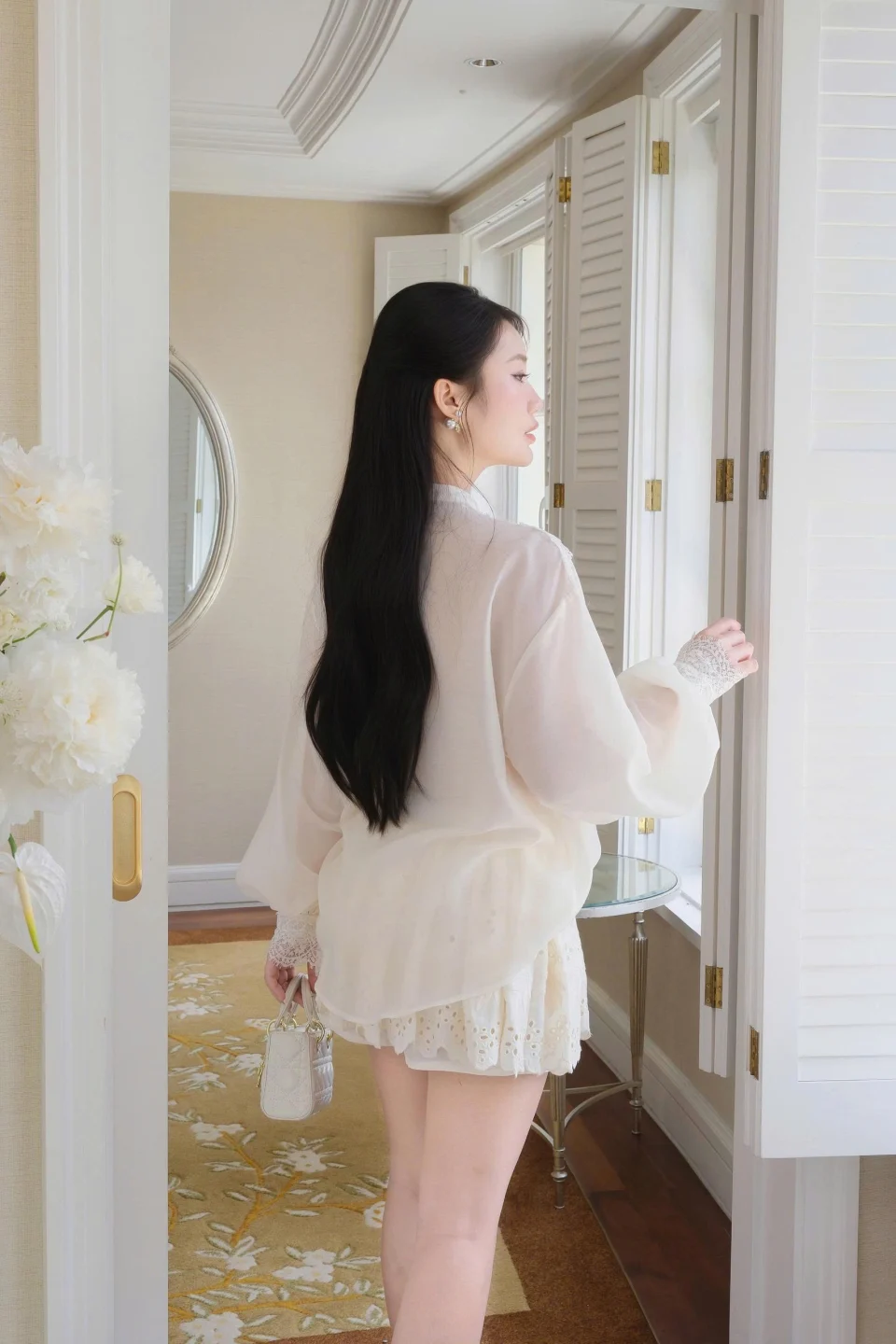 Phía sau áo là thiết kế cut-out phóng khoáng, phối nút gài ngọc trai cùng dây chun co giãn và hoa nhỏ xinh, giúp áo giữ dáng tốt nhưng vẫn thoải mái.