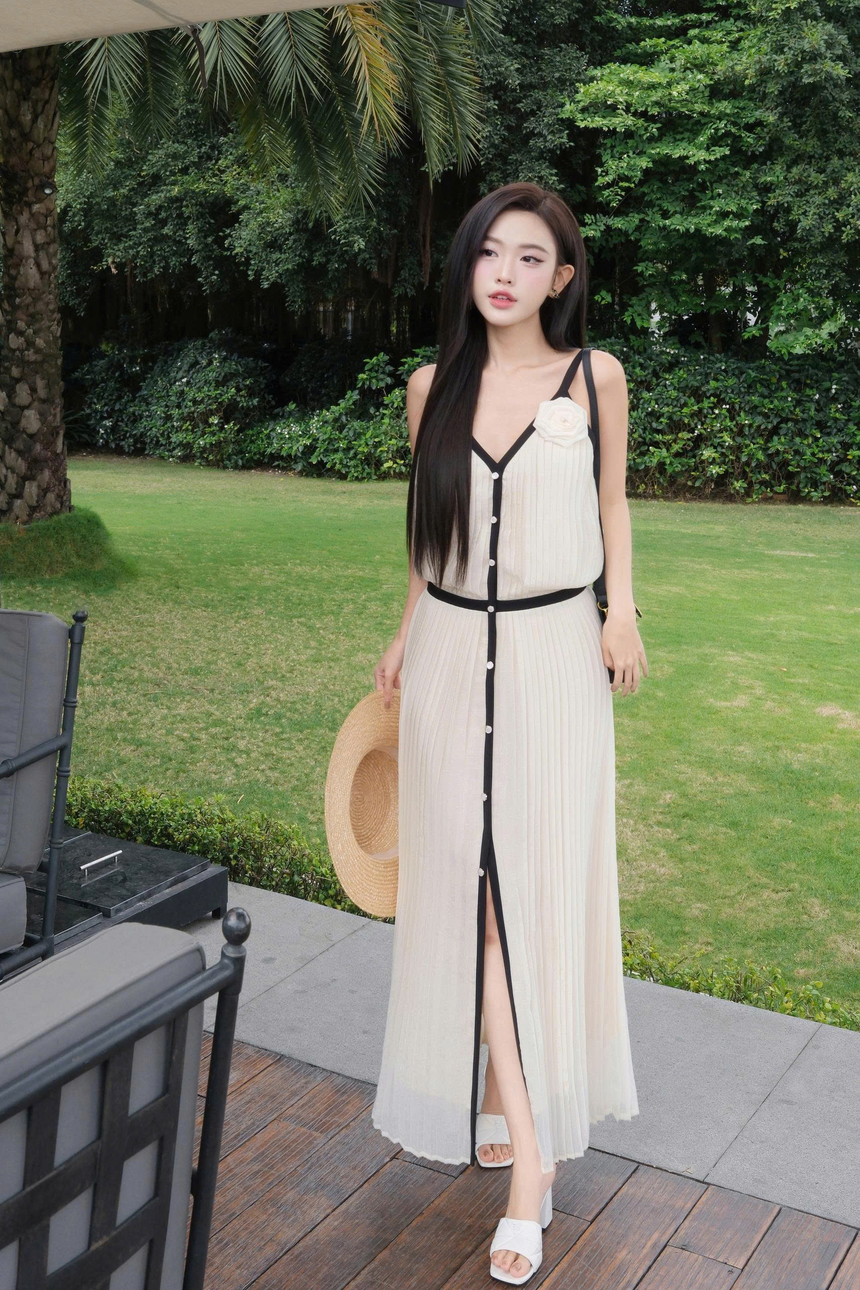 Đầm maxi dáng dài 133cm giúp tôn chiều cao và mang lại vẻ thướt tha duyên dáng. Thiết kế eo bo thun ôm nhẹ khoe trọn vóc dáng cân đối, kết hợp cùng tùng váy xòe bay bổng tạo cảm giác nữ tính, uyển chuyển. Điểm nhấn nổi bật nằm ở viền đen chạy dọc thân trước và hàng nút bọc ngọc sang trọng, cùng đường xẻ tà tinh tế giúp từng bước đi thêm phần cuốn hút. Đầm được kèm hoa cài 3D có thể tháo rời, cùng lớp lót tằm mềm mịn bên trong vừa nhẹ nhàng vừa kín đáo, mang đến trải nghiệm thoải mái và sang trọng cho người mặc.