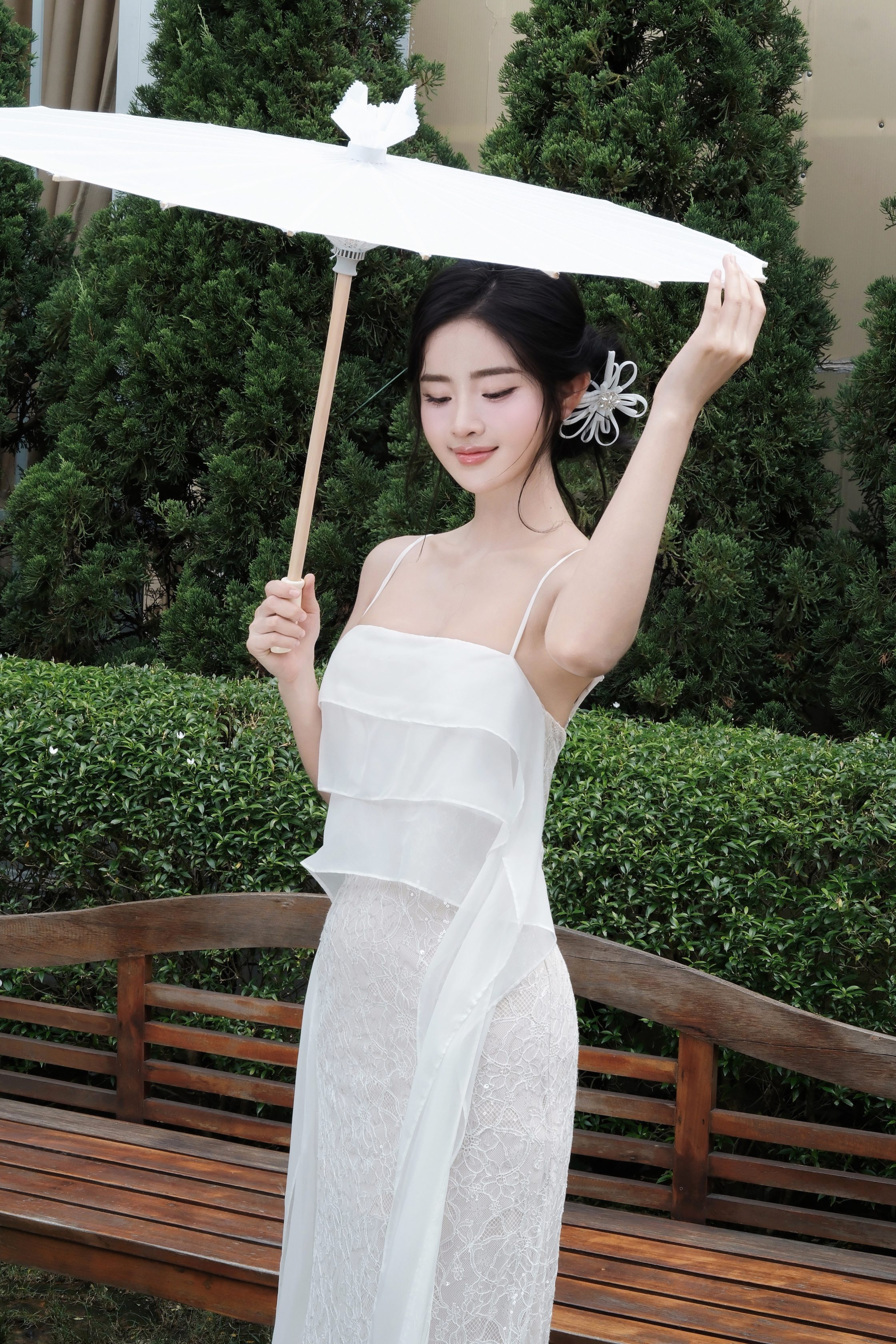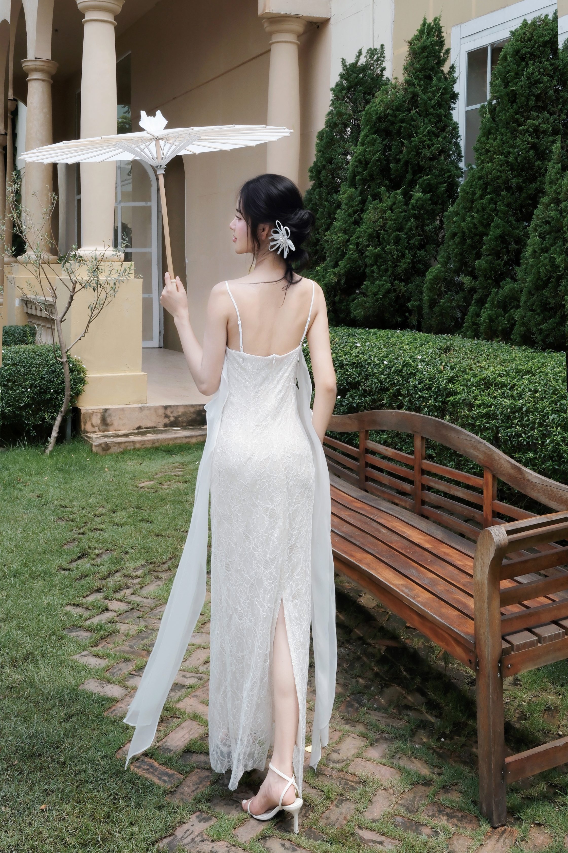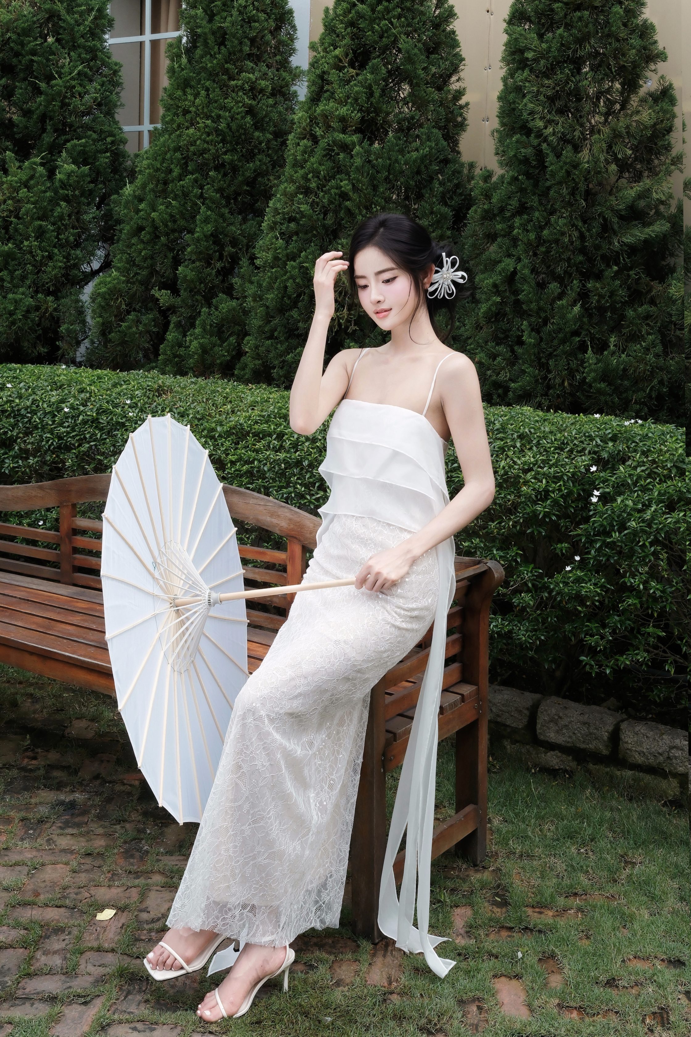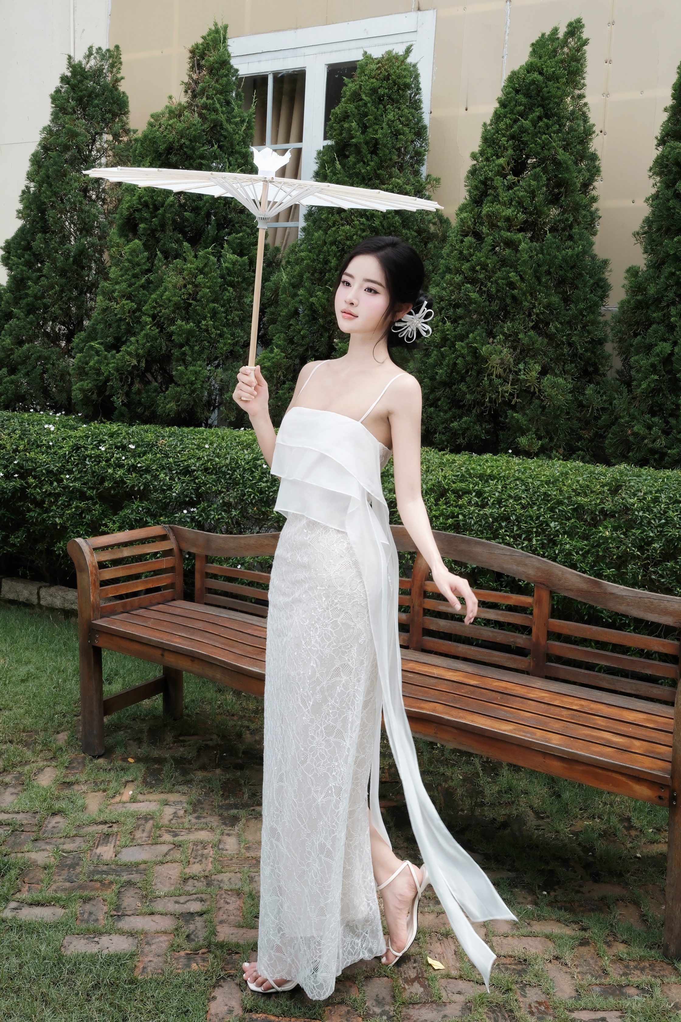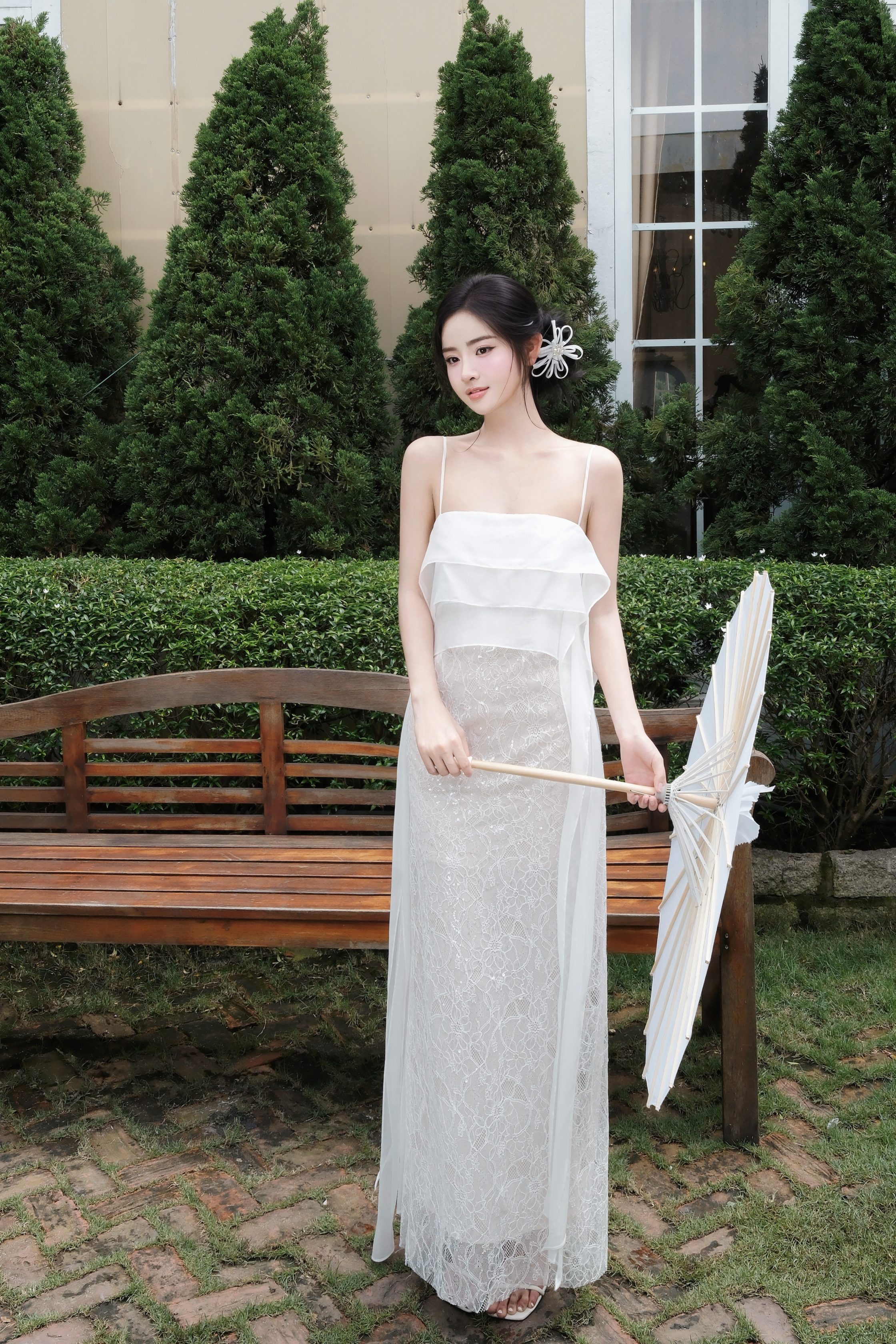 Chất liệu chính là ren hoa ánh kim sa nhẹ, được phối tinh tế giúp váy có độ bắt sáng vừa đủ, nổi bật nhưng không phô trương. Hai bên tà được nhấn bằng chi tiết dây thả rũ mềm mại, mang lại cảm giác uyển chuyển khi di chuyển. Phía sau váy có xẻ nhẹ, tăng độ linh hoạt khi bước đi.