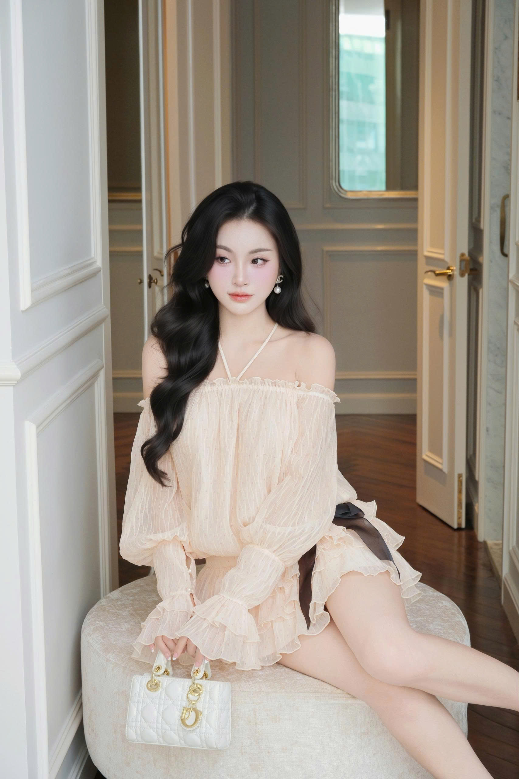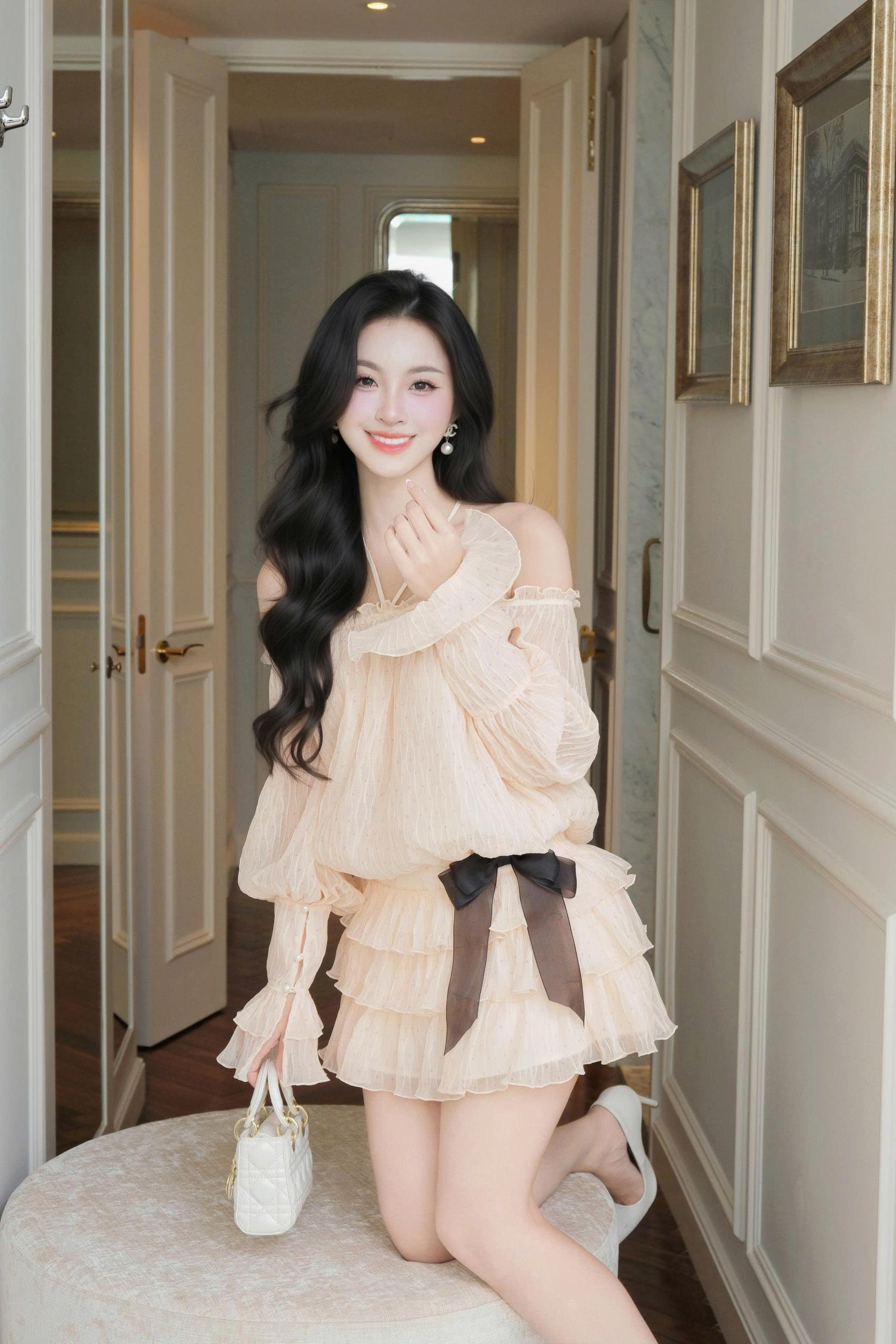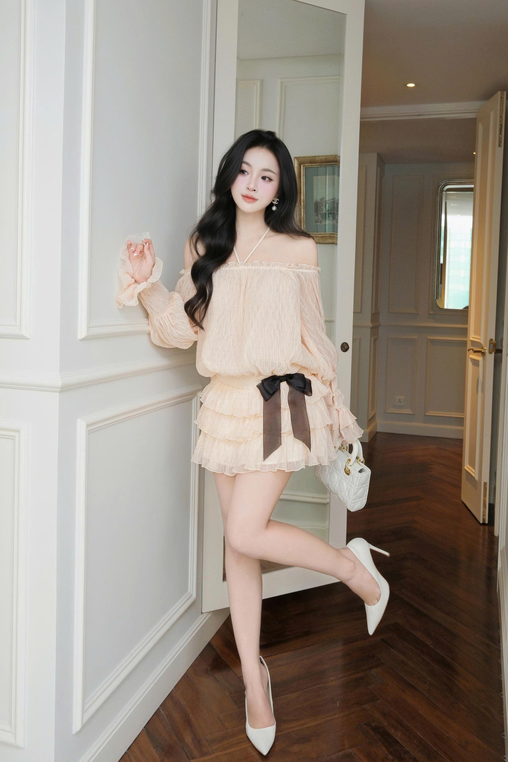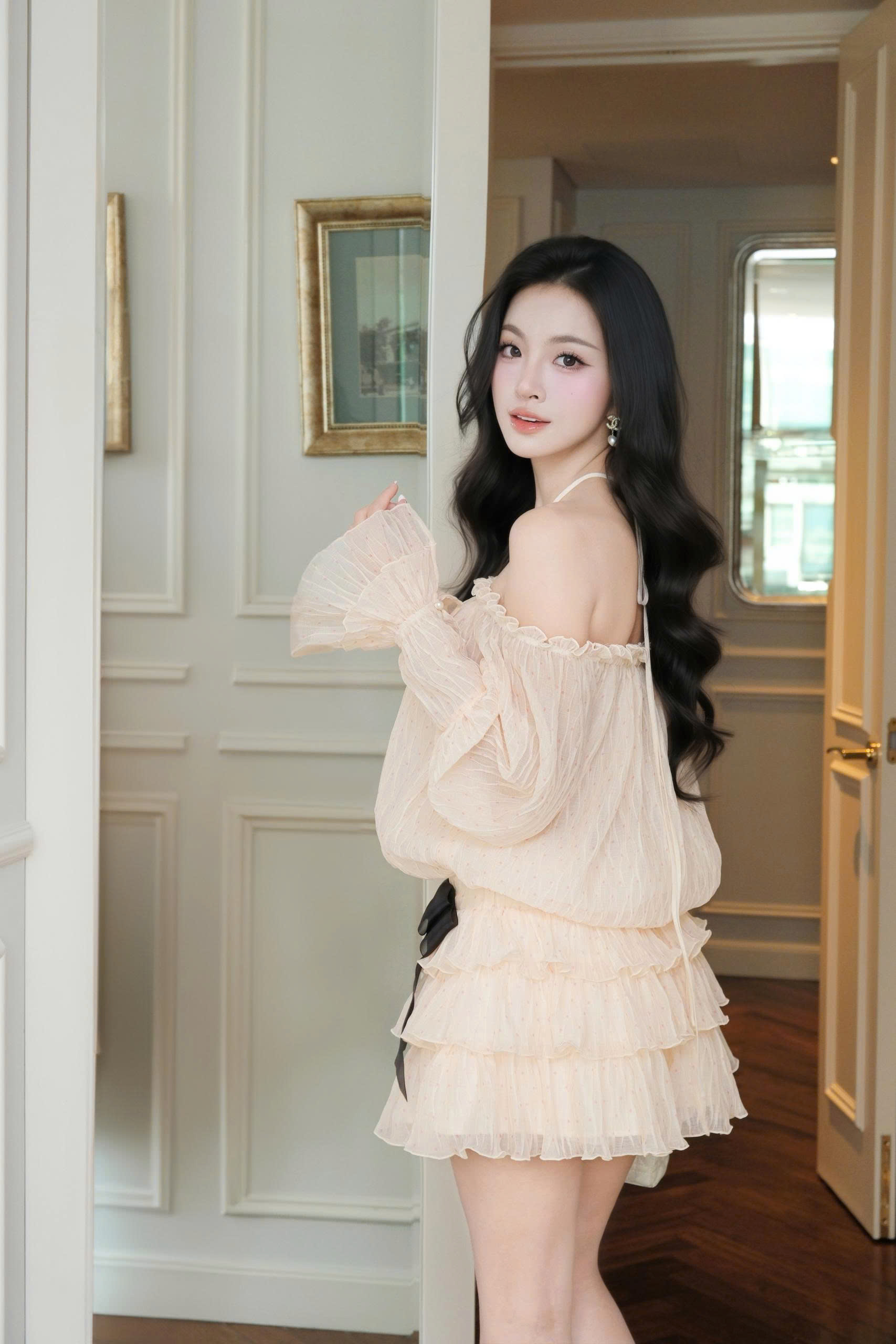Thiết kế trễ vai khoe bờ vai quyến rũ, phối dây halter quàng cổ phá cách giúp giữ dáng váy ổn định và ấn tượng hơn. Tay dài dáng phồng đính nút ngọc trai, phần ống tay loe xếp ly nhẹ tăng thêm vẻ điệu đà, bay bổng.