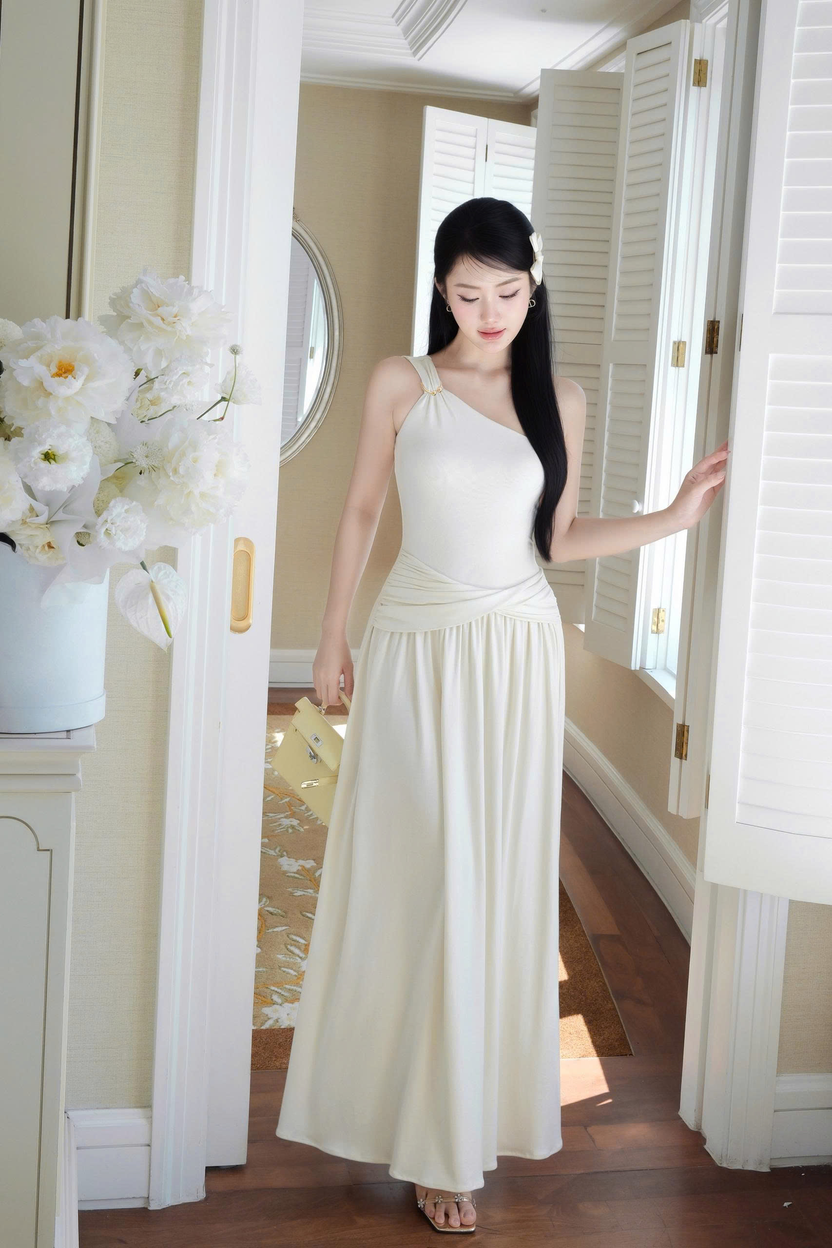 Thiết kế lệch vai gợi cảm, giúp khoe khéo bờ vai và xương quai xanh, đồng thời tạo điểm nhấn ấn tượng với chi tiết khoen vàng nổi bật ở dây vai. Phần eo được nhấn nhá bằng nút thắt nhẹ, tạo hiệu ứng tôn vòng eo và chuyển tiếp mềm mại đến phần chân váy xòe rủ nhẹ nữ tính.