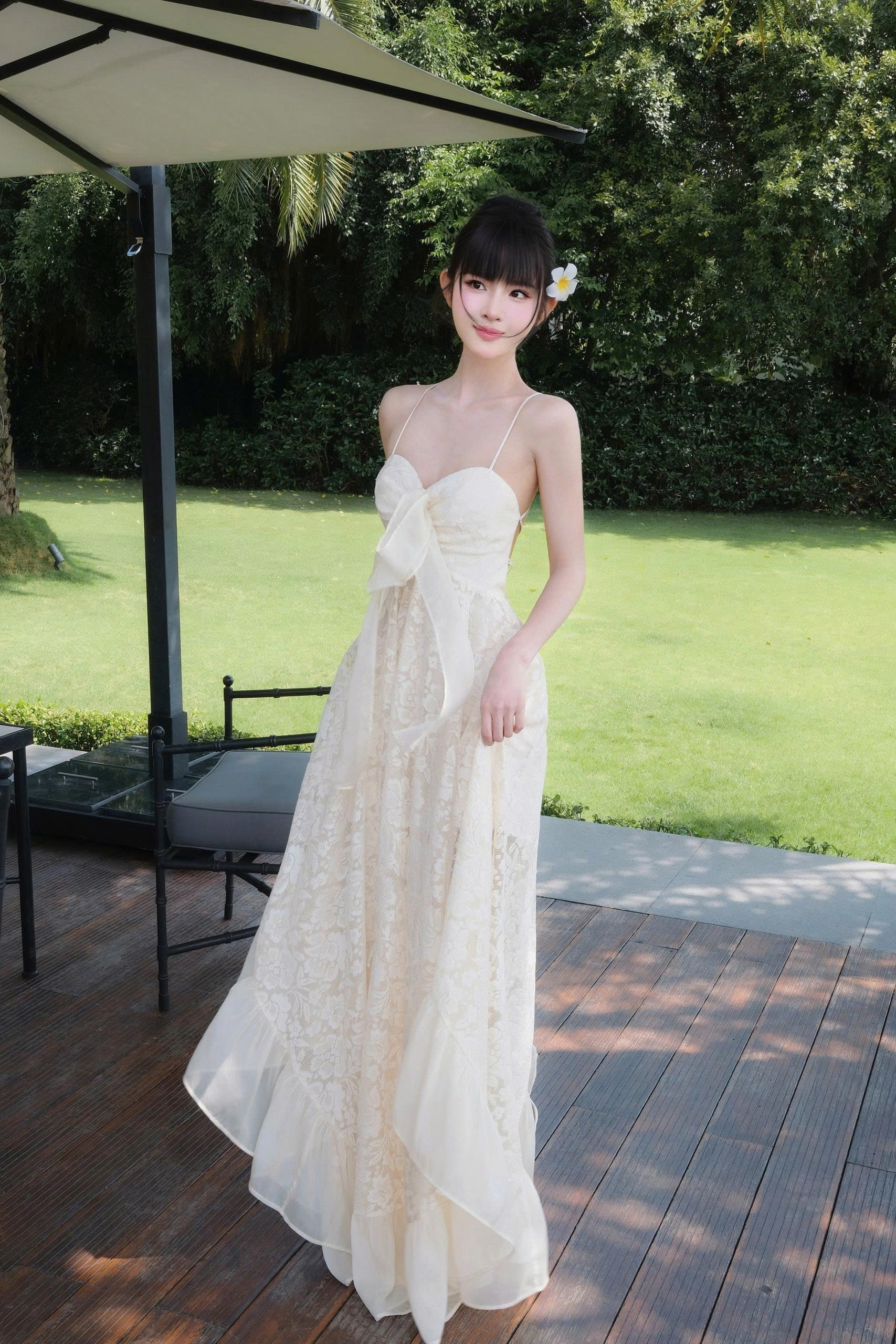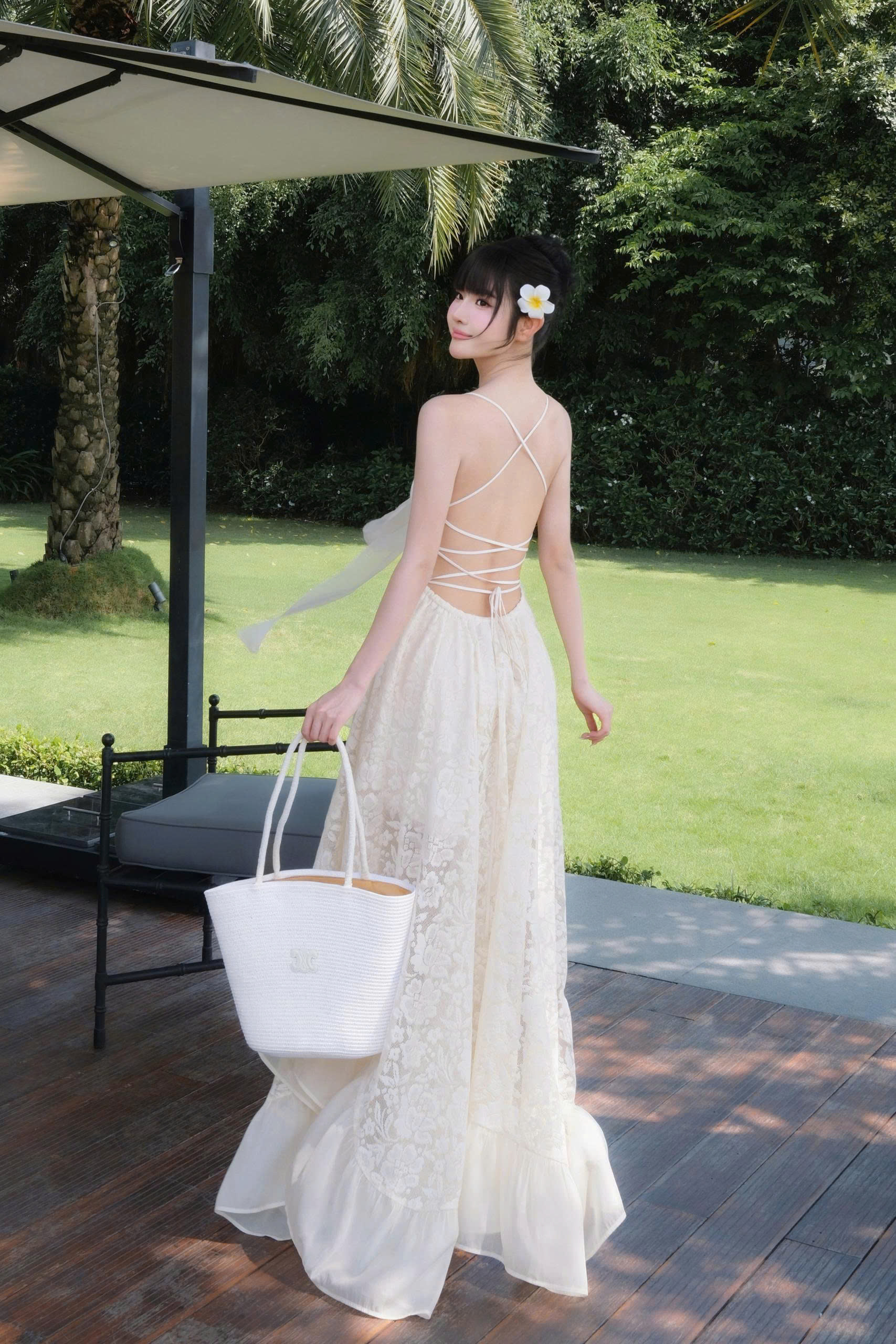 Chất liệu ren hoa kem cao cấp kết hợp cùng lớp lót lụa mềm mại bên trong mang lại cảm giác dễ chịu khi mặc, đồng thời giữ được vẻ sang trọng và tinh tế. Phần ngực đính nơ tằm nhẹ nhàng, mềm rủ tạo hiệu ứng mềm mại cho tổng thể, kết hợp với thiết kế 2 dây mảnh và chi tiết buộc lưng gợi cảm, giúp tôn trọn phần vai, lưng và vòng eo của người mặc.