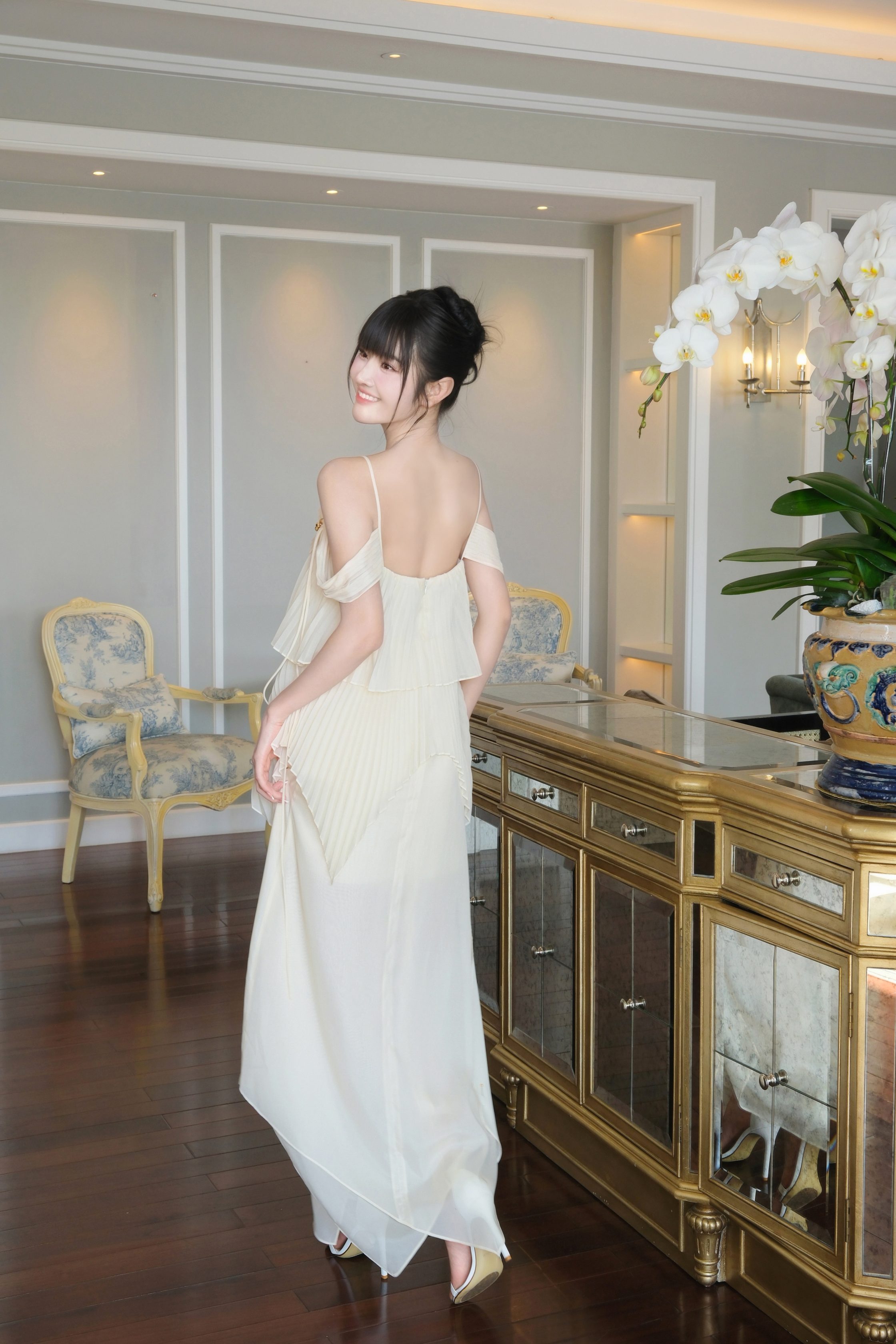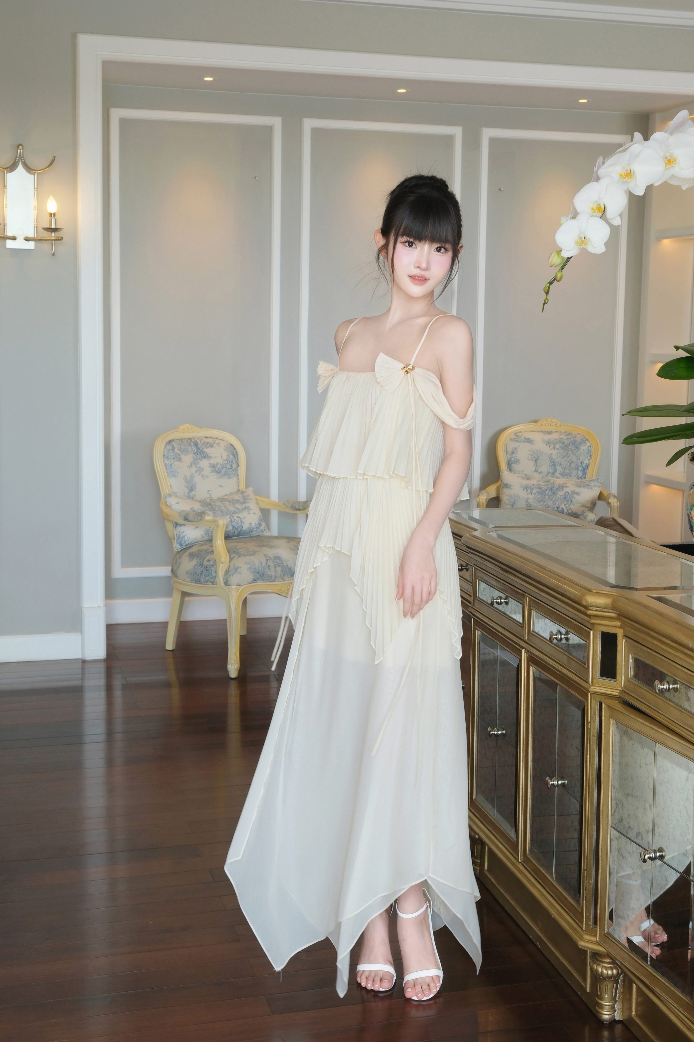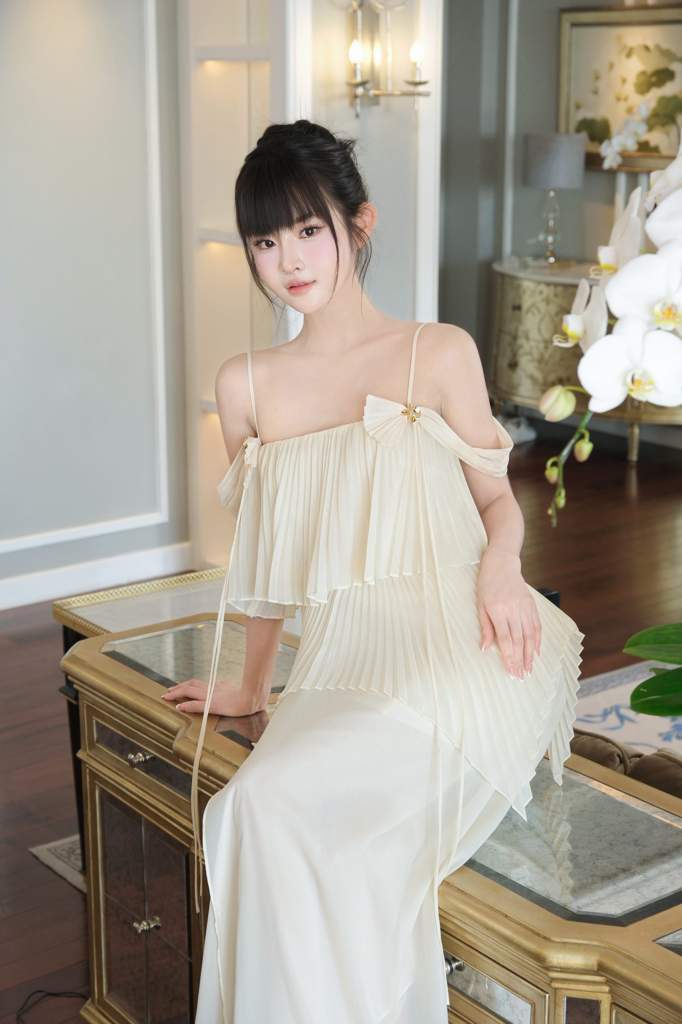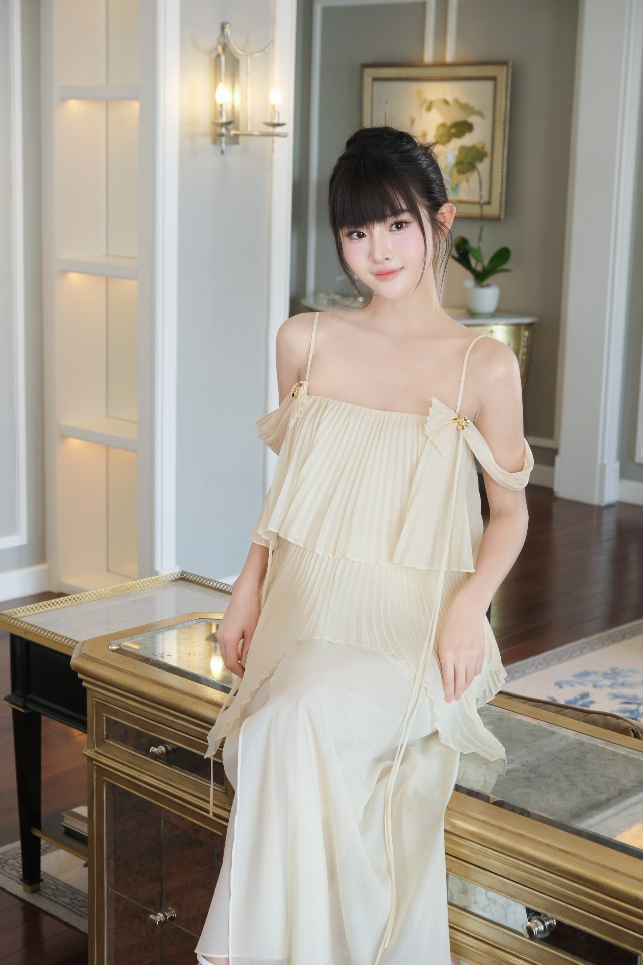 Phần ngực và thân trên được xếp ly dọc kết hợp layer hai tầng vừa nữ tính vừa khéo léo che khuyết điểm vòng 2. Tà váy xếp tầng với vạt xéo rũ dài, tạo hiệu ứng bồng bềnh nhẹ nhàng, mang lại nét bay bổng và thanh thoát.