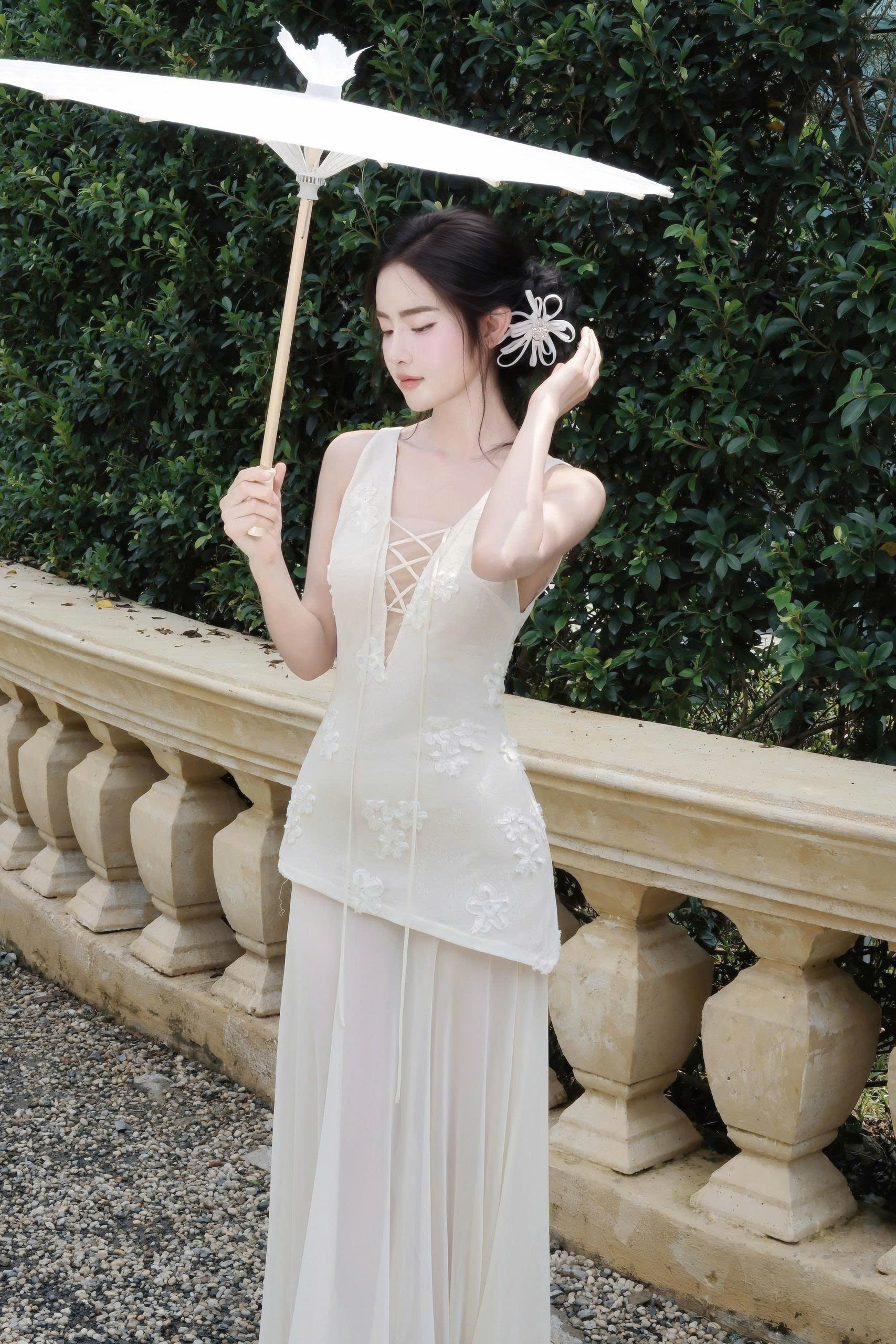 Lớp trong là tùng váy lưới A-line màu kem nhạt, rũ nhẹ và dài chạm đất, tạo hiệu ứng bay bổng, thanh thoát khi di chuyển.