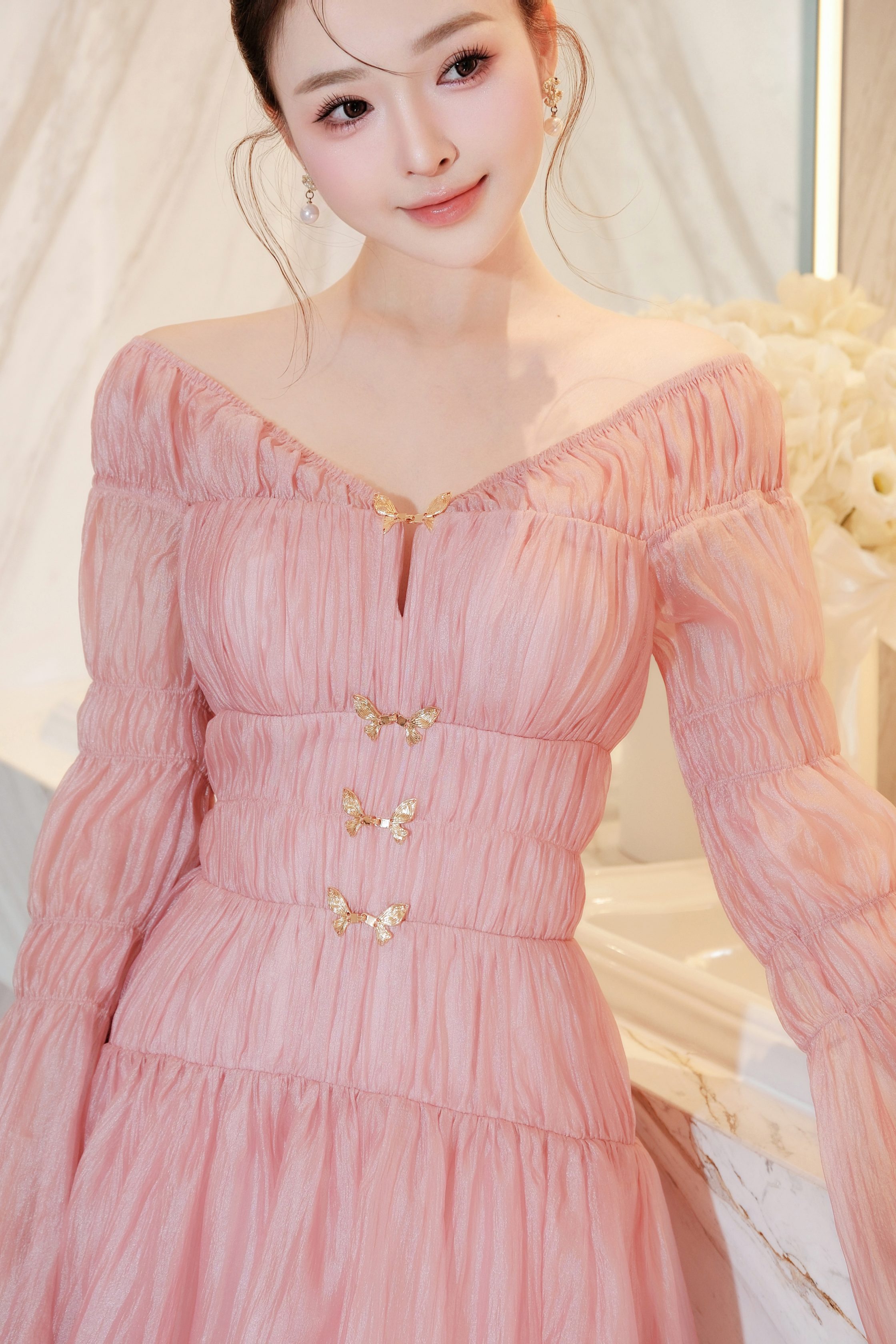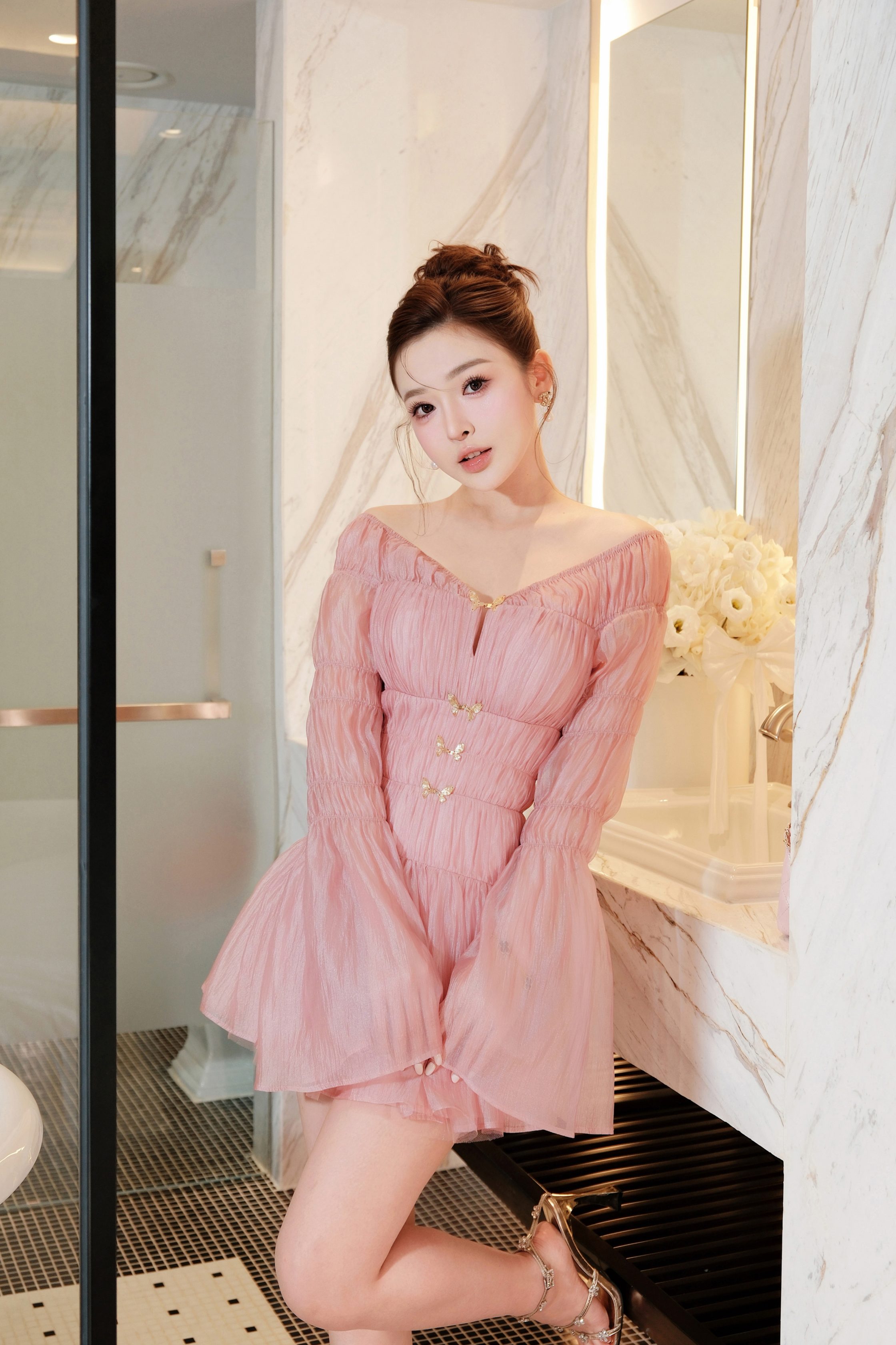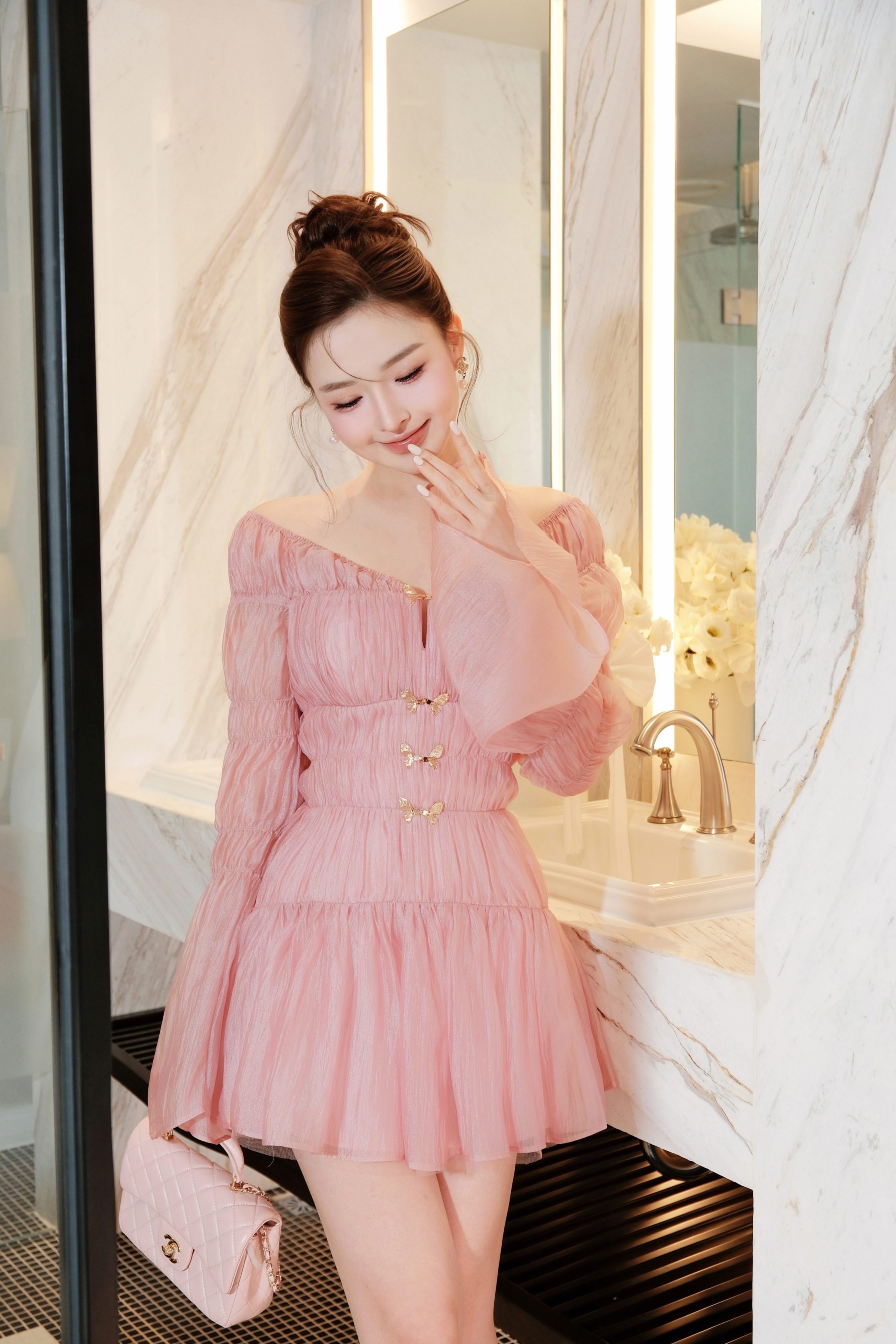 Đánh giá KD348 – Đầm ngắn tơ óng hồng với chi tiết charm hồ điệp ánh vàng phong cách ngọt ngào thanh lịch