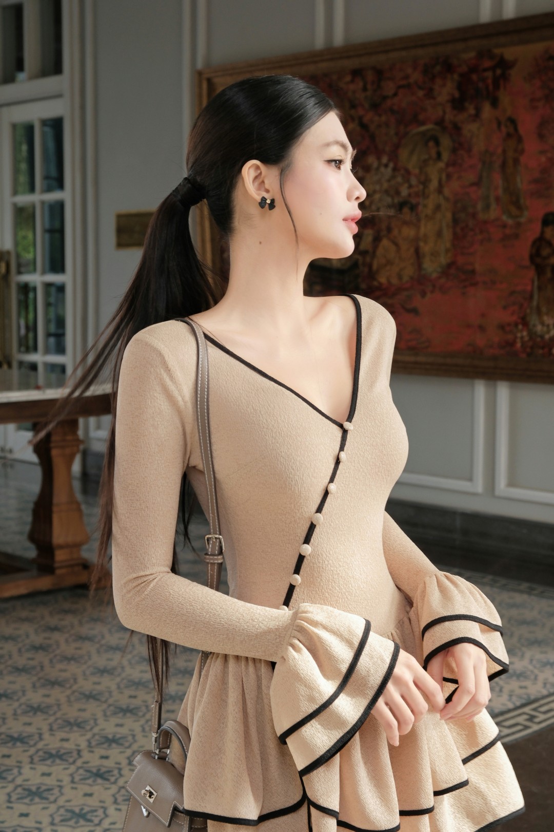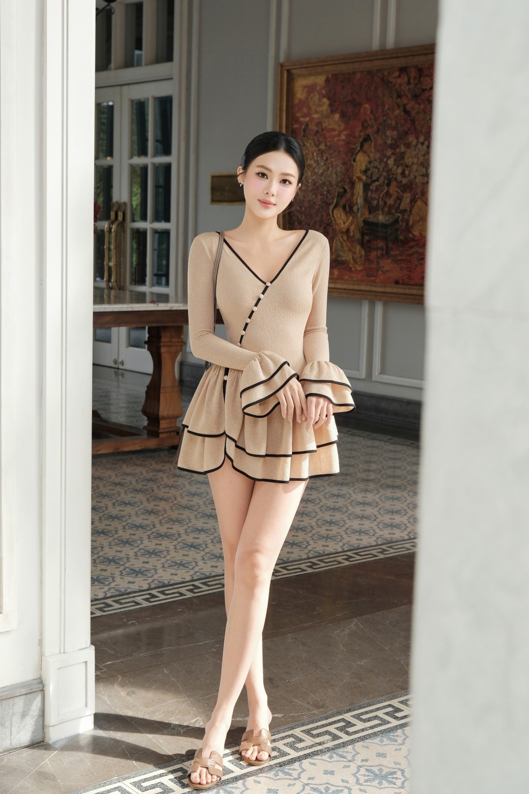 Thiết kế dáng váy fit & flare ôm gọn phần thân, kết hợp tùng váy xếp tầng layer giúp tạo độ bồng xòe tự nhiên, làm nổi bật đường cong và tạo hiệu ứng chuyển động mềm mại khi di chuyển. Cổ chữ V sâu vừa phải tôn lên vùng cổ thanh thoát và xương quai xanh quyến rũ, trong khi tay áo dài loe nhẹ cùng viền đen – nút bọc chạy dọc váy mang đến điểm nhấn hài hòa, tinh tế.