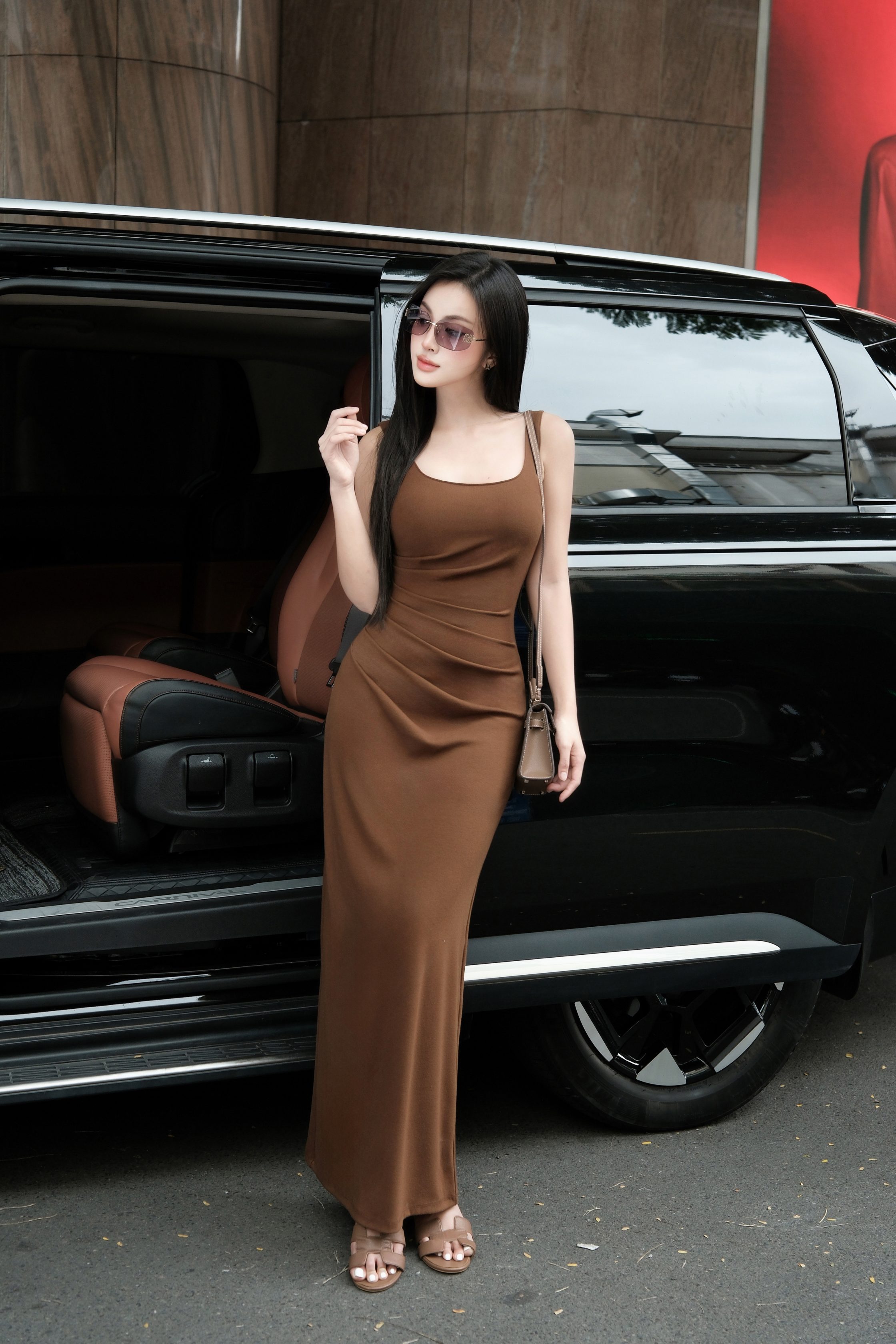 Đánh giá KD366 – Đầm maxi ôm body tone nâu đất, dây bản lớn thanh thoát, nhấn nếp gấp tinh tế, tôn dáng