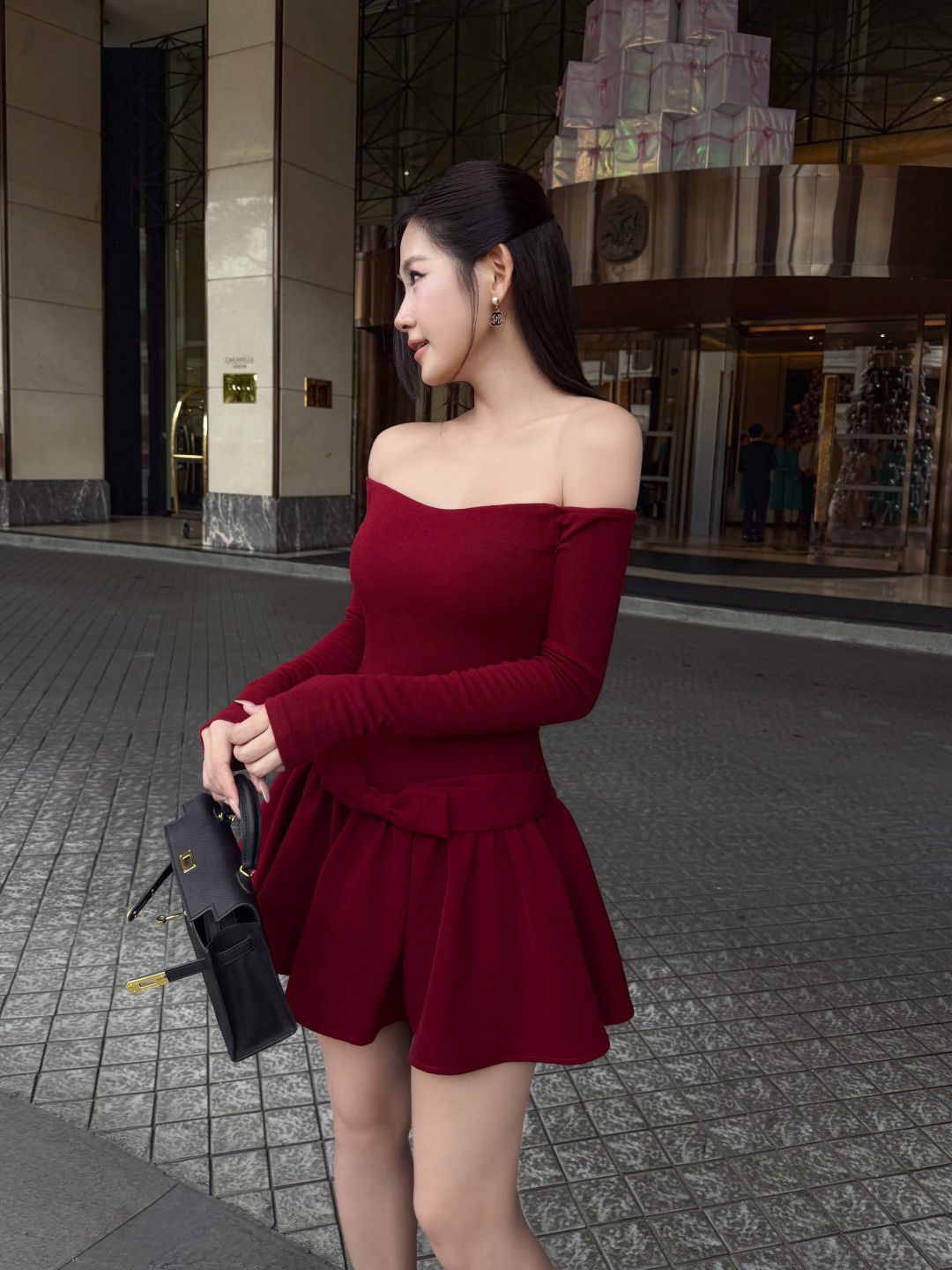 ✔️ Thiết kế – Mini dress trễ vai tay dài, tùng xòe hack dáng, nơ hông tạo điểm nhấn, khóa kéo sau
