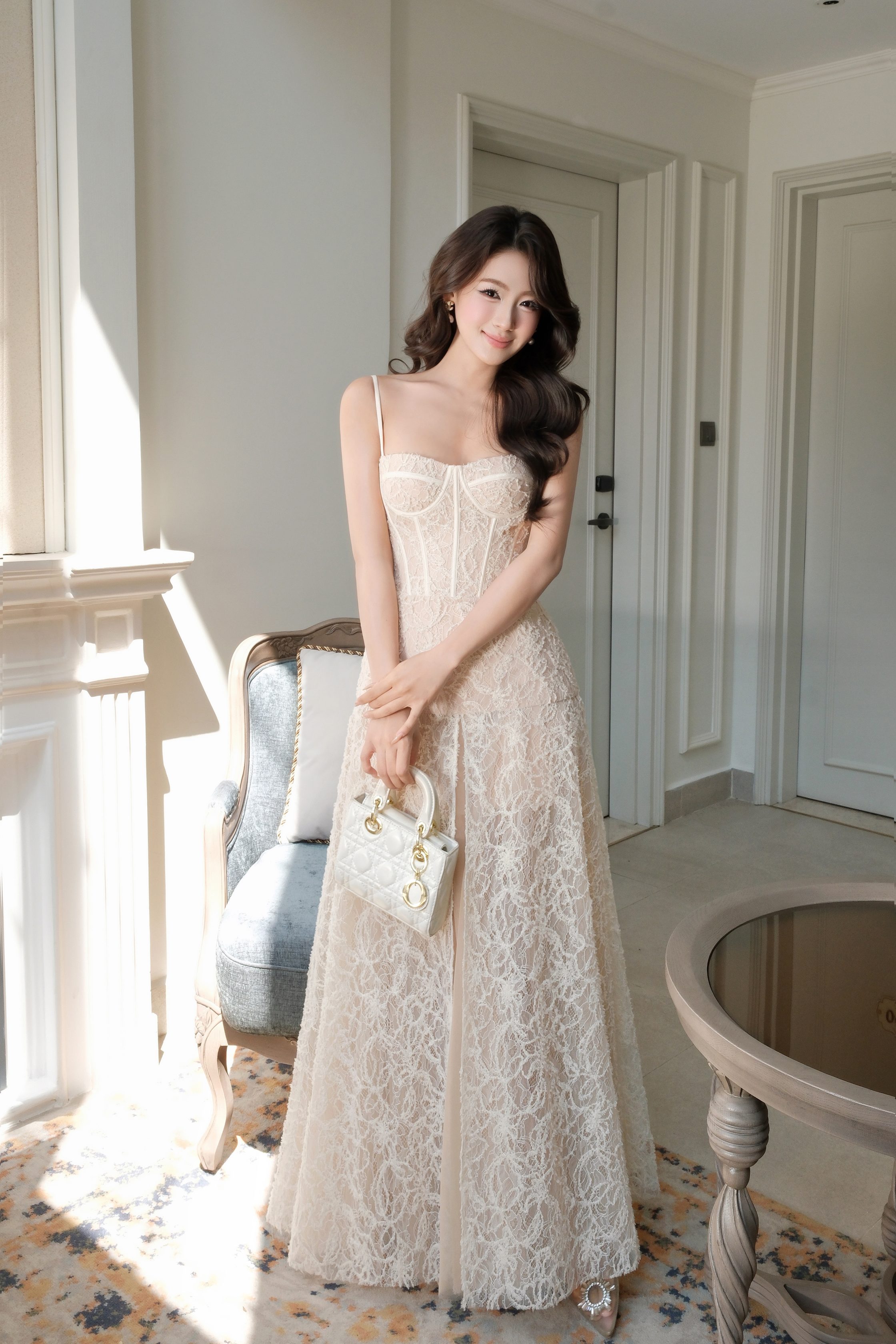 Đánh giá KD550 – Đầm dài ren kem corset xẻ tà sang chảnh cao cấp | Khiết