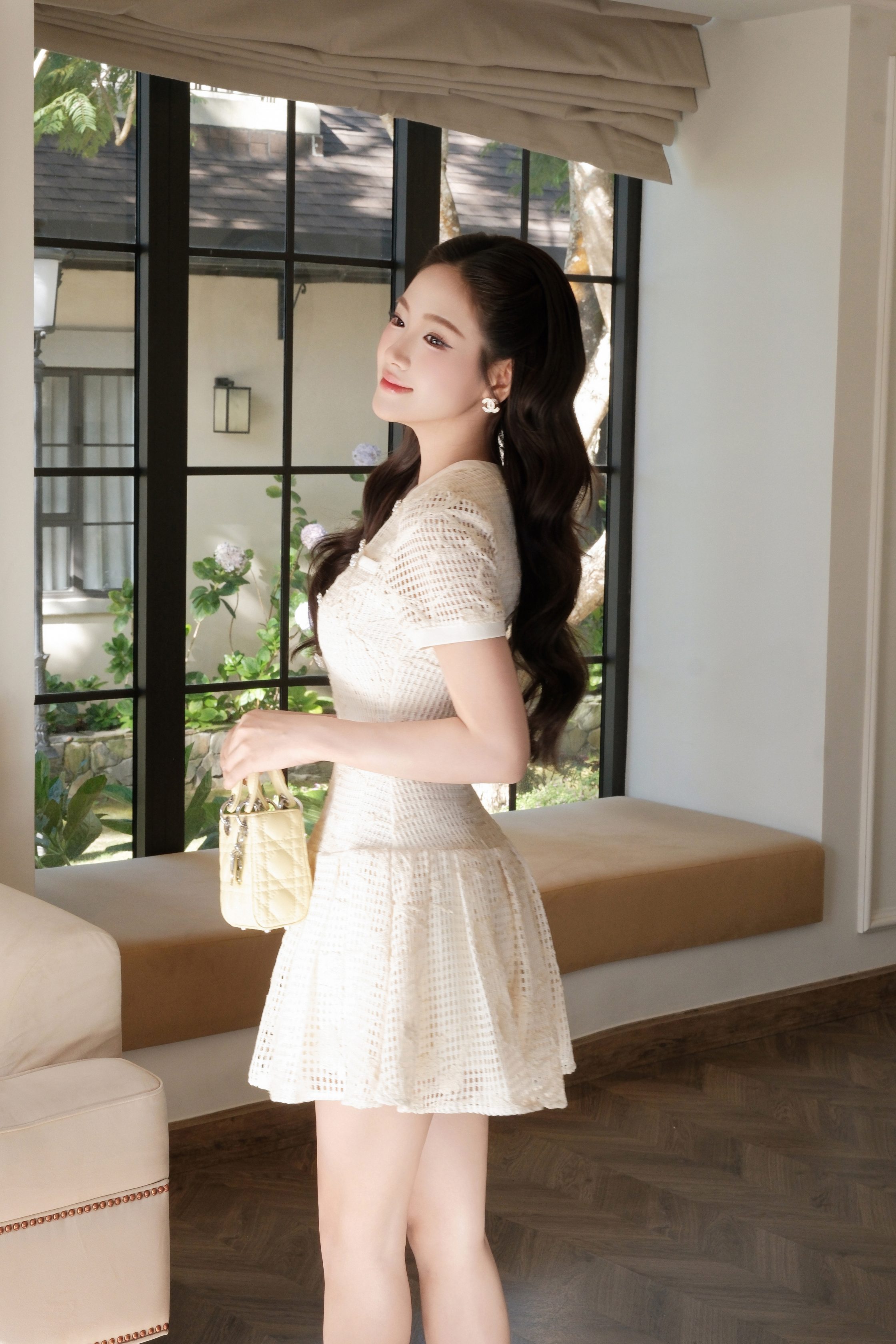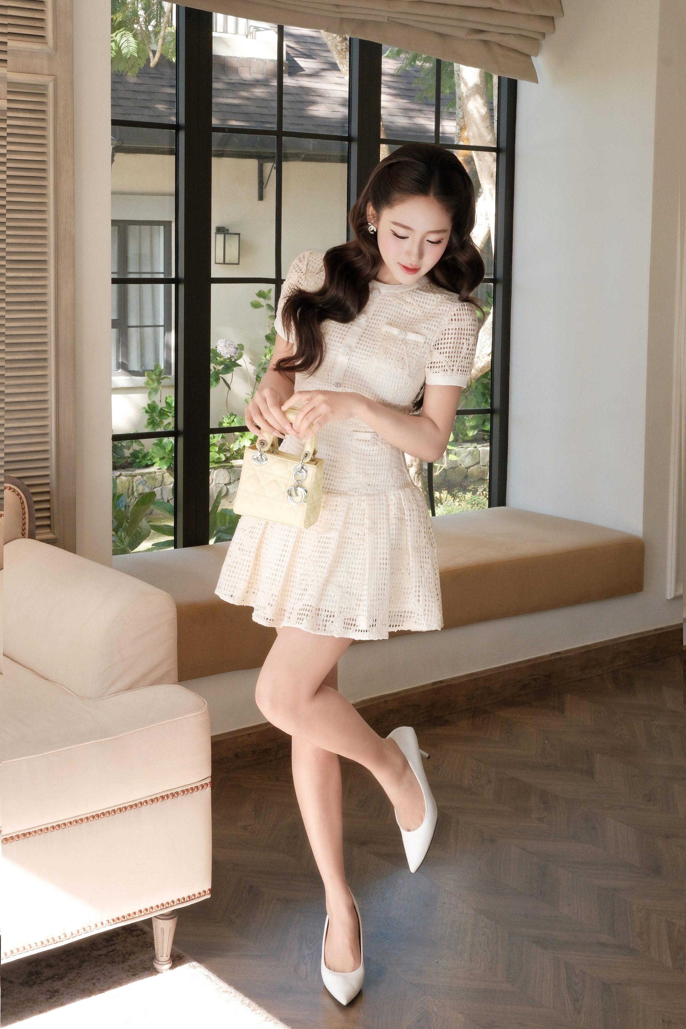 KD552 là thiết kế đầm ngắn mang tinh thần thanh lịch – tiểu thư – tinh tế, dành cho nàng yêu phong cách nhẹ nhàng nhưng vẫn muốn tạo điểm nhấn sang trọng. Đầm được thực hiện trên nền ren ô thêu hoa kem, họa tiết mềm mại, gam màu trang nhã giúp tôn da và tạo cảm giác cao cấp.