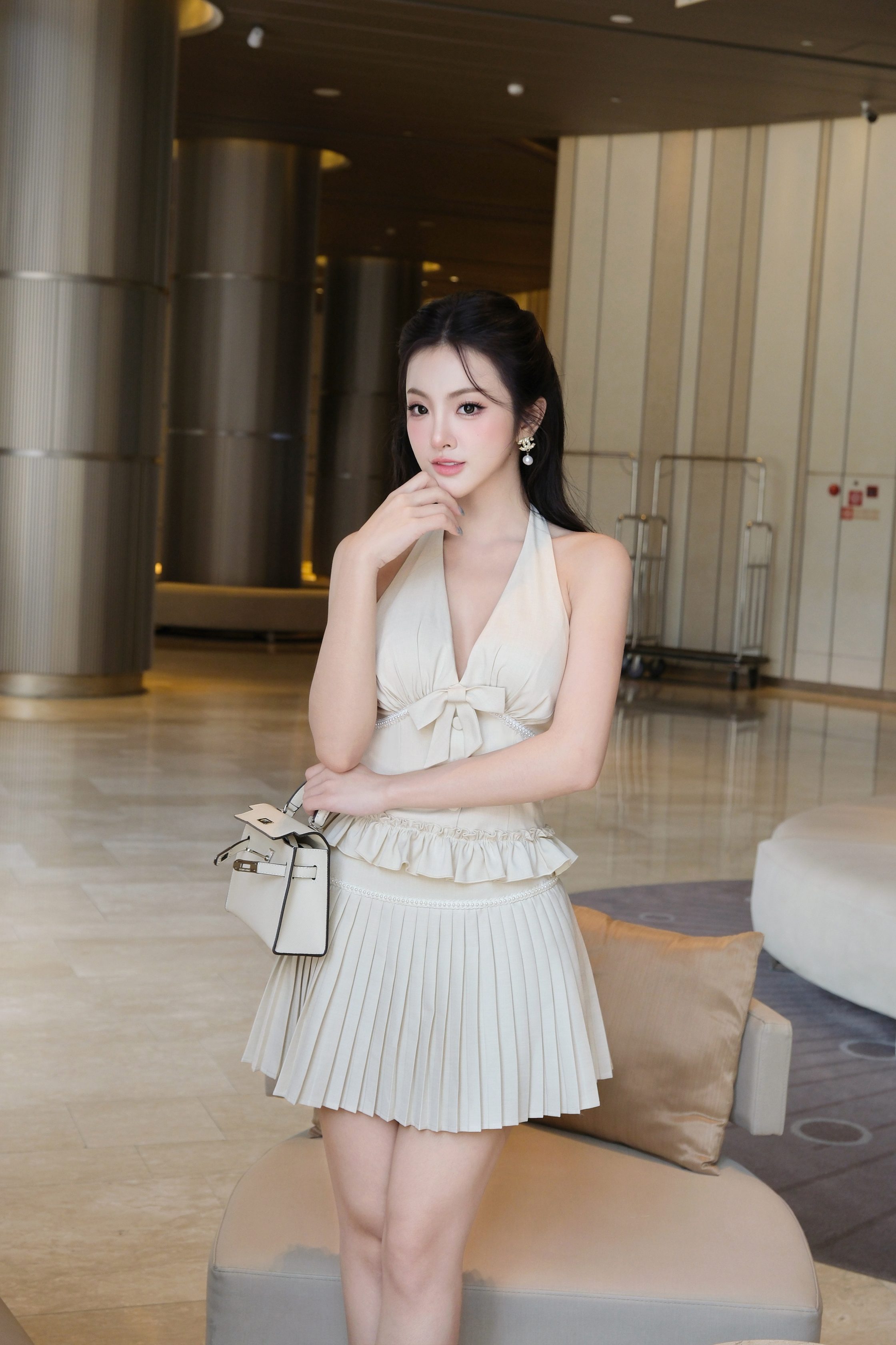 KS207 – Set váy cổ yếm ngọc trai từ Khiết là lựa chọn hoàn hảo cho những cô nàng yêu phong cách thanh lịch pha chút gợi cảm. Bộ sản phẩm gồm áo cổ yếm dáng ôm nhẹ, phối chân váy ngắn xếp ly, mang lại tổng thể nữ tính và duyên dáng.