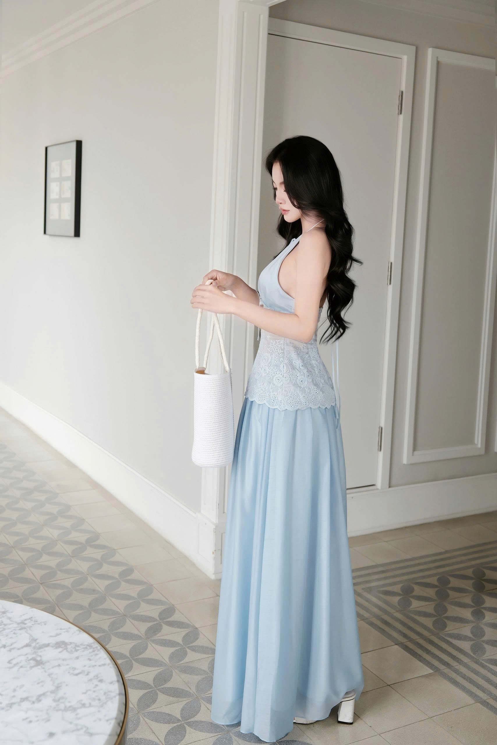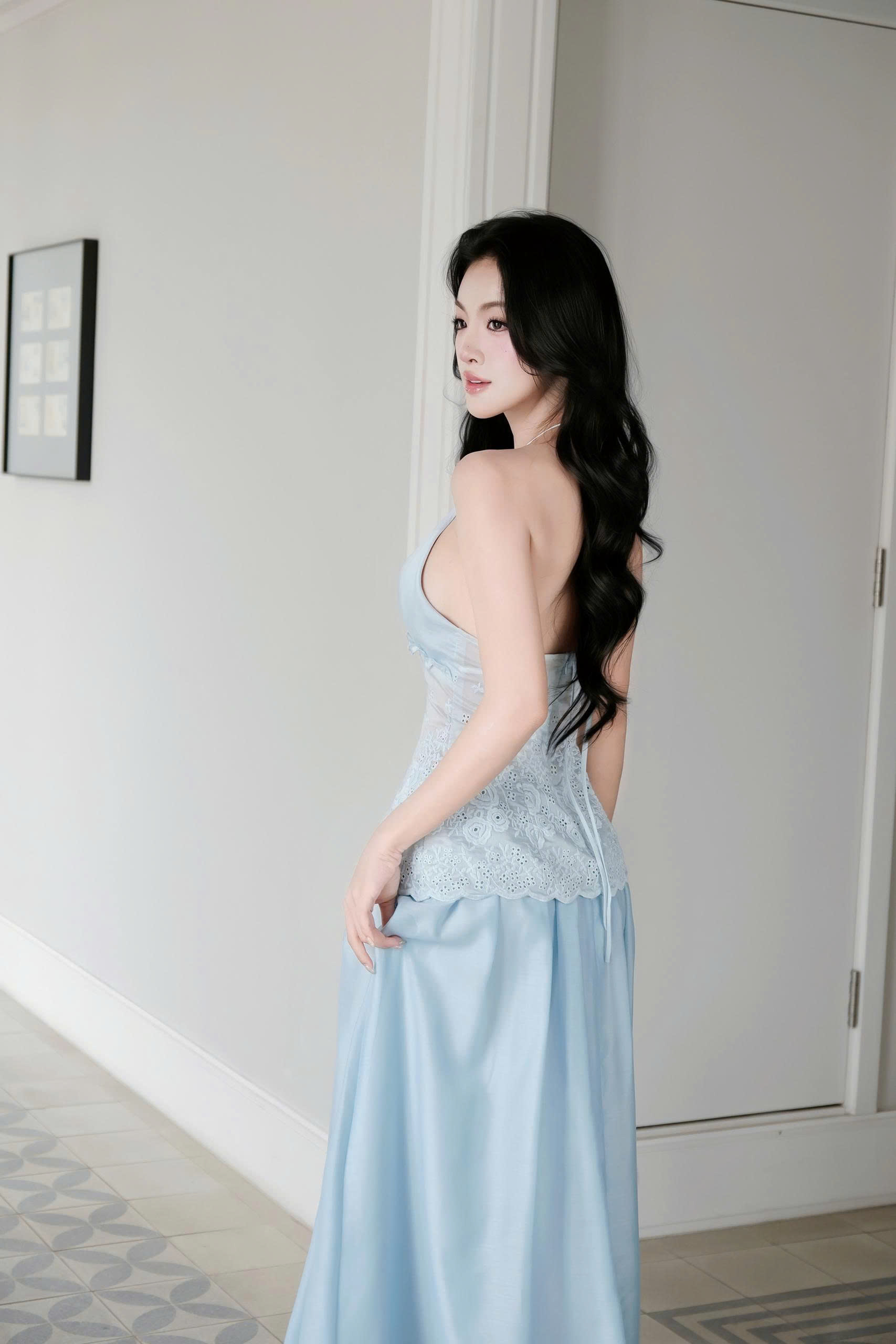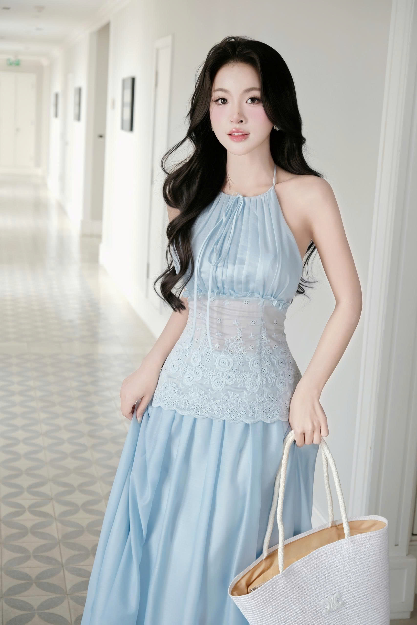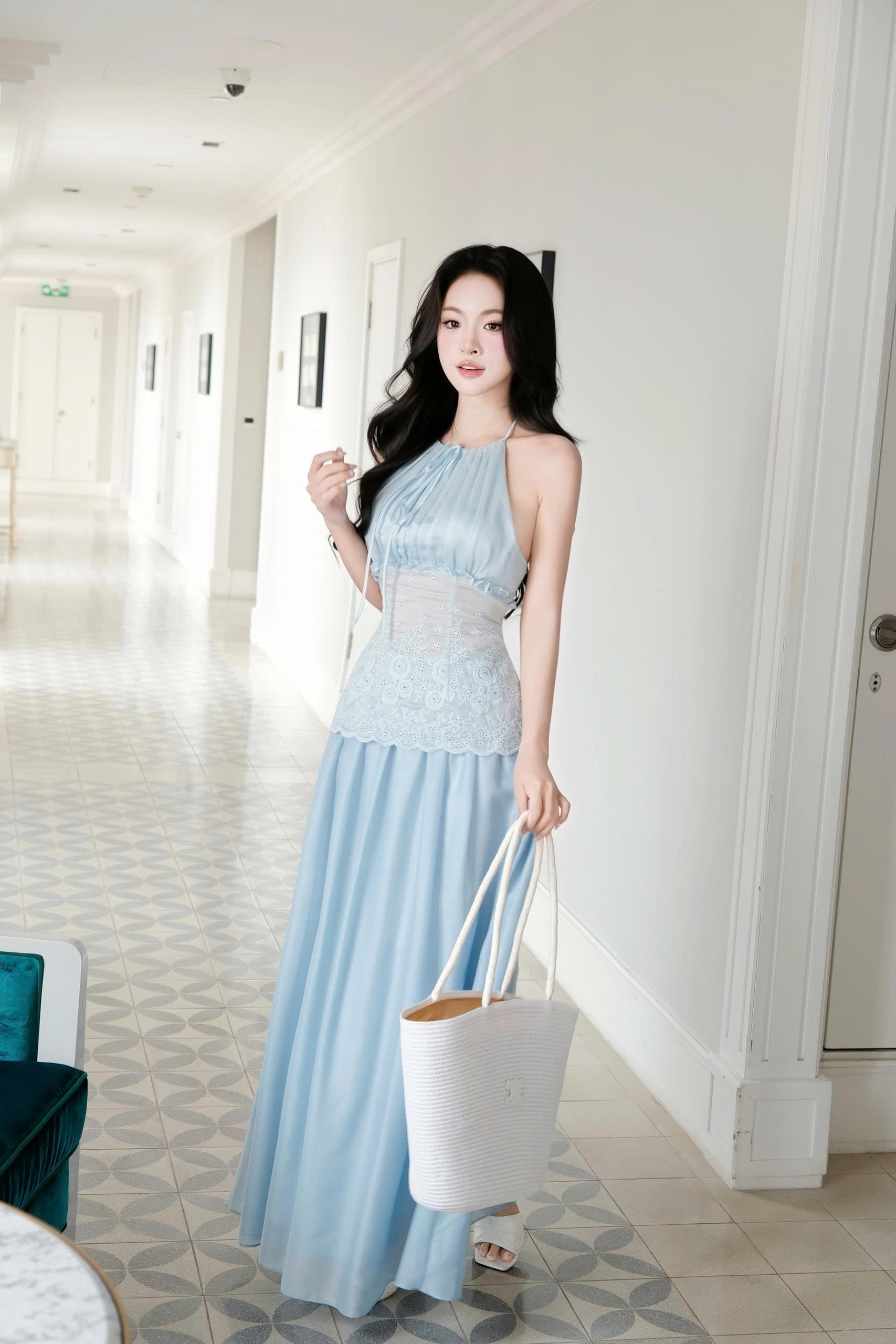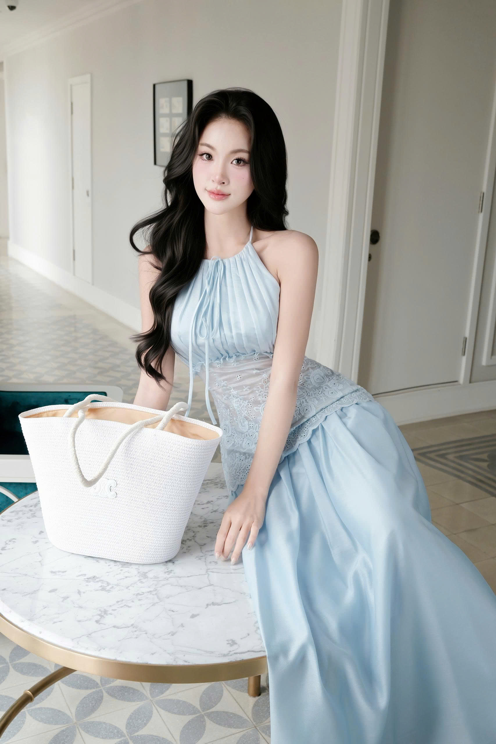 Phần chân váy dáng maxi suông nhẹ, rũ tự nhiên, tạo cảm giác bay bổng, rất phù hợp với không khí mùa hè. Chất liệu xô Hàn phối tơ Nhật mềm mại, thoáng mát, mặc cả ngày vẫn thoải mái. Cả hai phần đều có lót lụa mịn và khóa kéo sau lưng, dễ mặc, dễ di chuyển.