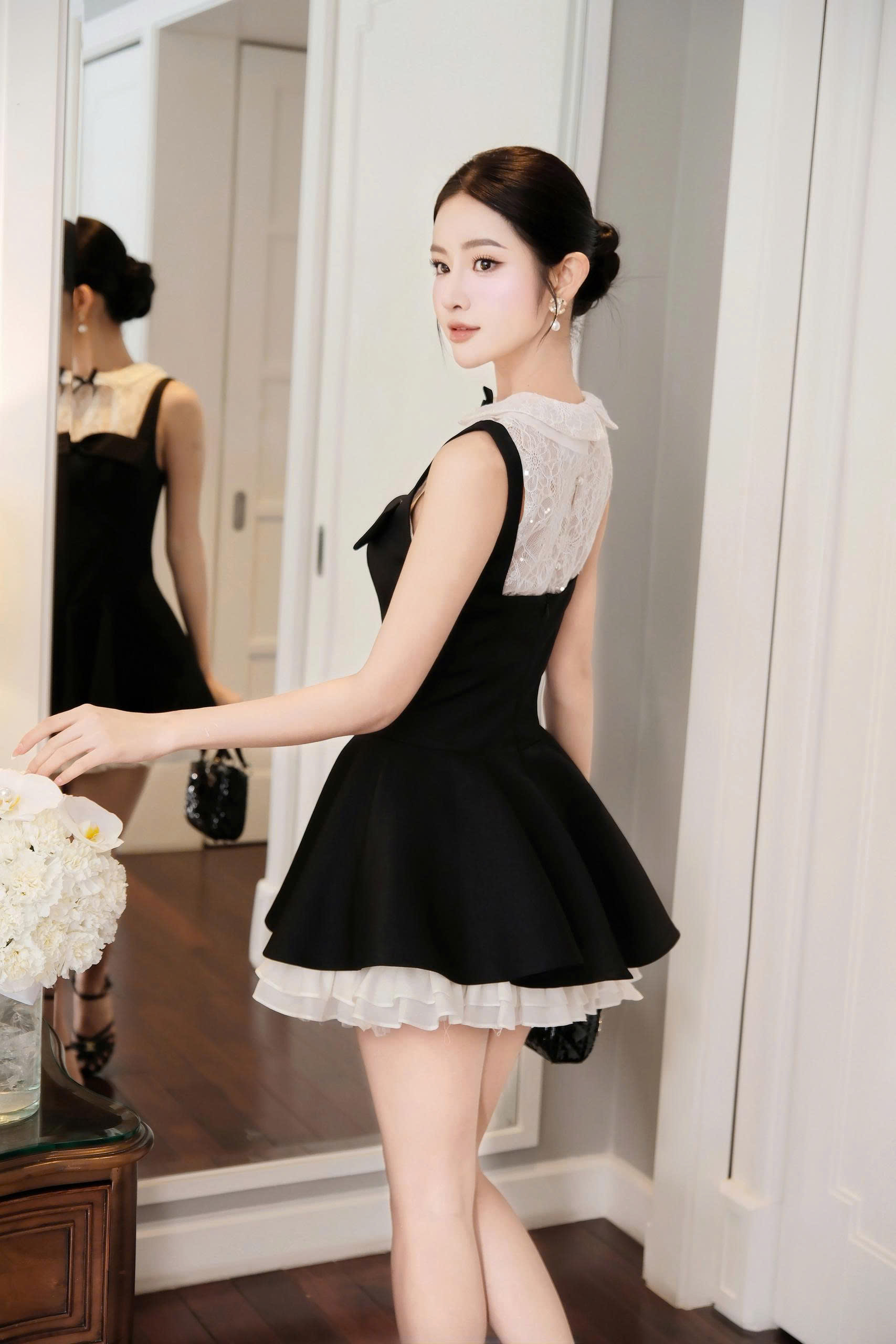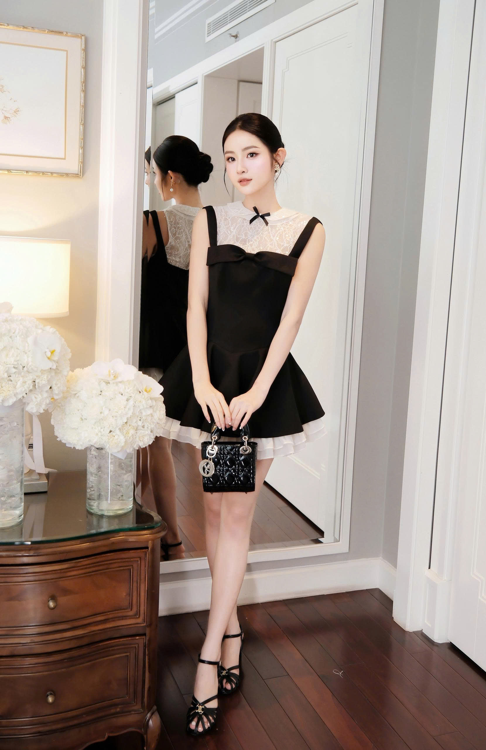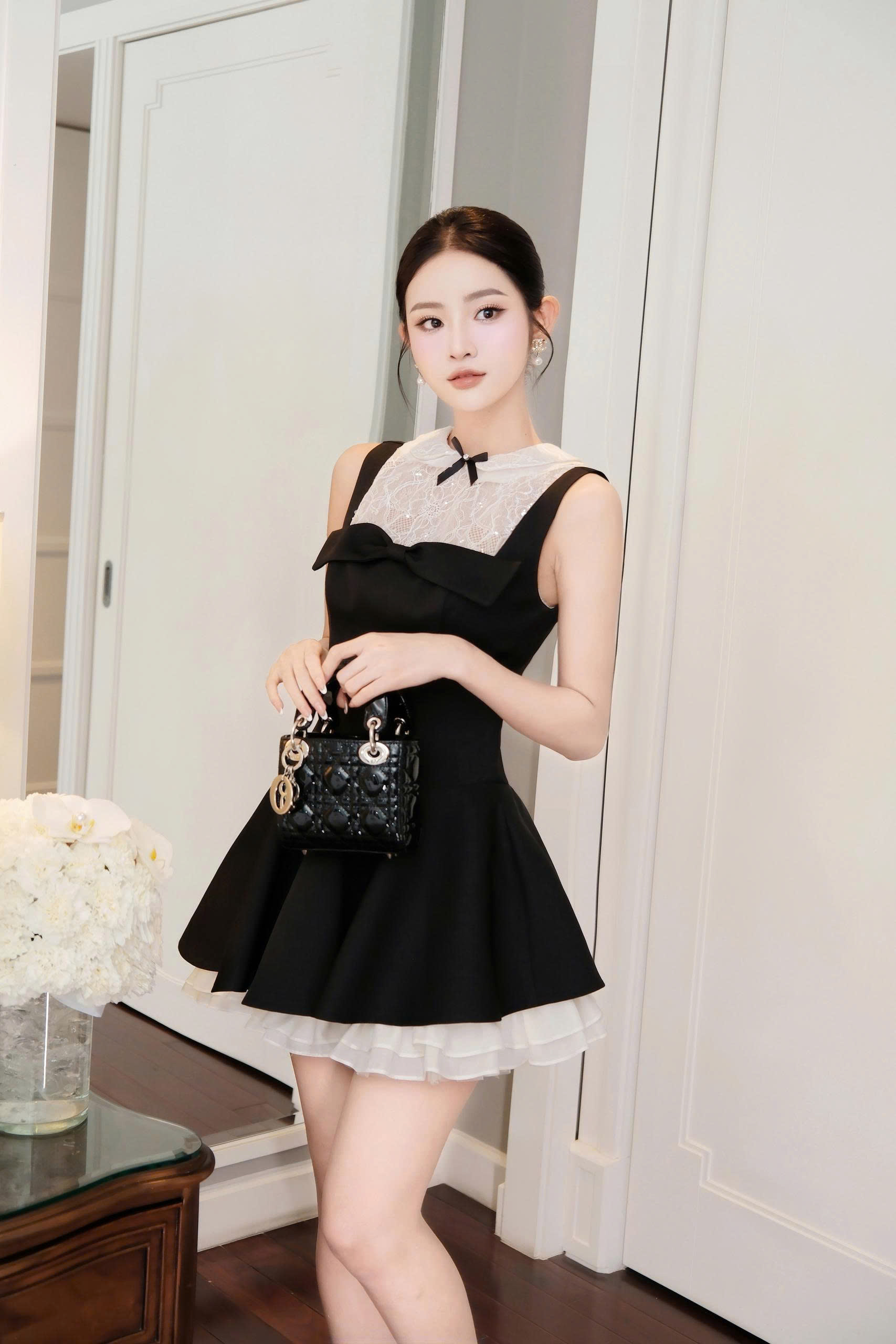 – Lớp ngoài là váy đen 2 dây, dáng ôm nhẹ phần eo tôn dáng, đính nơ to trước ngực, tạo vẻ ngọt ngào. Tùng váy xoè bồng, phủ lớp bèo tầng trắng bên dưới, tạo hiệu ứng bay bổng và nữ tính khi di chuyển. Váy có lớp lót lụa và quần trong, giúp bạn thoải mái và kín đáo khi mặc.