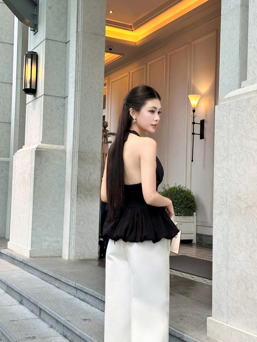 Áo cổ yếm dáng peplum – thiết kế tôn dáng với chiết eo nhẹ, chân áo xòe bồng bềnh, giúp tạo hiệu ứng eo thon – dáng đẹp. Điểm nhấn 2 chiếc nơ trắng nổi bật, vừa nữ tính vừa trẻ trung, hiện đại.