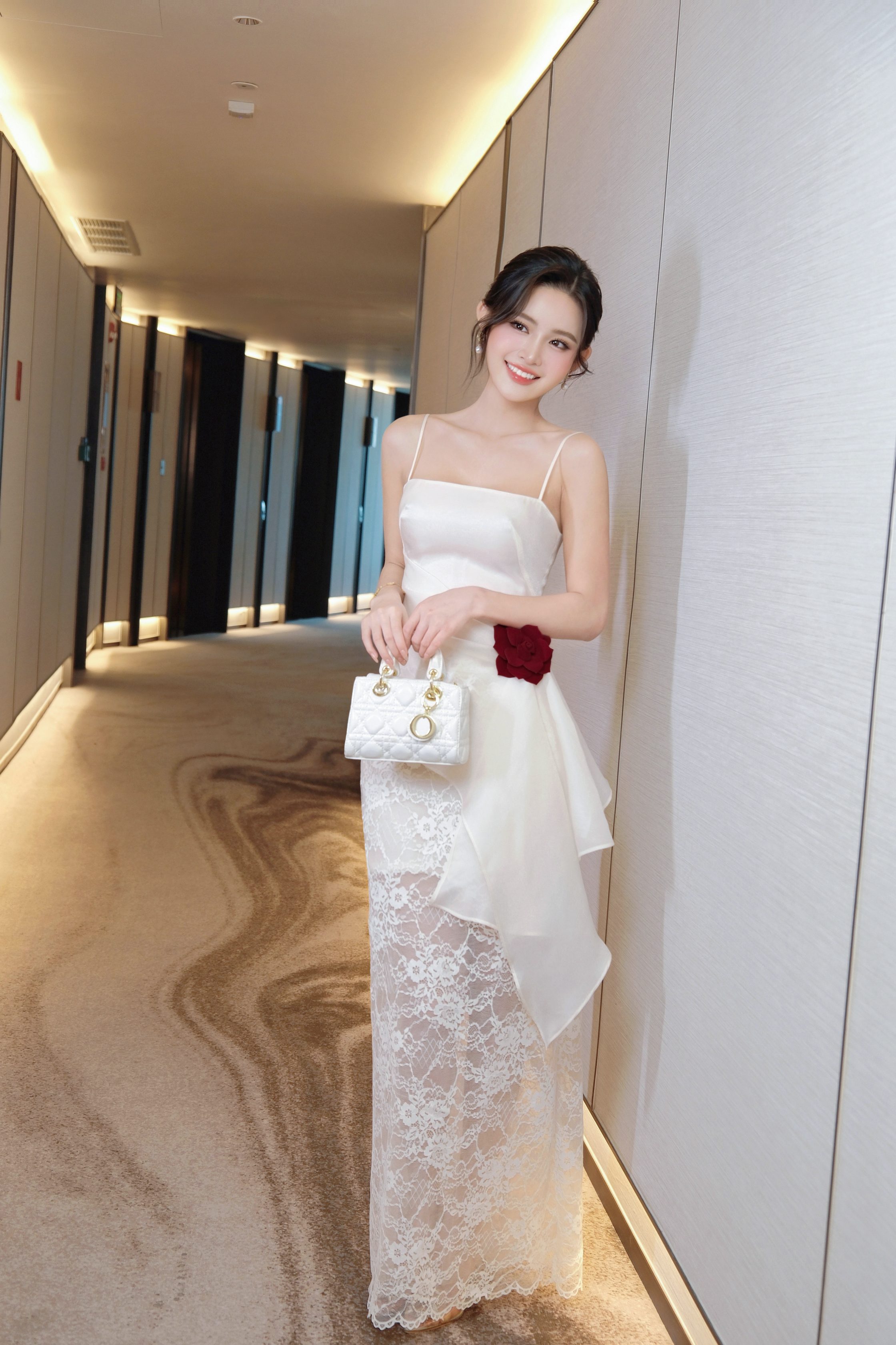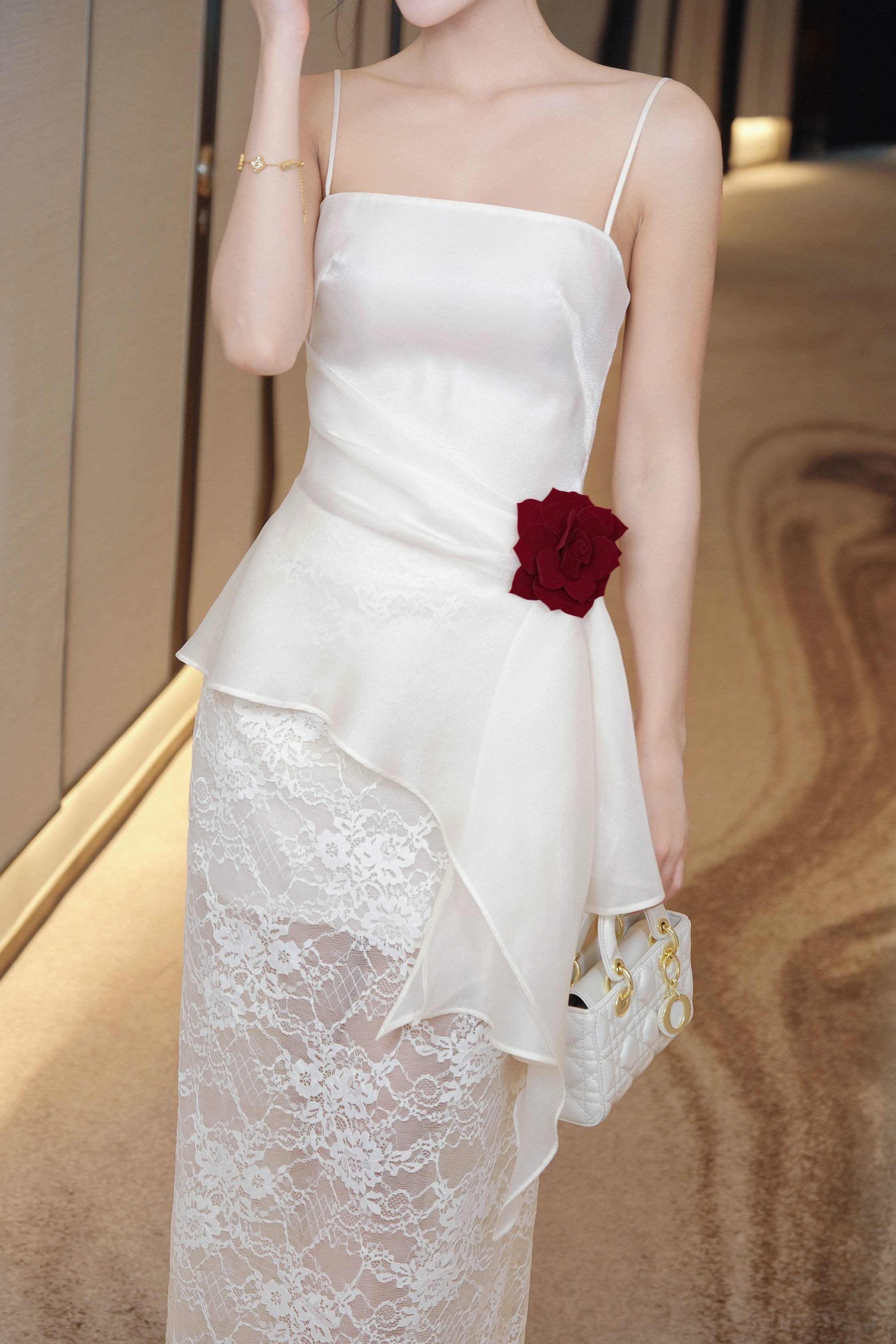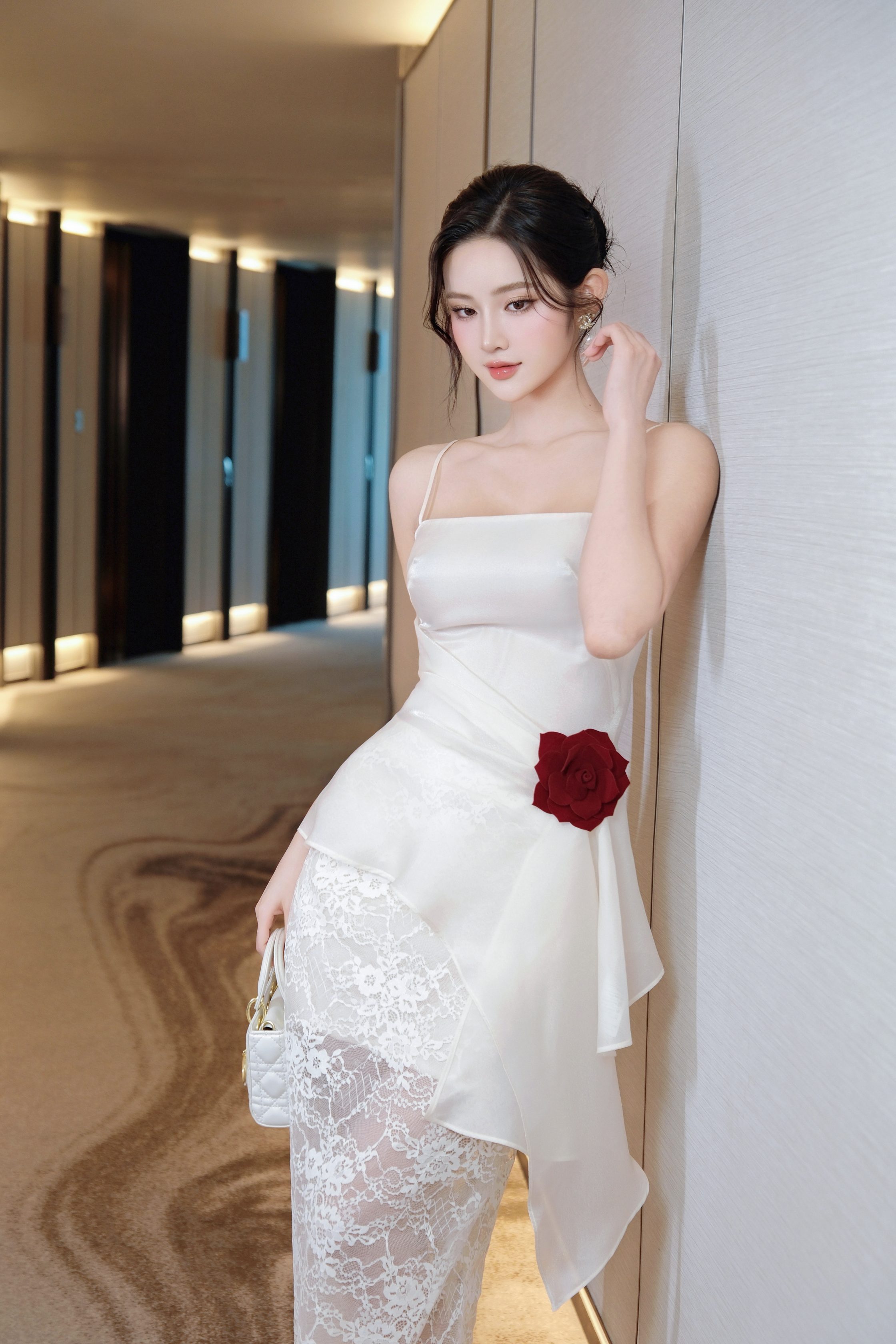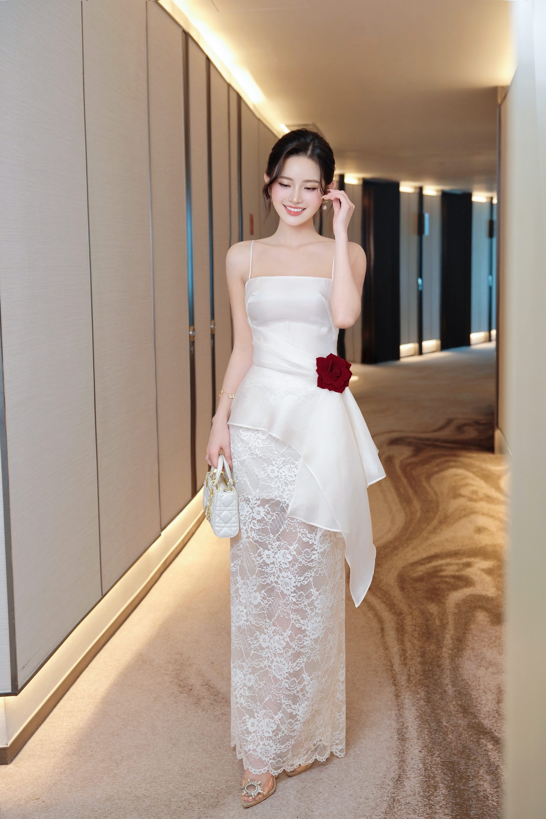 Chi tiết vạt lượn chéo xếp khéo ở hông, tạo hiệu ứng thon gọn và tôn dáng tối đa, điểm xuyết thêm hoa đỏ tại eo – điểm nhấn đầy nghệ thuật, khiến tổng thể thêm phần ấn tượng.
