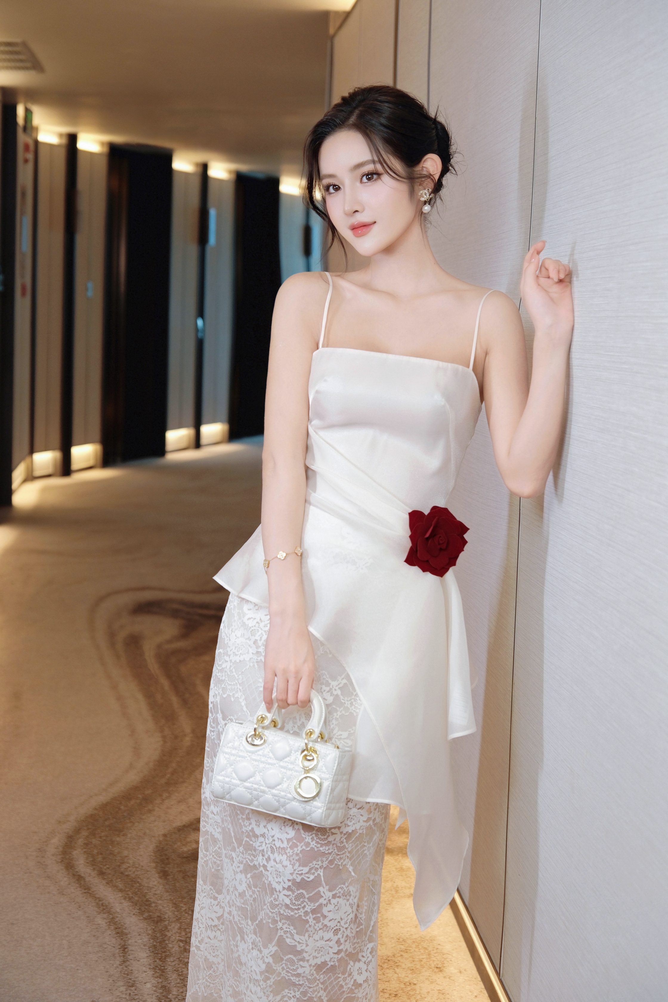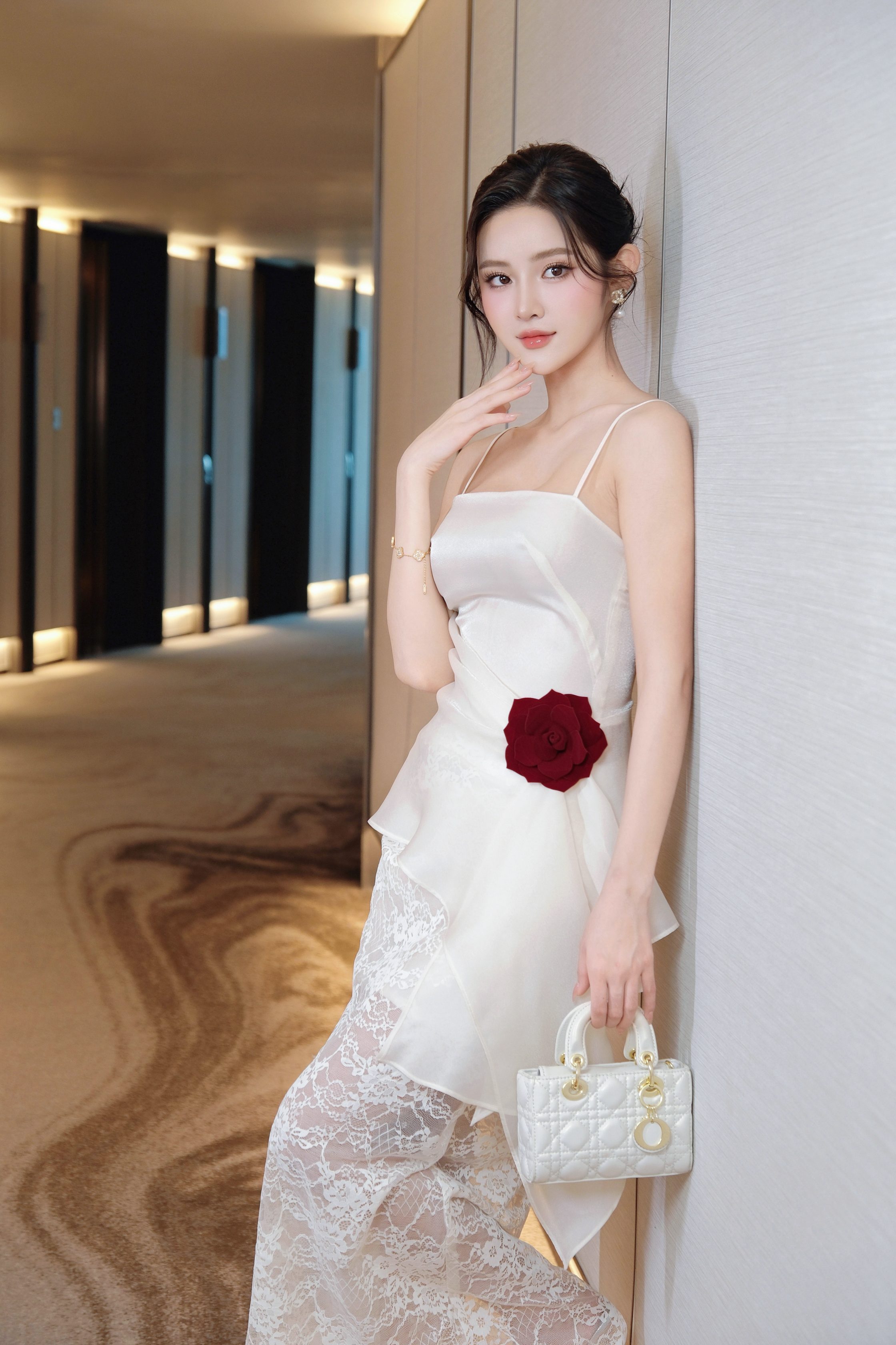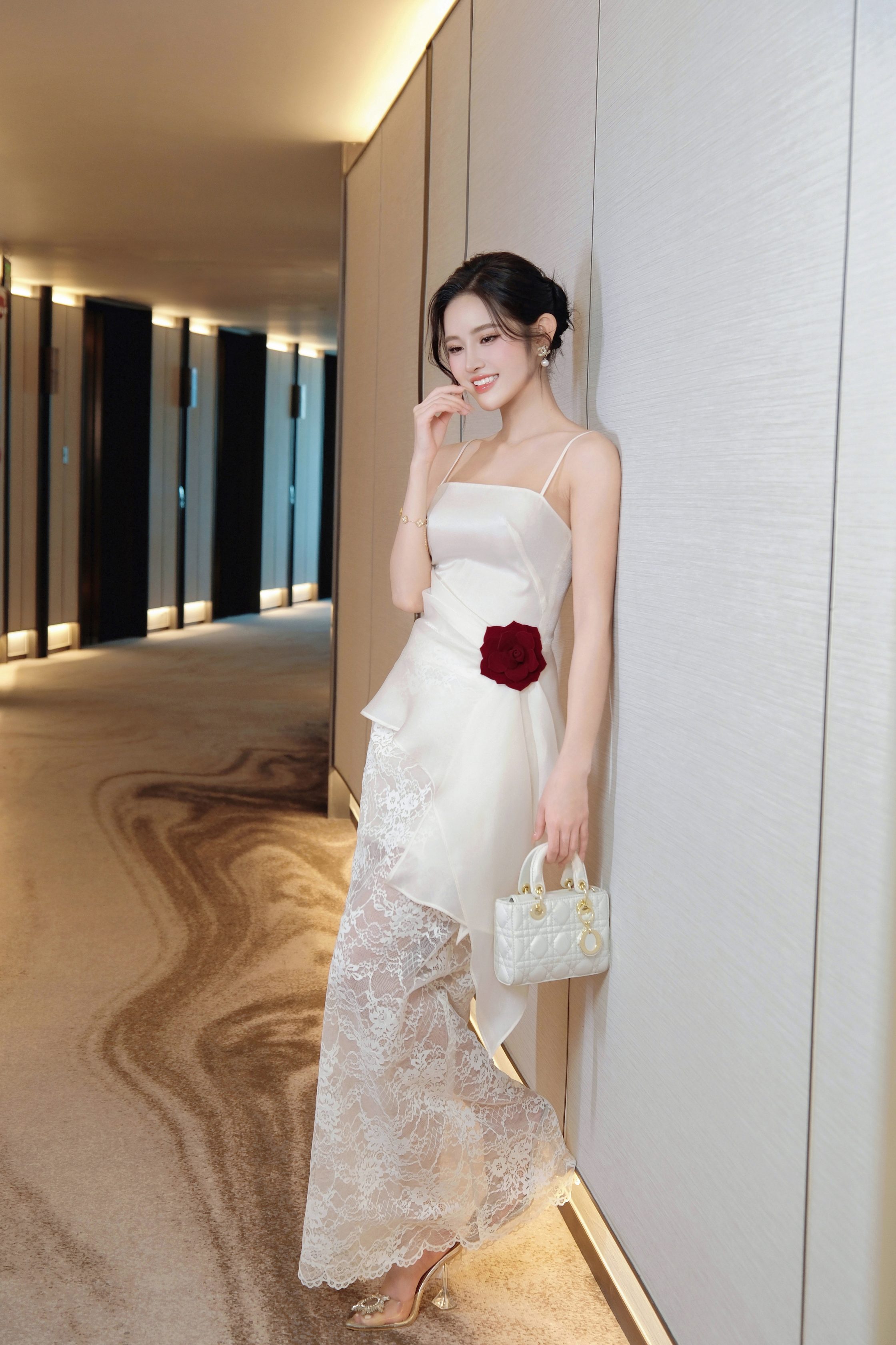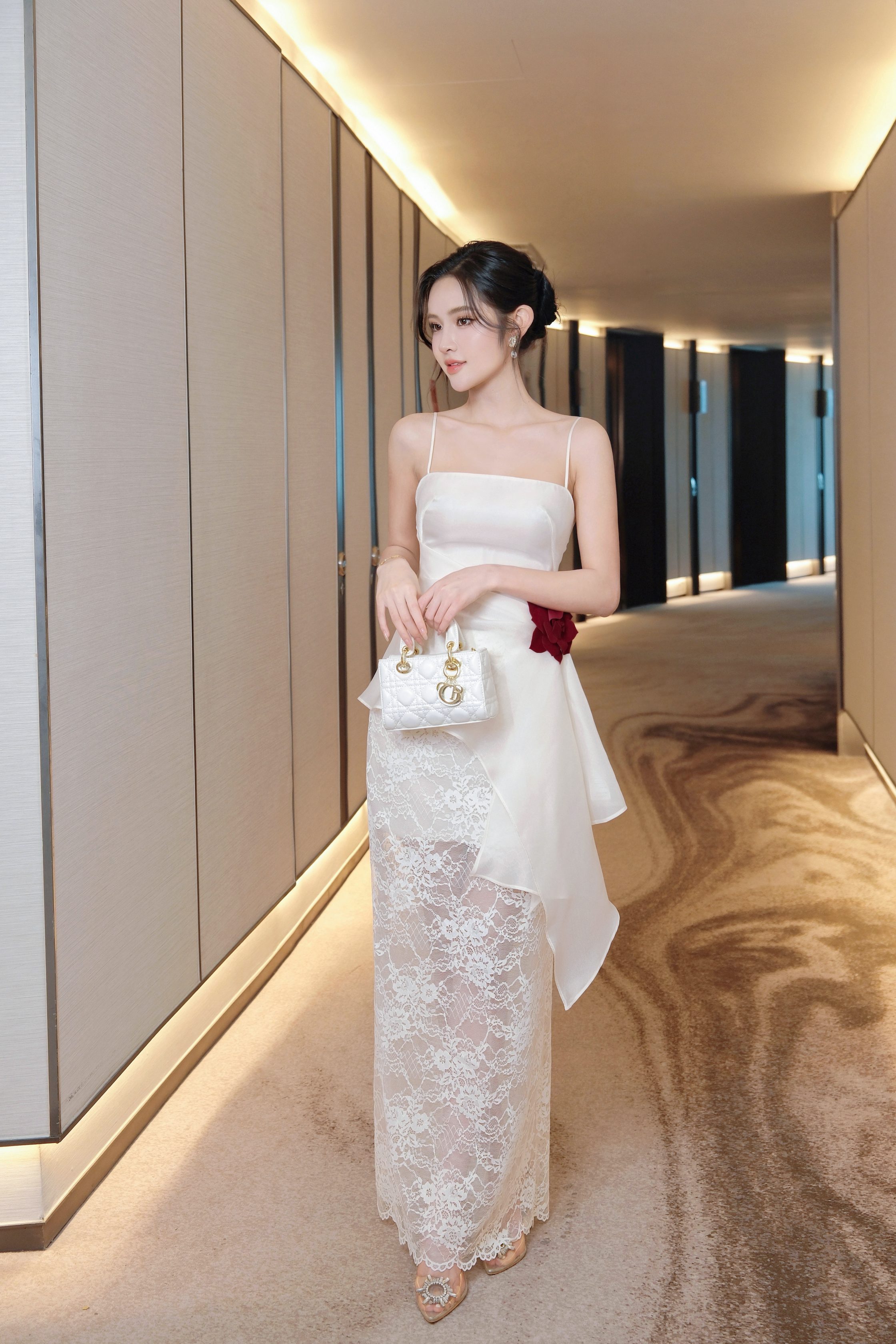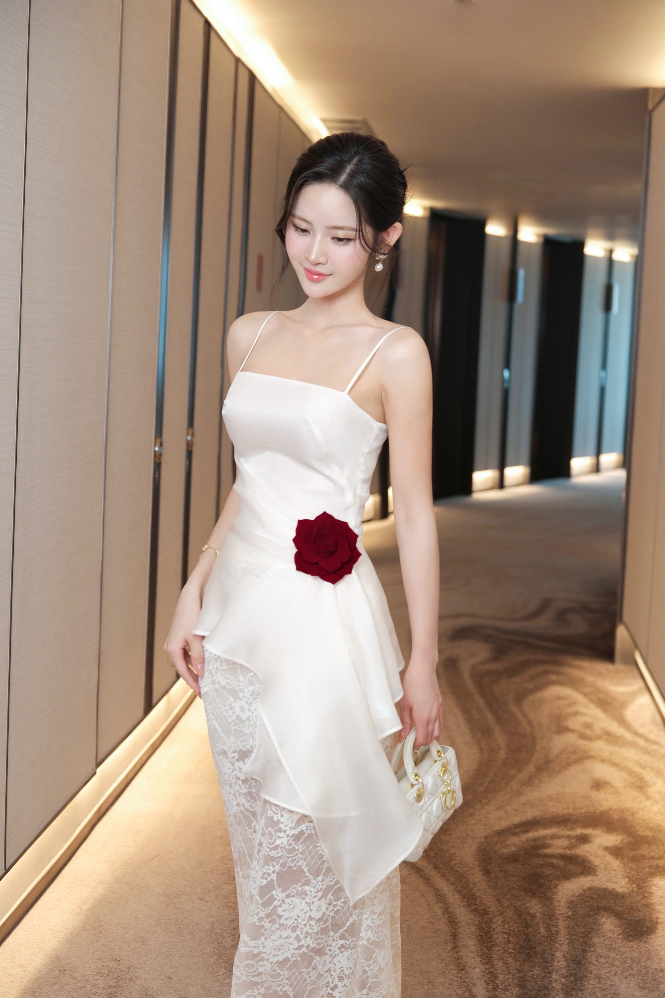 Chi tiết vạt lượn chéo xếp khéo ở hông, tạo hiệu ứng thon gọn và tôn dáng tối đa, điểm xuyết thêm hoa đỏ tại eo – điểm nhấn đầy nghệ thuật, khiến tổng thể thêm phần ấn tượng.