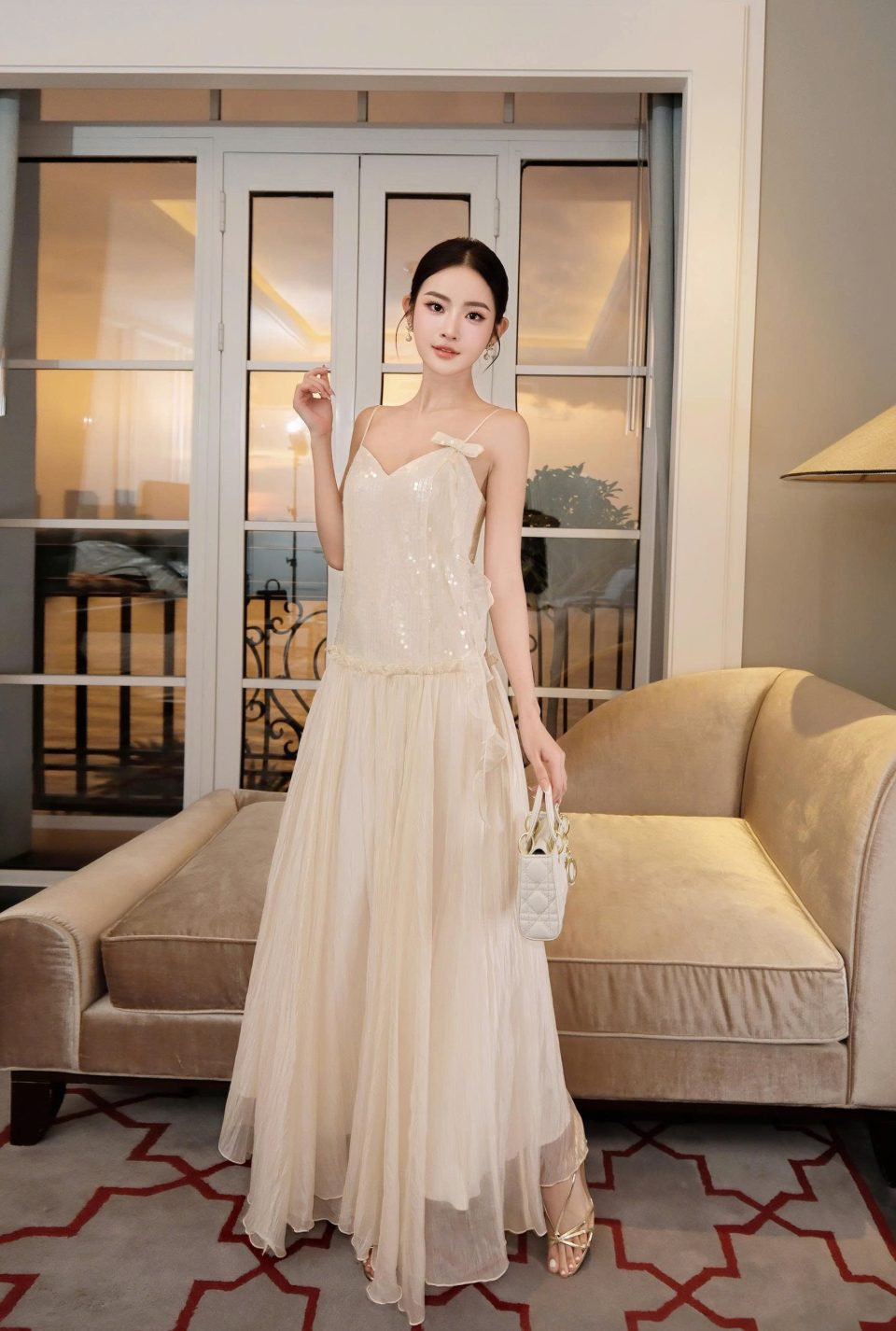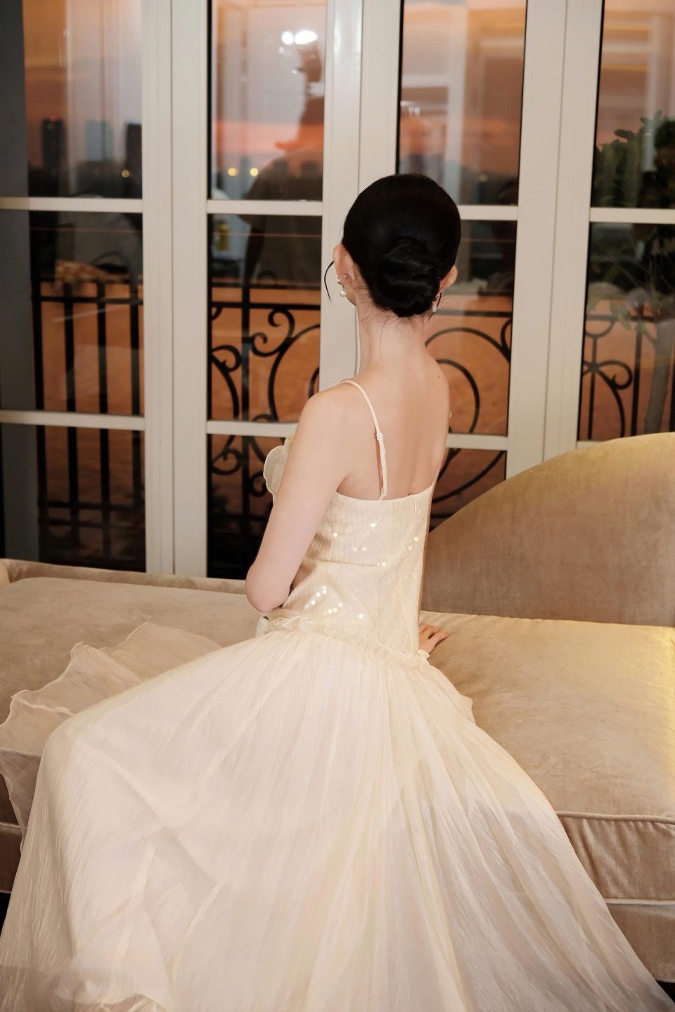 Phần thân đầm được xử lý xếp tầng bèo nhún nhỏ tinh xảo, tạo độ phồng mềm mại và bồng bềnh, mang lại cảm giác nhẹ nhàng nhưng vẫn cực kỳ cuốn hút.