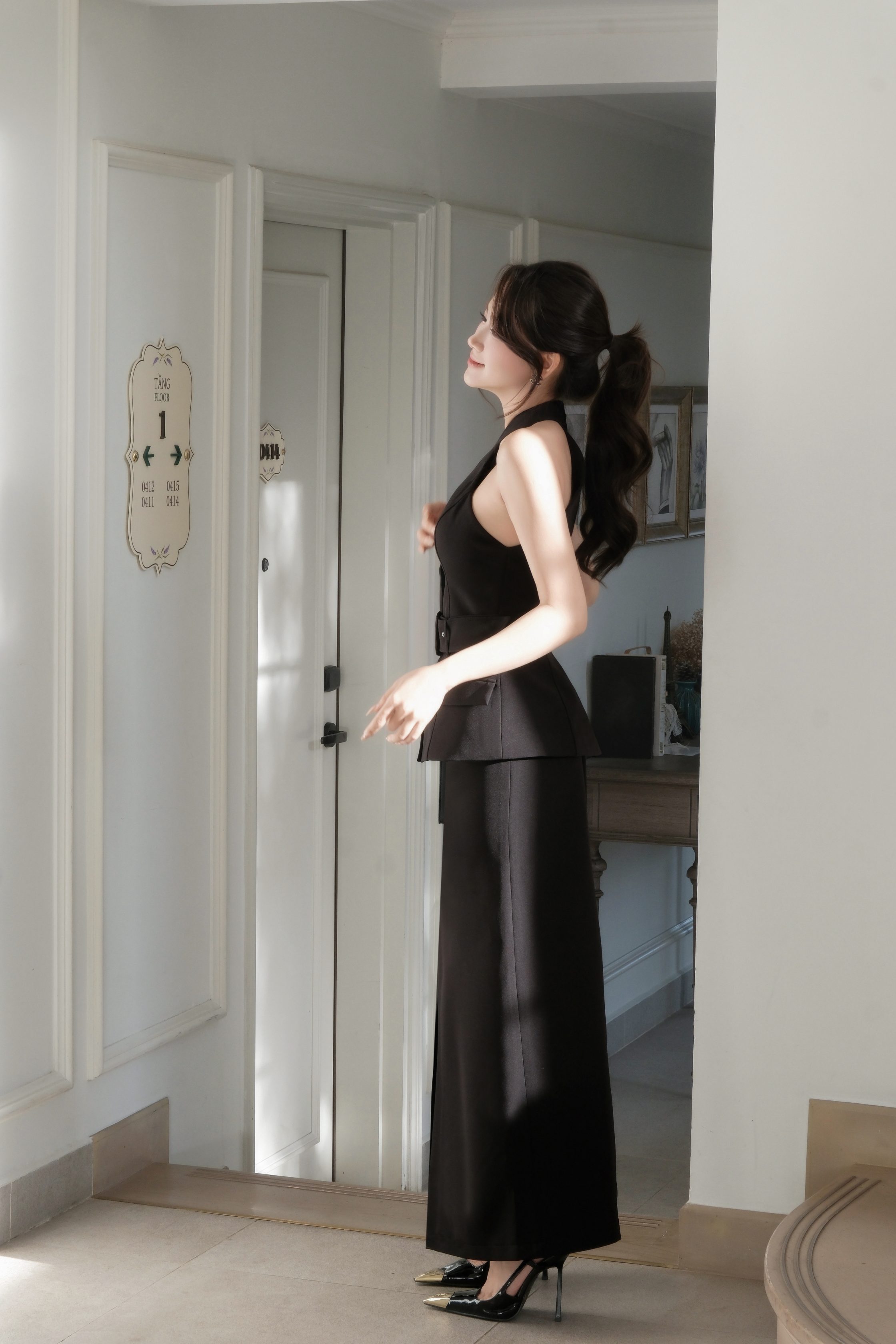 Phần áo peplum cổ yếm đắp chéo được xử lý tinh tế, tạo hiệu ứng thon gọn phần thân trên và tôn lên bờ vai thanh thoát. Thiết kế đi kèm belt rời chiết eo rõ ràng, giúp định hình vòng eo V2 gọn gàng và tạo tỷ lệ cơ thể cân đối. Chi tiết nút cài ngọc trai sau gáy kết hợp khóa kéo phía sau vừa tiện lợi vừa tăng nét sang trọng cho tổng thể. Hai túi giả phía trước được bố trí khéo léo, mang lại cảm giác hiện đại, chỉn chu và chuyên nghiệp.