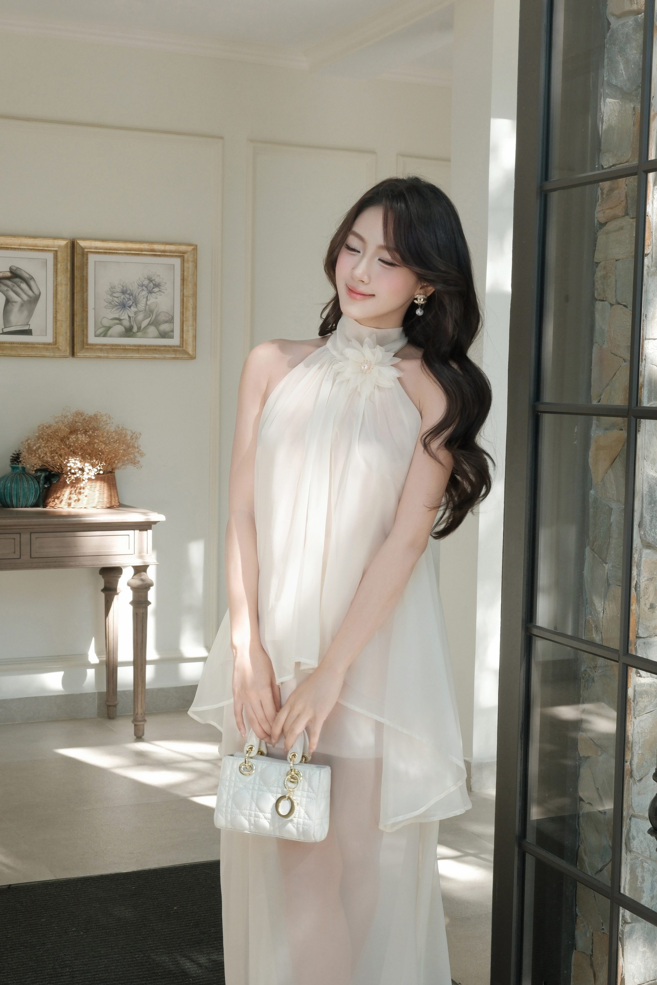 Phần áo cổ yếm giúp khoe trọn bờ vai thanh mảnh, tạo cảm giác nữ tính và thanh thoát. Thiết kế buộc nơ sau gáy tăng nét dịu dàng, đồng thời giúp điều chỉnh độ ôm phù hợp. Phần cổ được xử lý nhún nhẹ kết hợp đính hoa vải mềm, tạo điểm nhấn tinh tế mà không quá cầu kỳ, giữ trọn vẻ đẹp nhẹ nhàng đặc trưng.