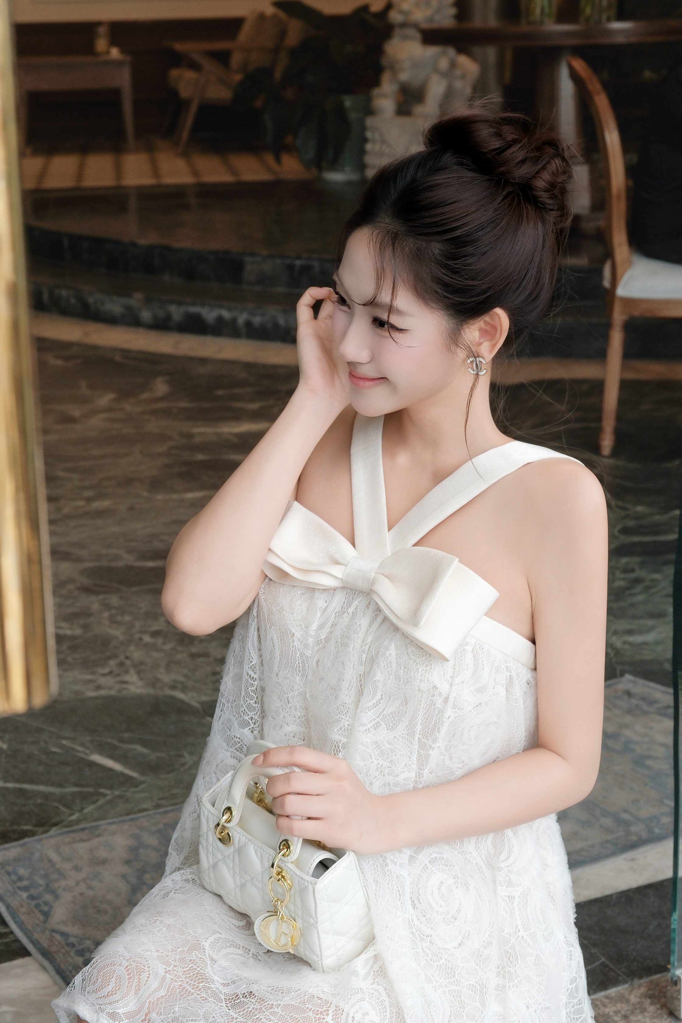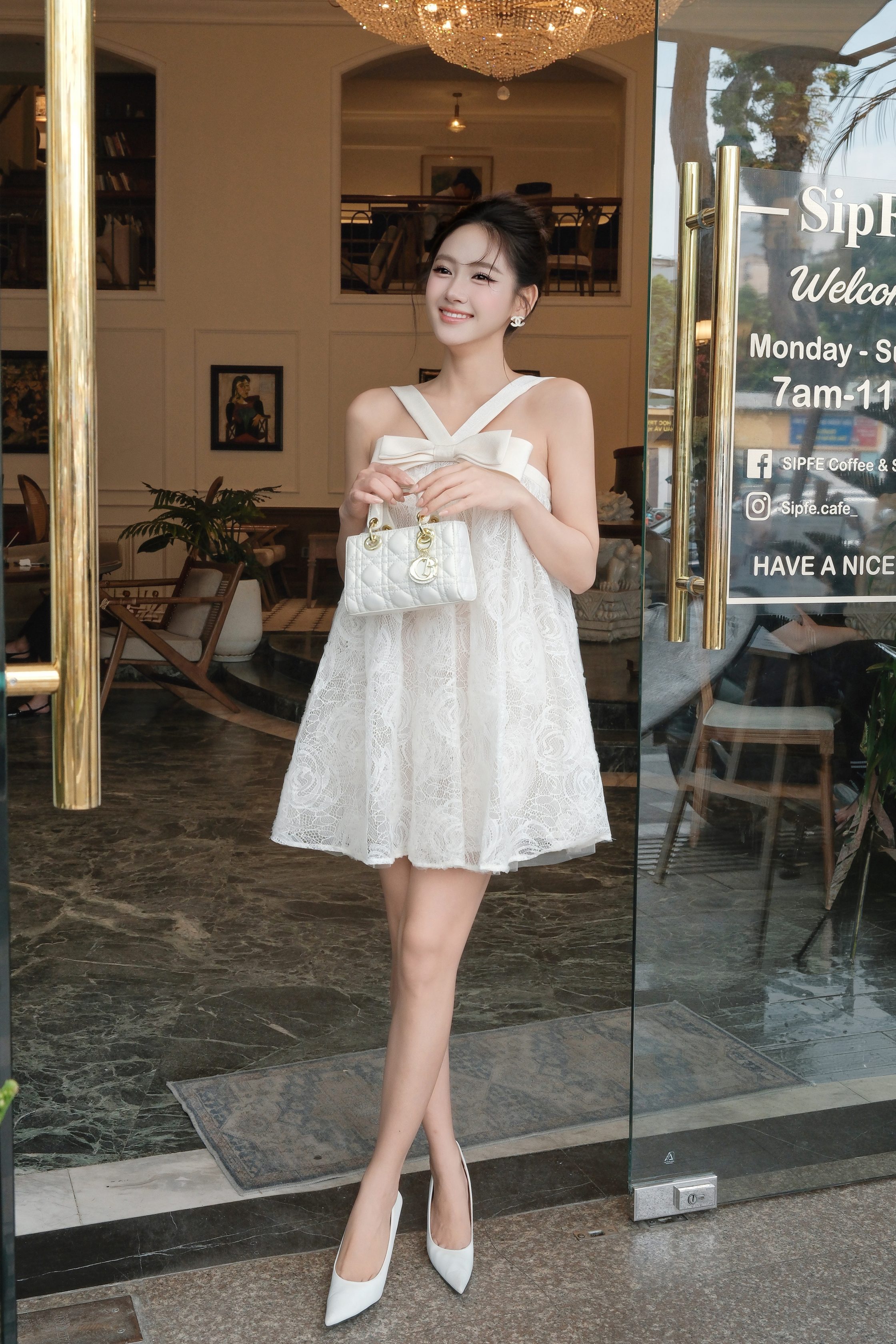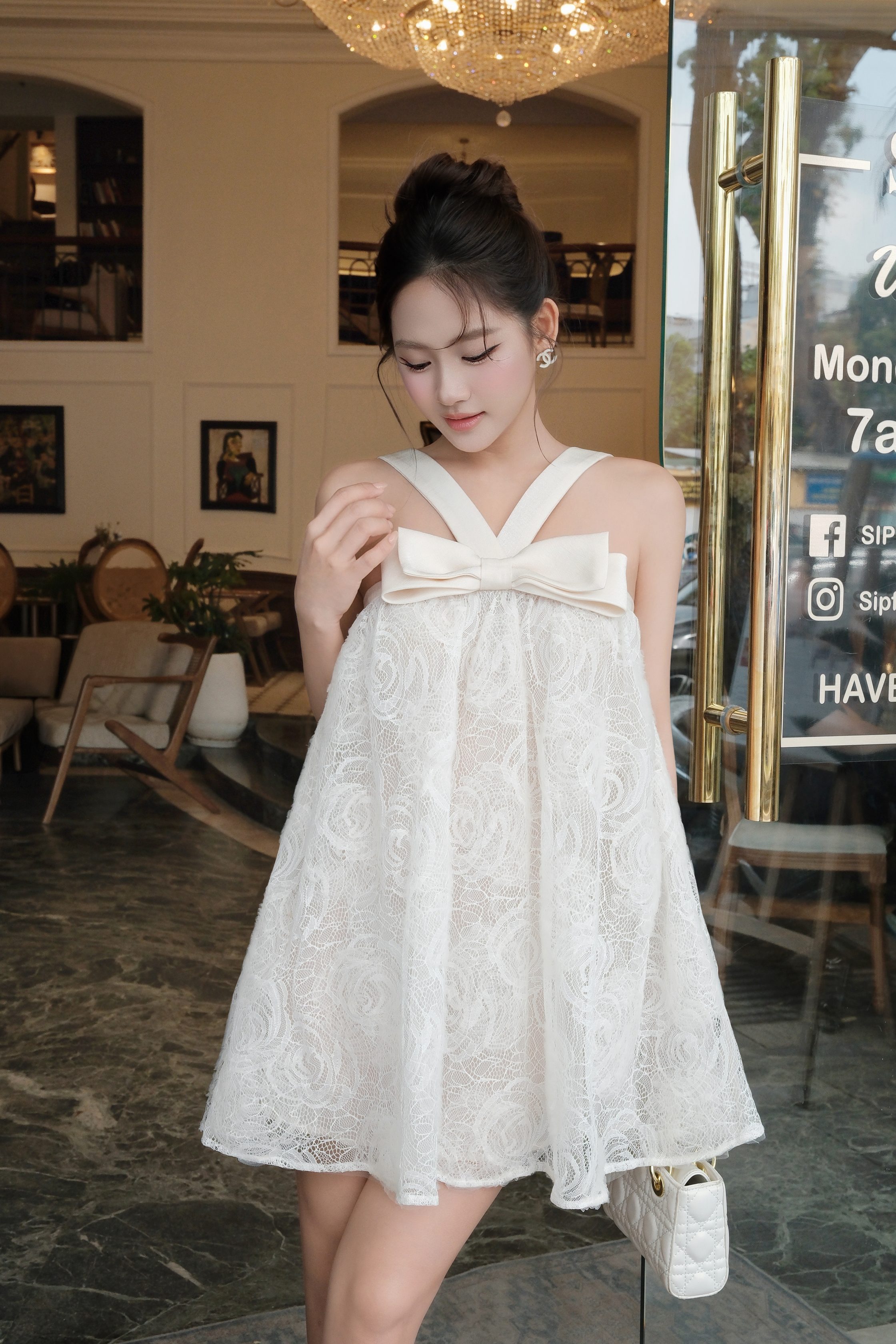 Đánh giá KS558 – Set đầm ren hoa kem cổ yếm nơ lớn ngọt ngào sang trọng | Khiết