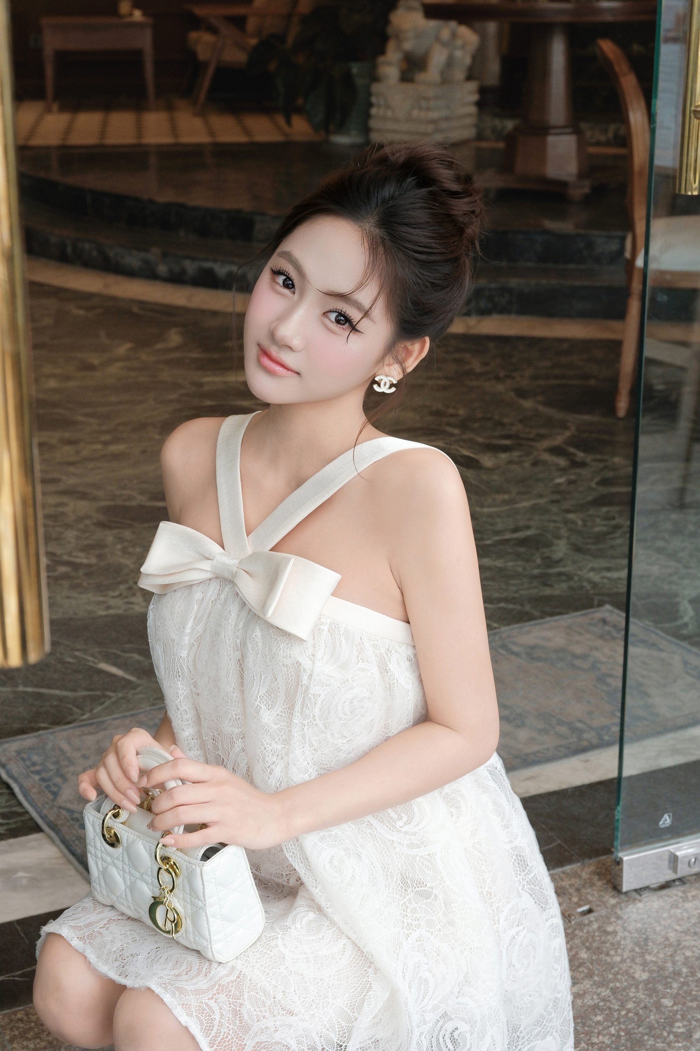 Thiết kế cổ yếm thanh lịch, giúp tôn bờ vai và phần cổ thanh thoát. Điểm nhấn nổi bật là chiếc nơ lớn phía trước, tạo hiệu ứng mềm mại, tăng độ nữ tính và khiến tổng thể trở nên nổi bật mà không cần quá nhiều phụ kiện.