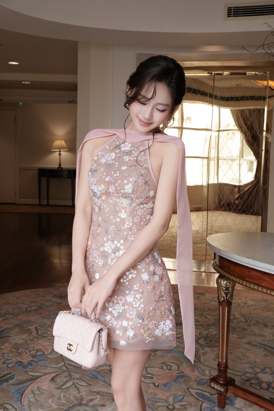 ✔️ Thiết kế: Mini dress cổ yếm cột nơ sau lưng, thân trên ôm dáng, tùng váy bồng xòe nhiều lớp, khóa kéo sau, đệm ngực tiện lợi