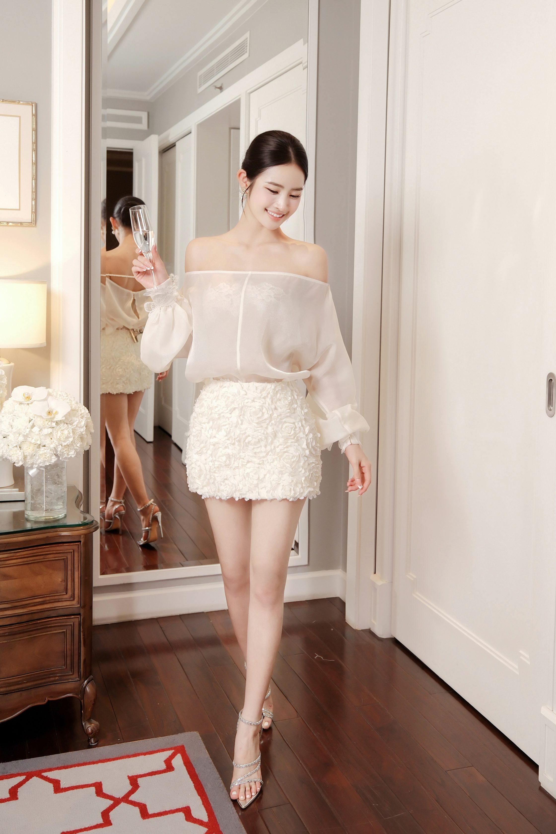 Chân váy ngắn được may bằng vải phủ hoa nổi 3D sắc sảo, mặc trễ nhẹ nhàng tạo hiệu ứng tôn dáng, không hề gây ngắn hay phản cảm. Lót quần lụa bên trong đảm bảo kín đáo và thoải mái khi di chuyển.